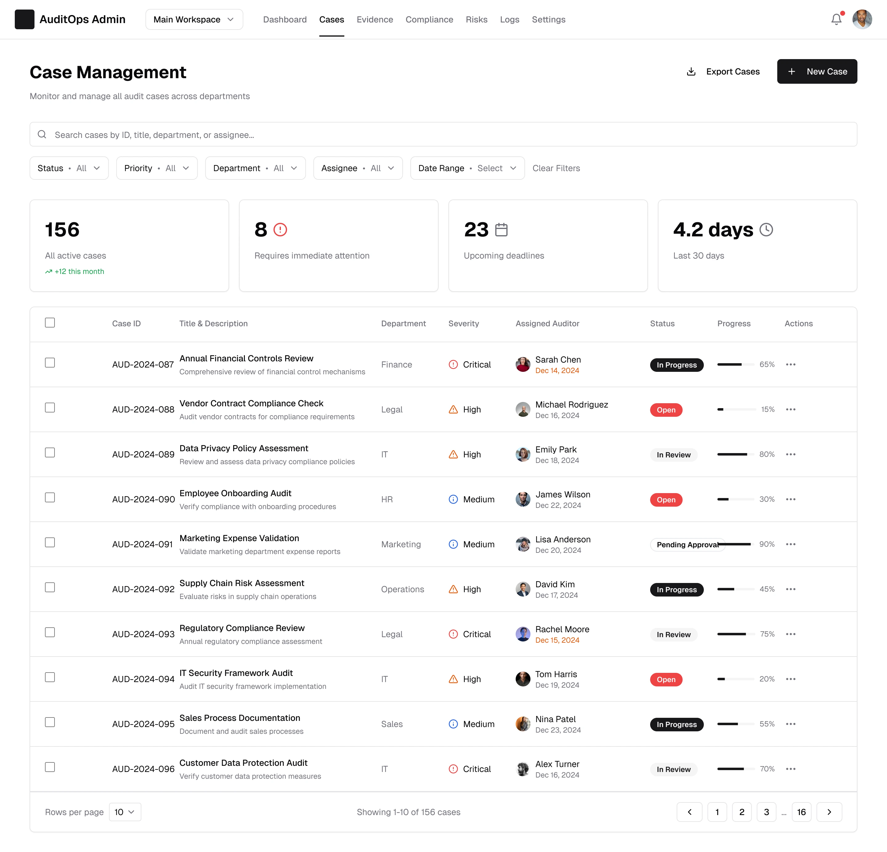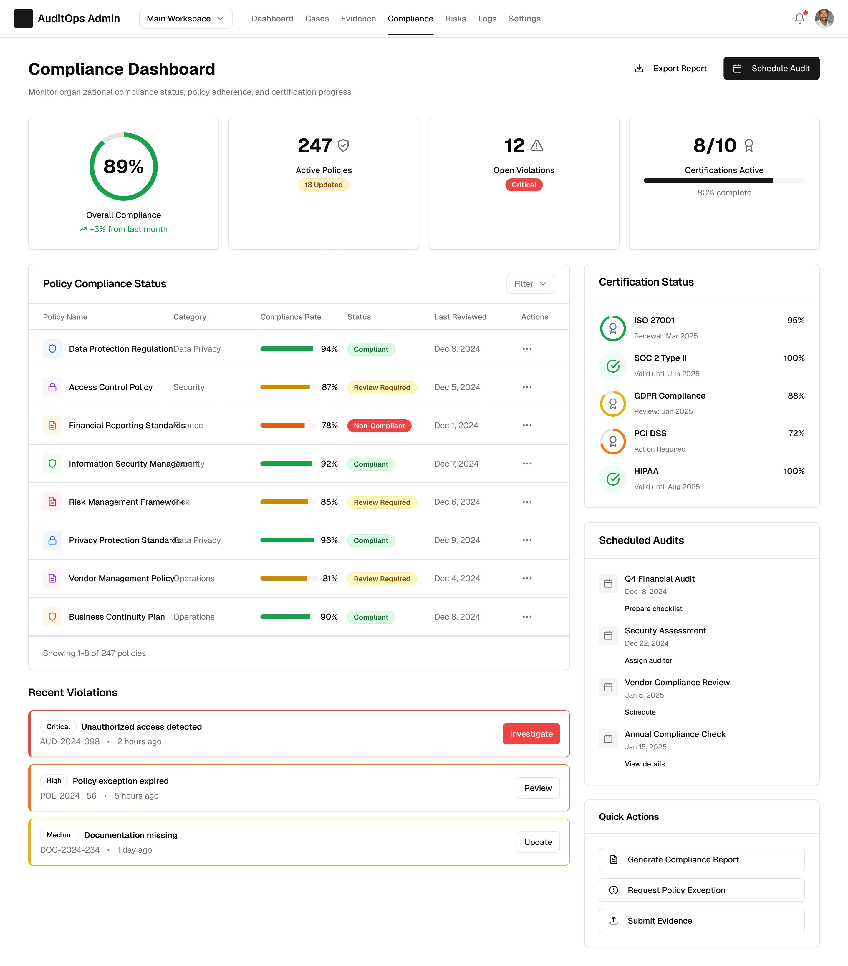 Main content shows audit workload summaries, compliance charts, and open case alerts.