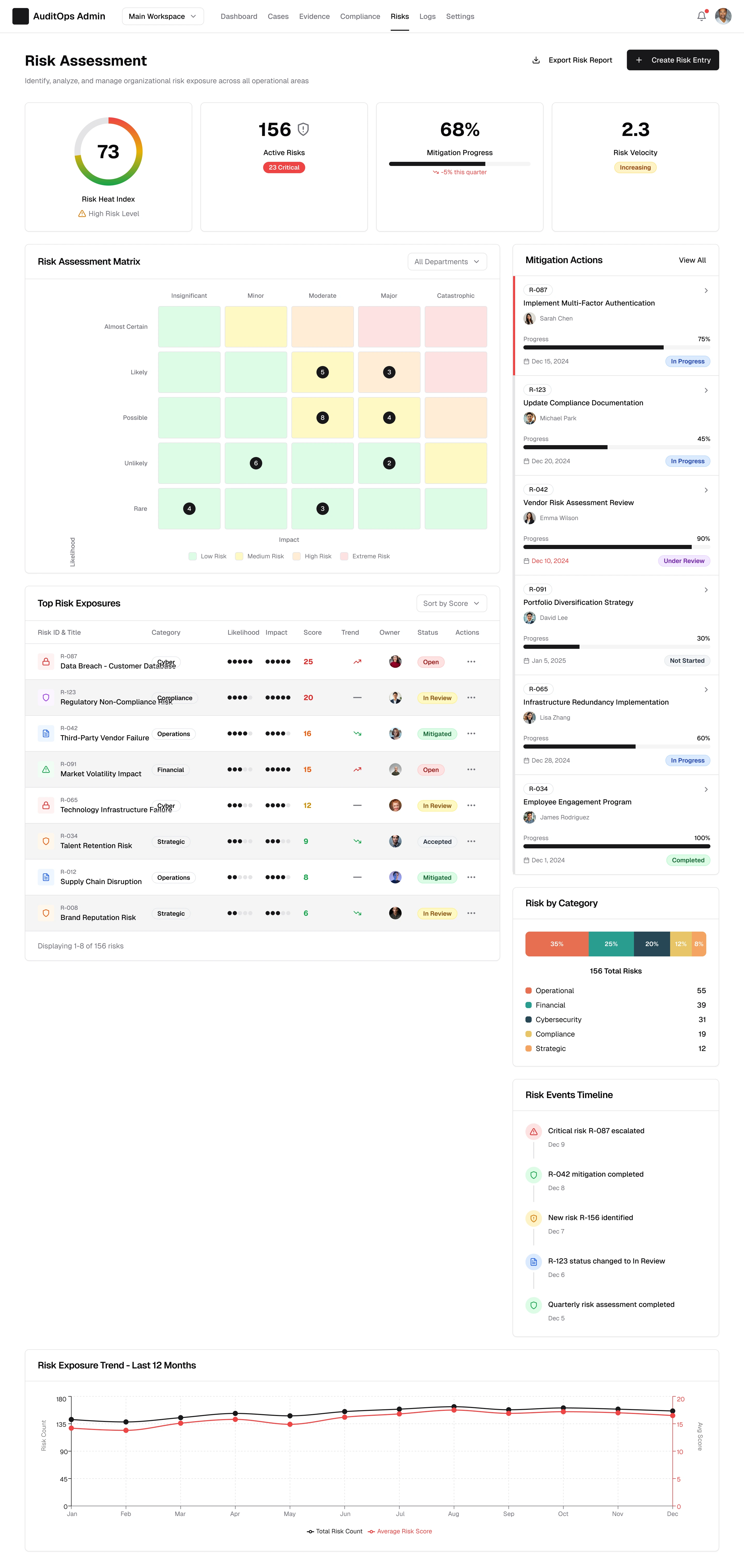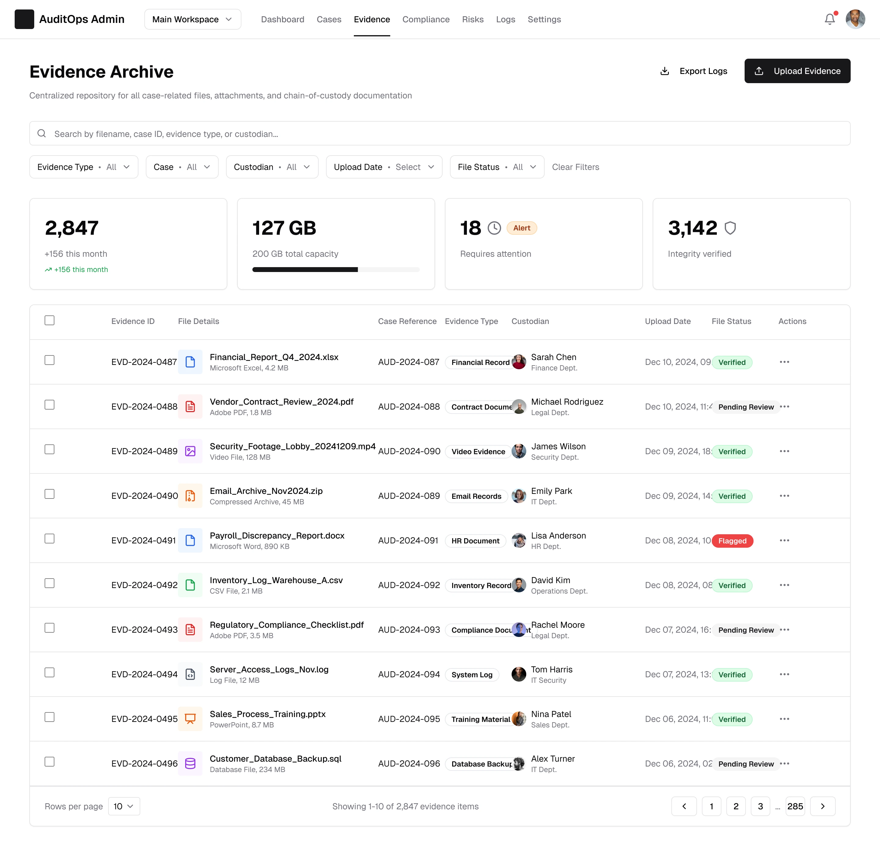 Top navigation bar displays Logo, Workspace switcher, main navigation (Dashboard / Cases / Evidence / Compliance / Risks / Logs / Settings), message alerts, user menu.