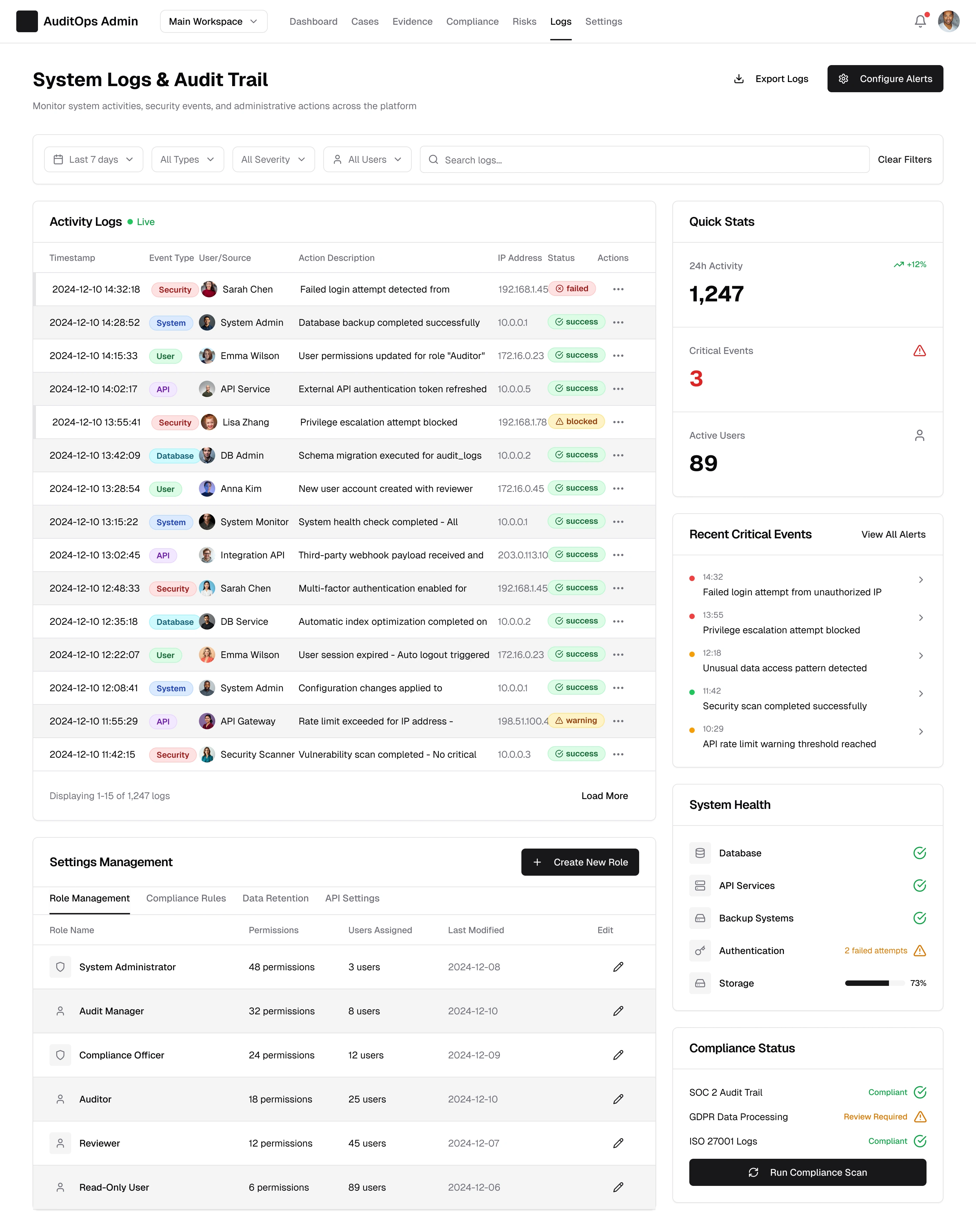 AuditOps Admin is a web-based audit system designed for comprehensive audit and compliance management. This case showcases a complete audit platform with strict black-white theme featuring bold contrasts and structured card spacing, including dashboard overview, case management, evidence archive, compliance dashboard, risk assessment, and system logs and settings pages.