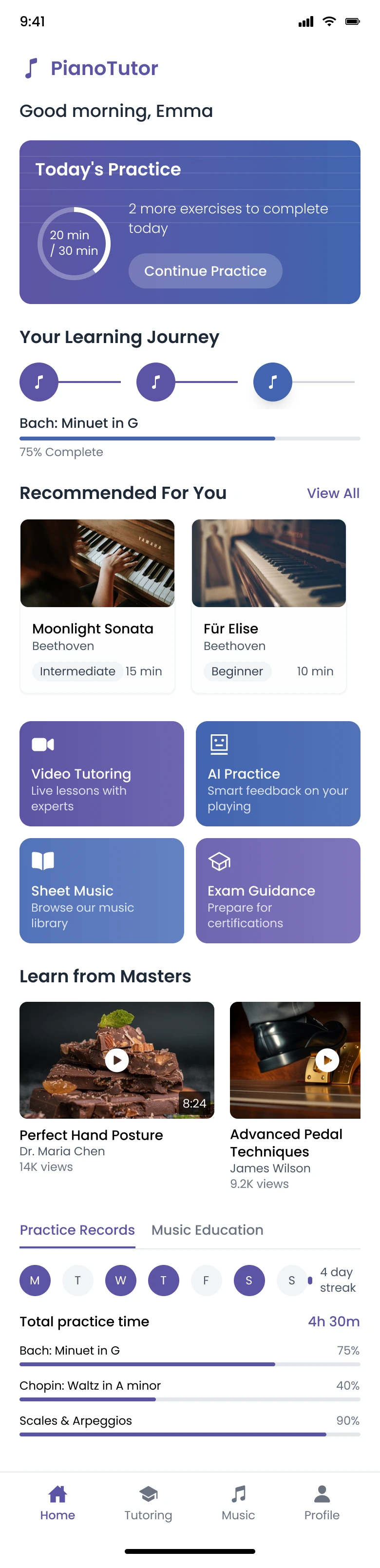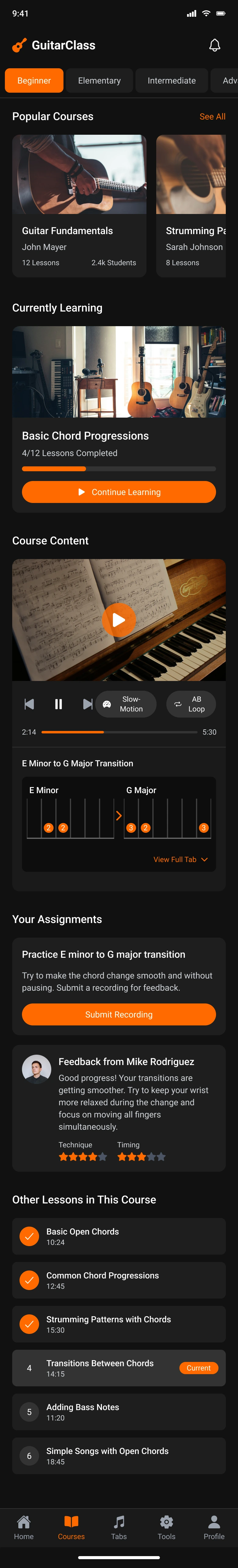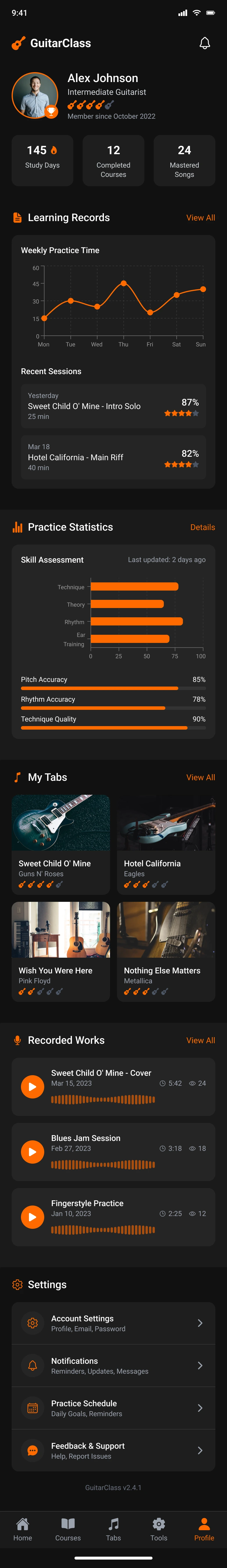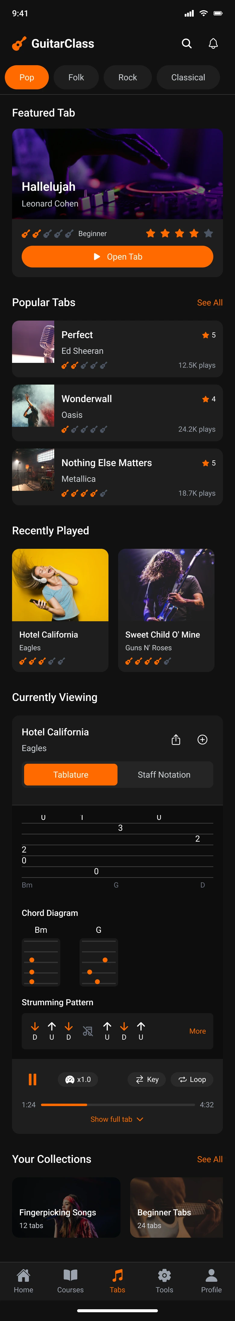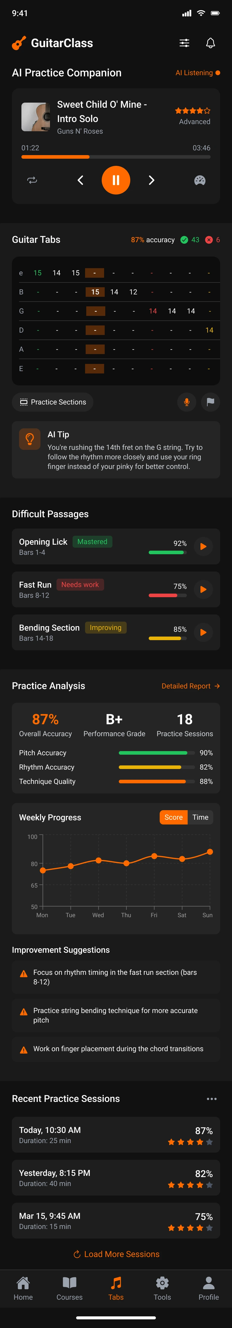 GuitarClass is a guitar learning app designed to help students learn guitar through courses, smart tabs, and AI practice companions. This case showcases a complete music education platform with rock aesthetic, including home page, course learning, smart tab, practice tools, AI practice companion, and profile pages, referencing Fender Play and Yousician.