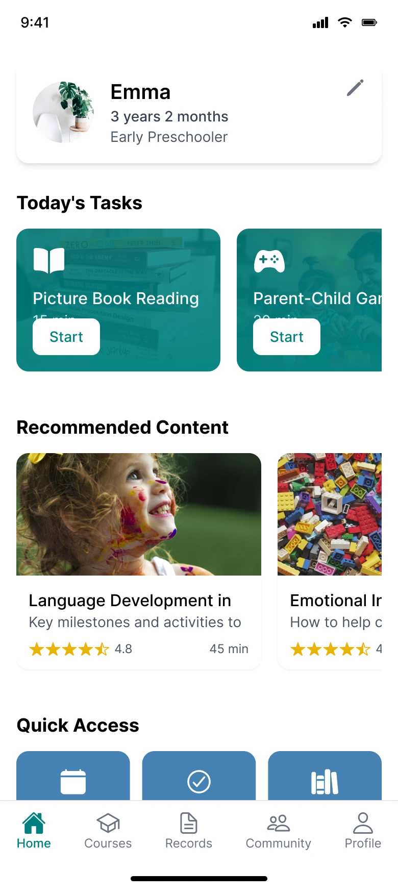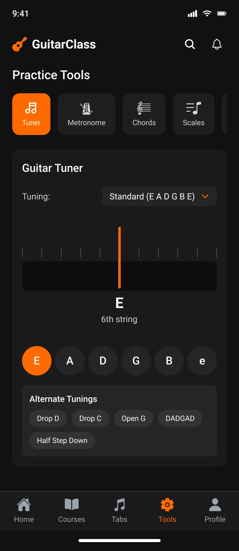 I need a guitar learning app called GuitarClass. Start with the home page: The top displays today's practice tasks and learning progress. Below shows recommended courses, popular tabs, and practice check-ins. Quick access includes Tuner, Metronome, and Chord Library. Displays learning path and upcoming live classes. Bottom nav: Home, Courses, Tabs, Tools, and Profile (current: Home). Visual style: Fender Play/Yousician: Rock aesthetic, chord charts, tab reader, musician-focused