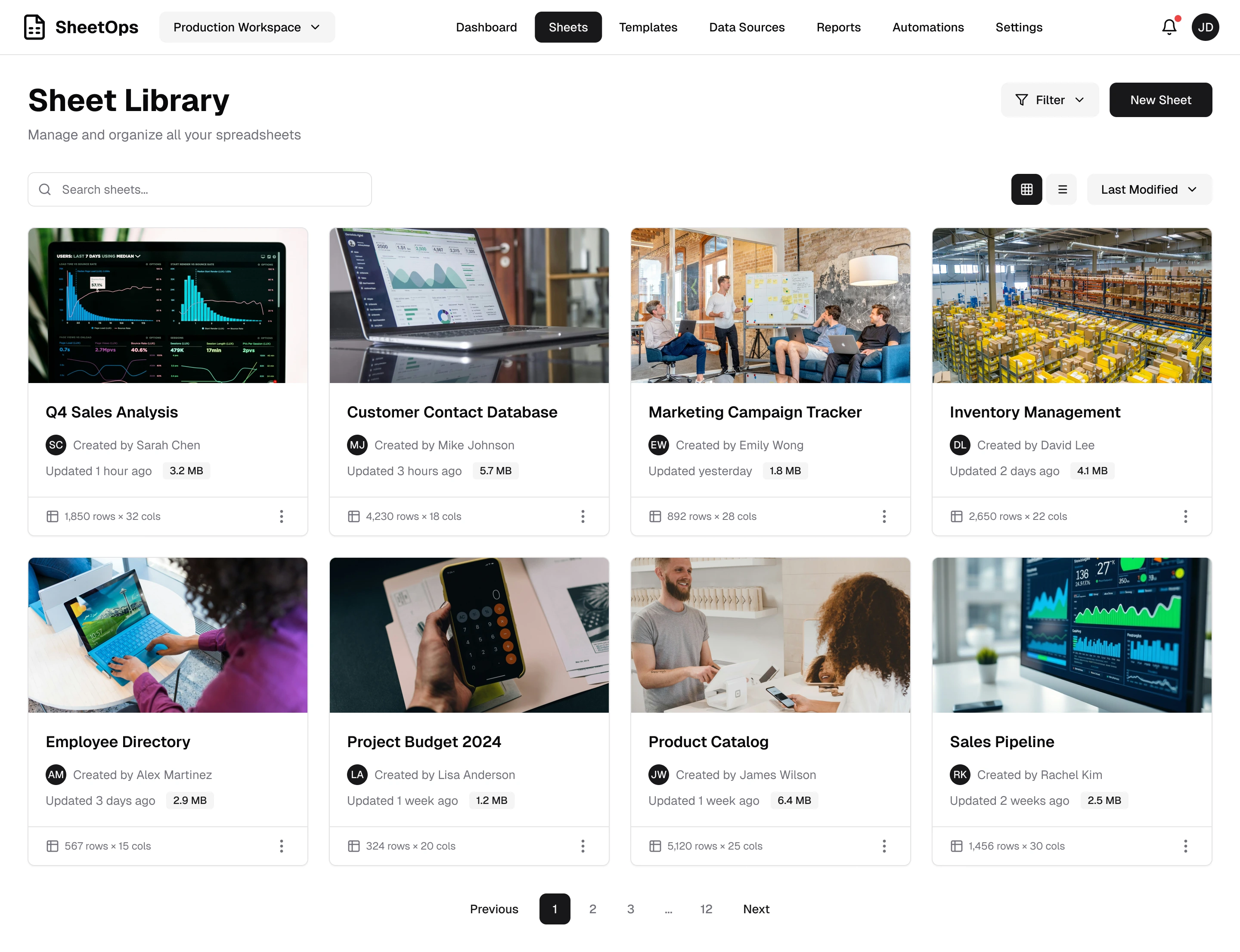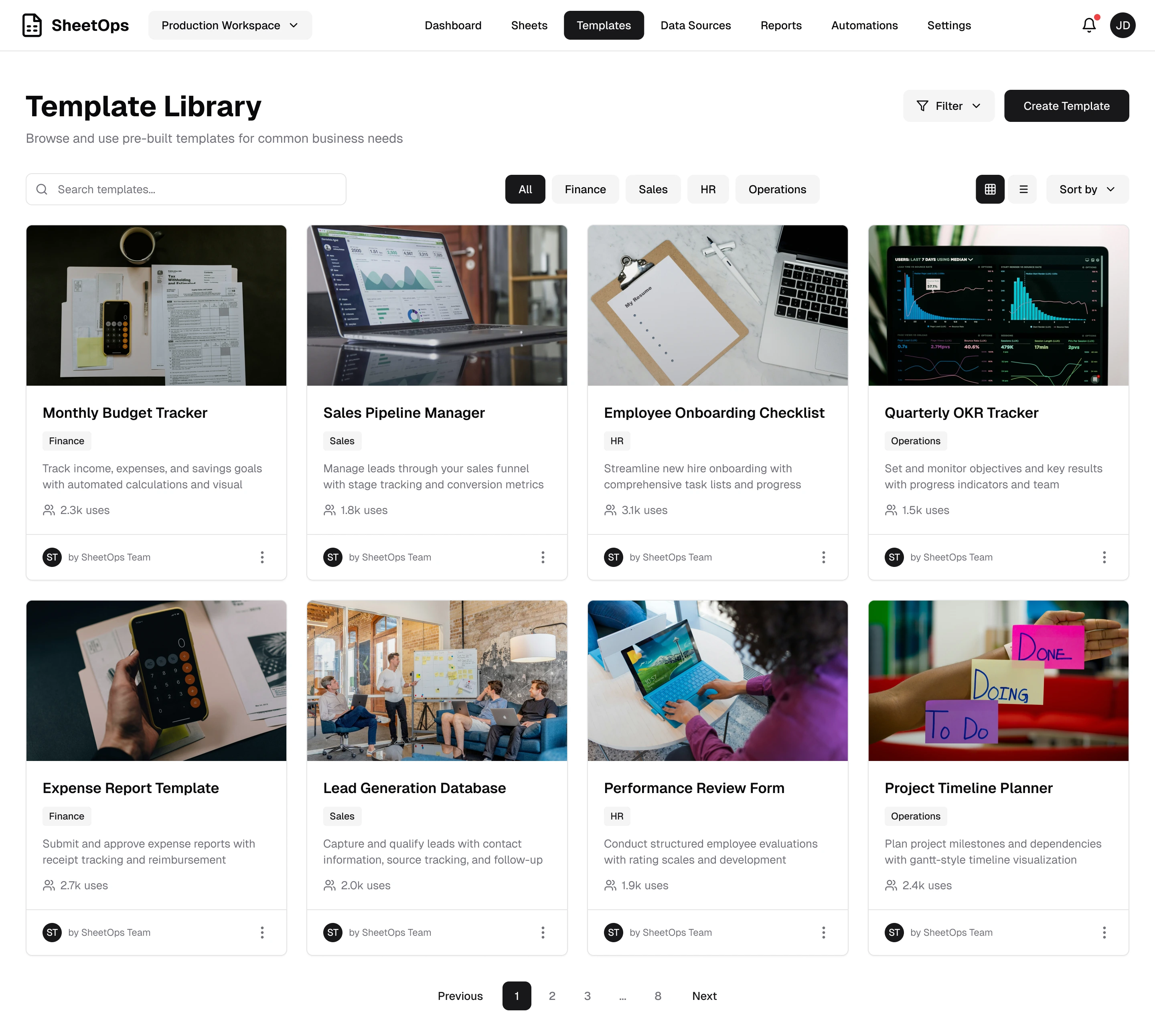 Top navigation bar displays Logo, Workspace switcher, main navigation (Dashboard / Sheets / Templates / Data Sources / Reports / Automations / Settings), message alerts, user menu.