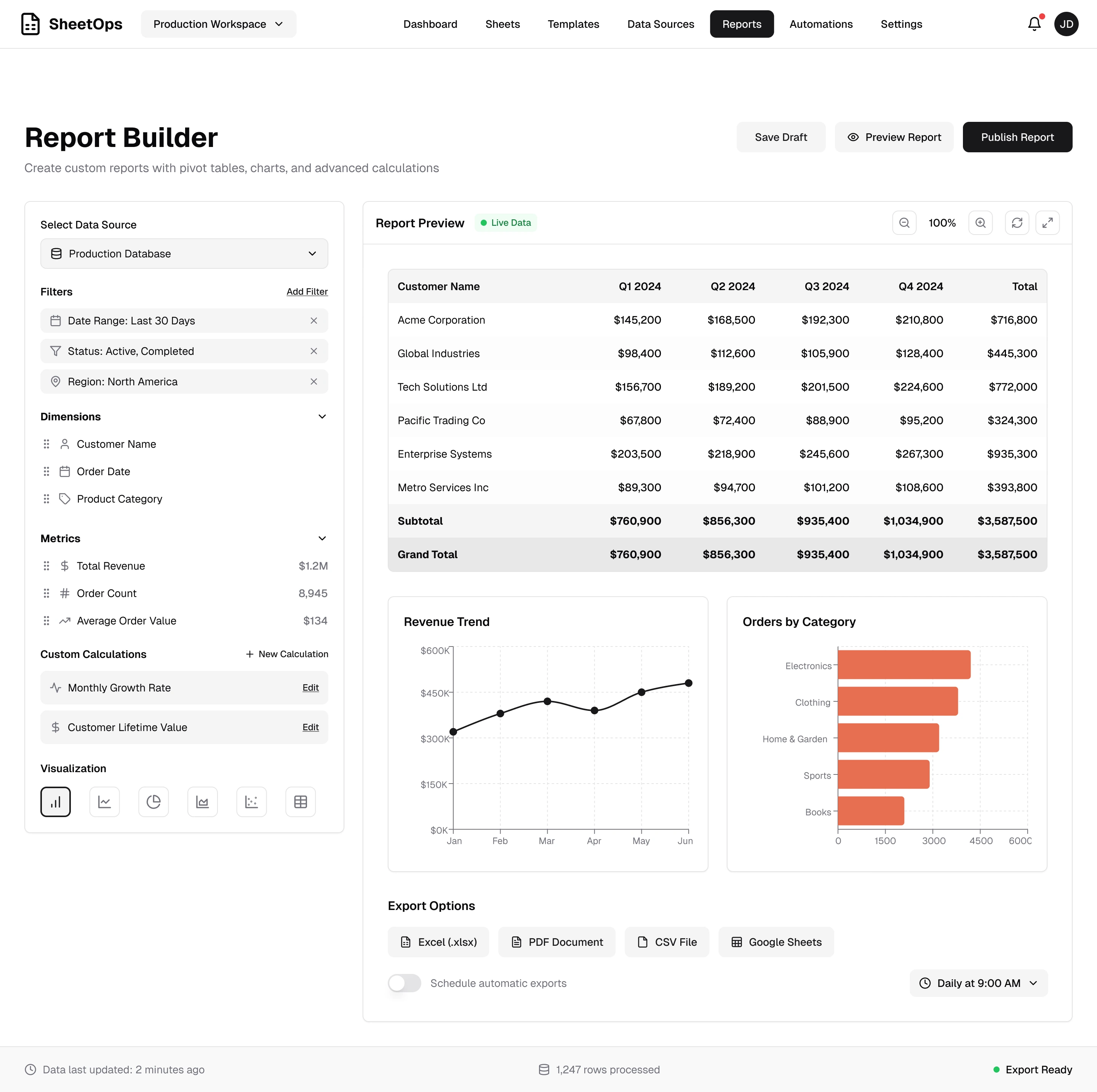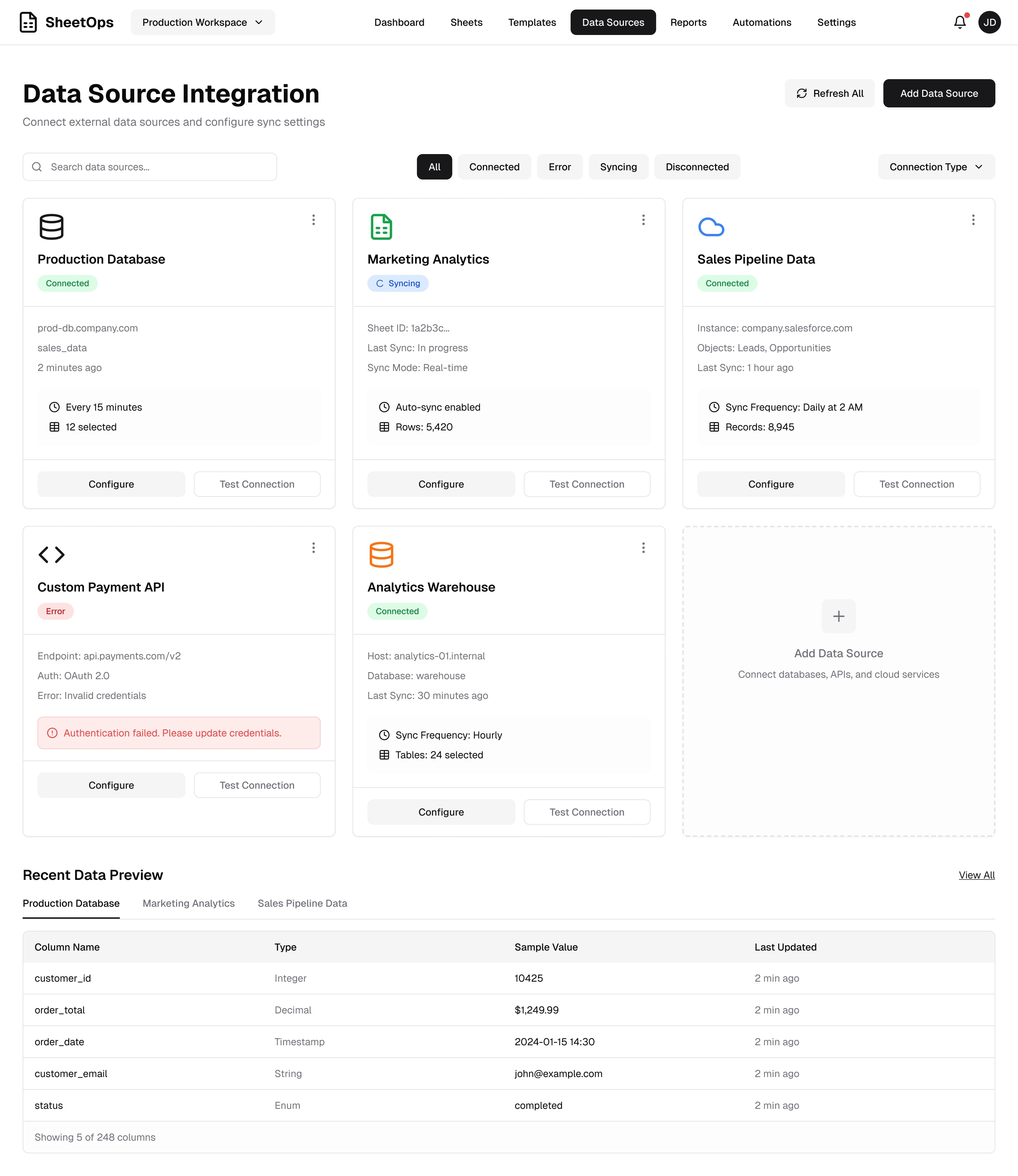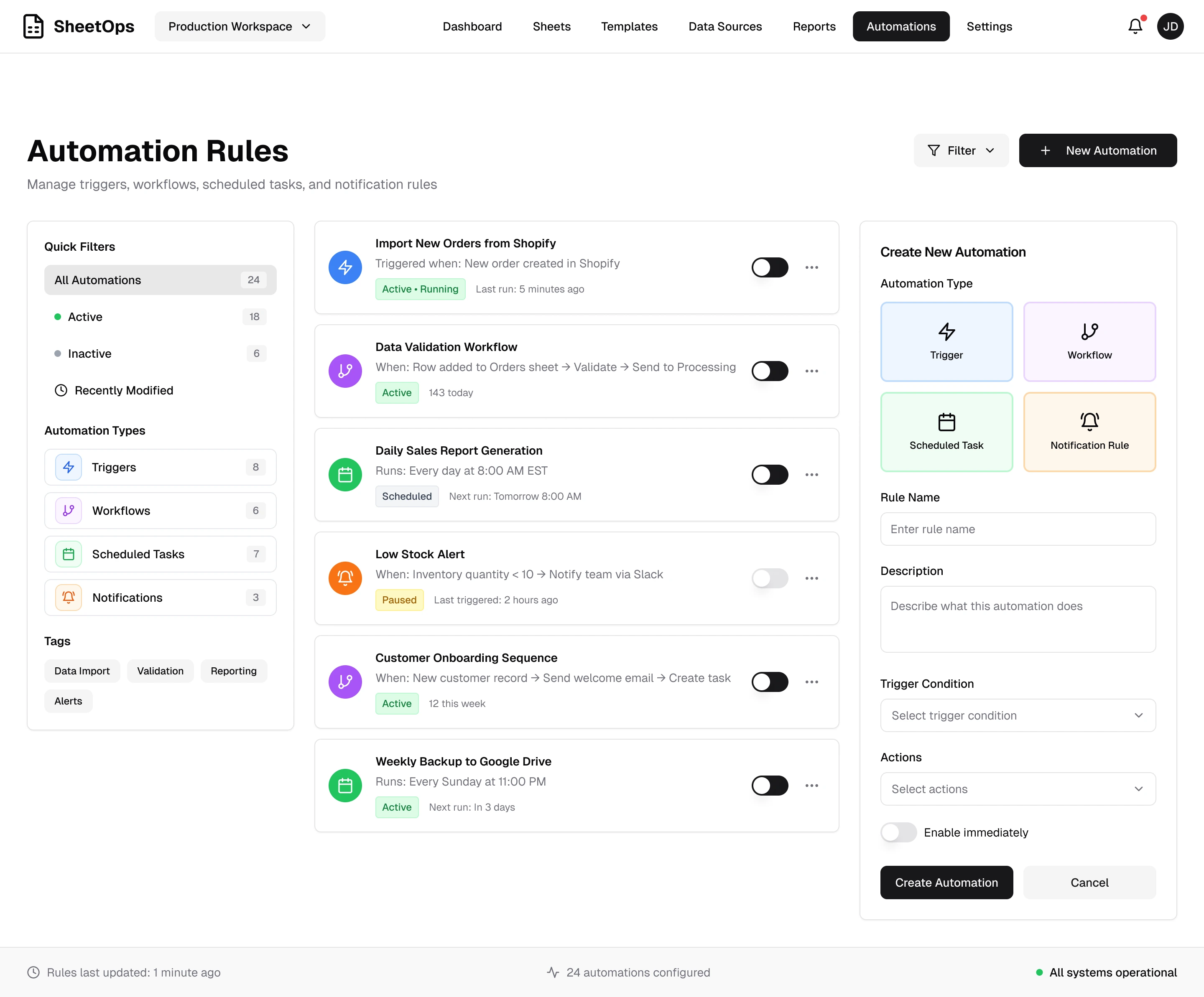 Manage spreadsheets, data sources, and automations