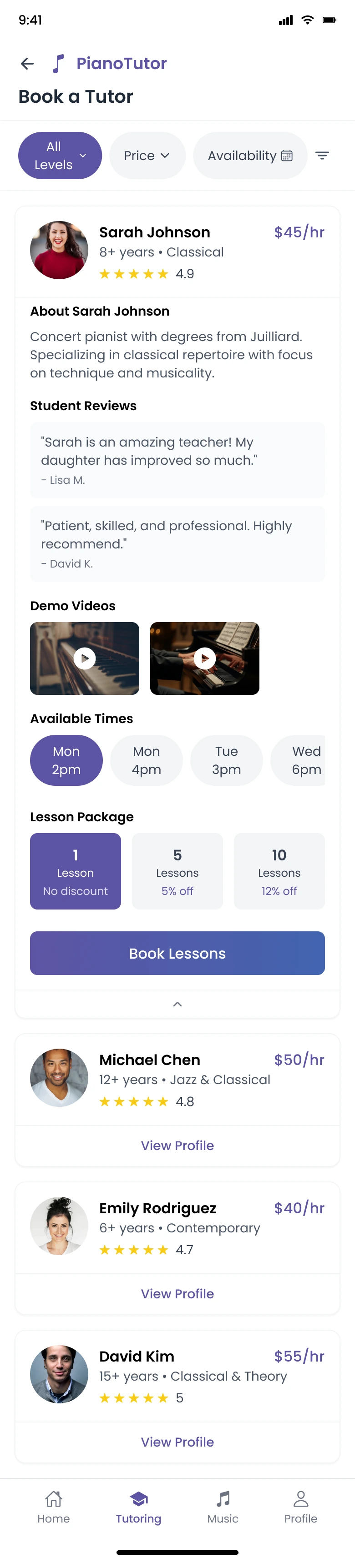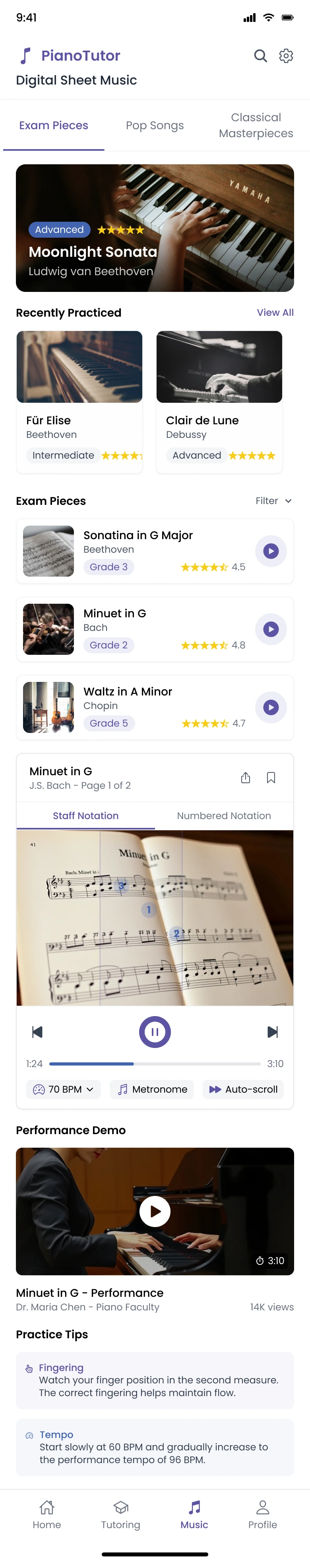 PianoTutor is a piano practice app designed to help students learn piano through video tutoring, AI practice, and digital sheet music. This case showcases a complete music education platform with musical purple-blue theme, including home page, book tutor, video tutoring, AI smart tutoring, digital sheet music, and learning center pages, referencing Simply Piano and Flowkey.