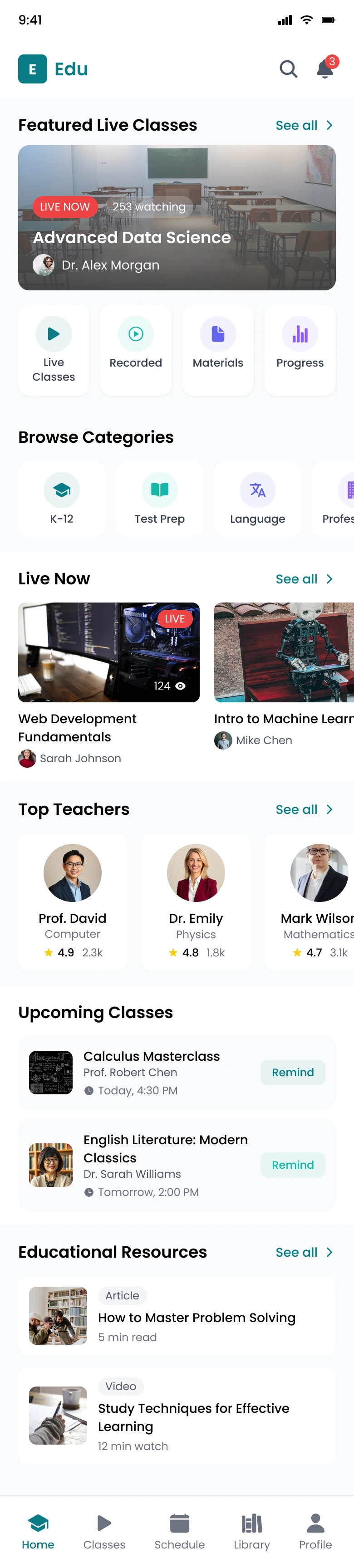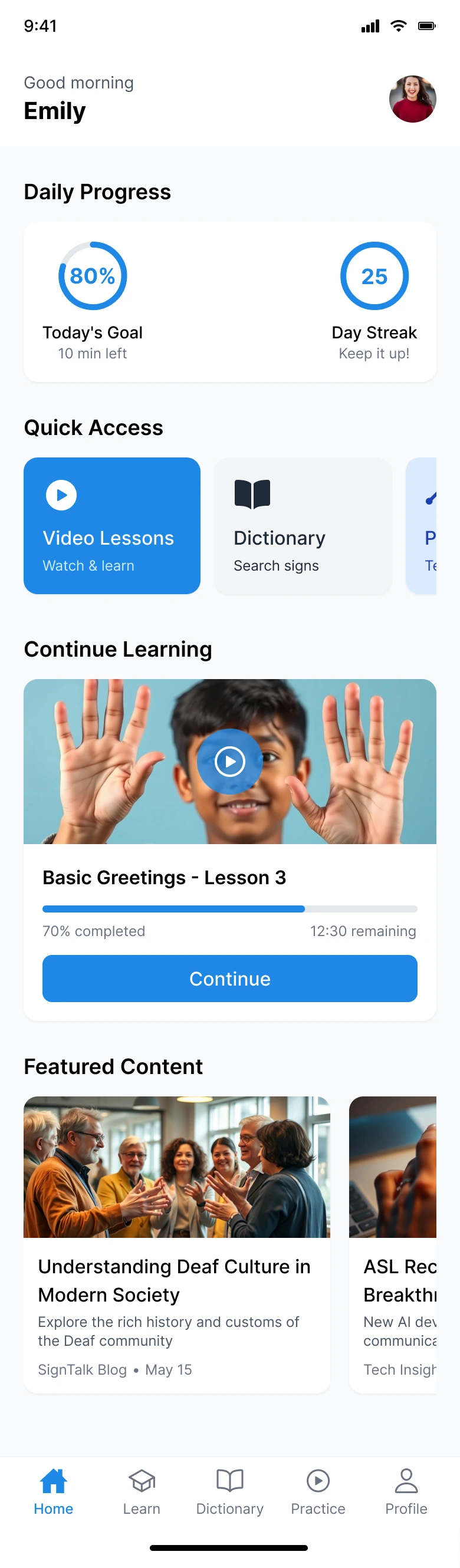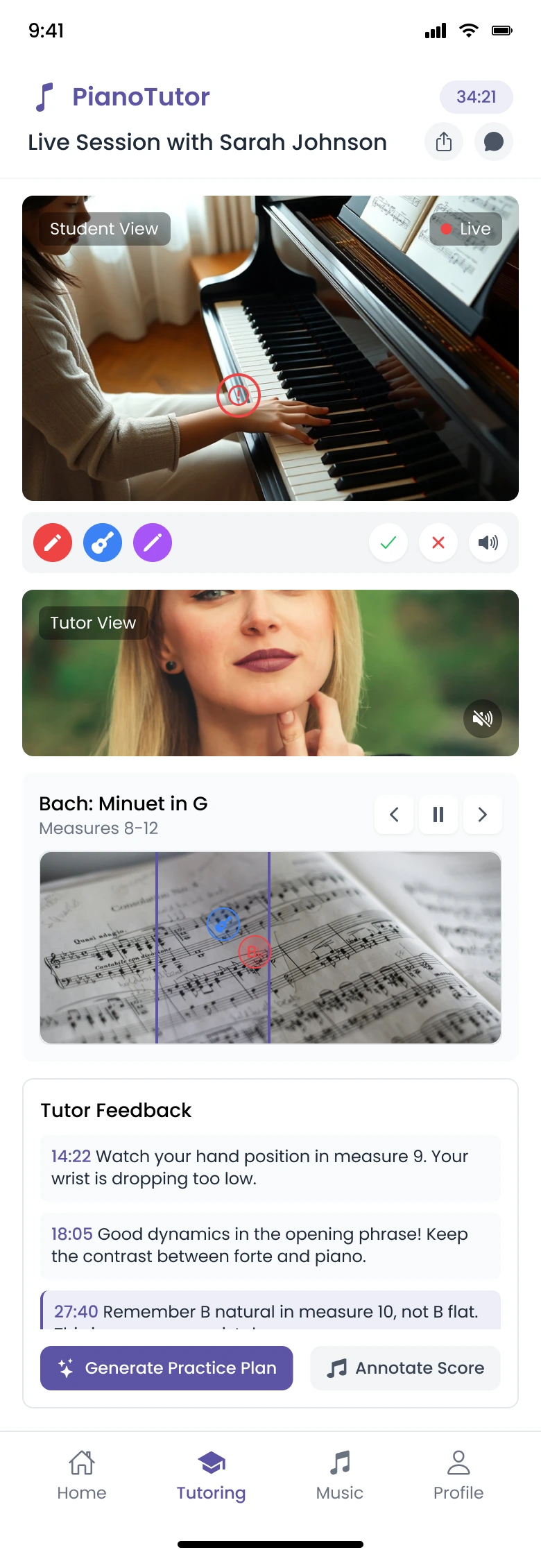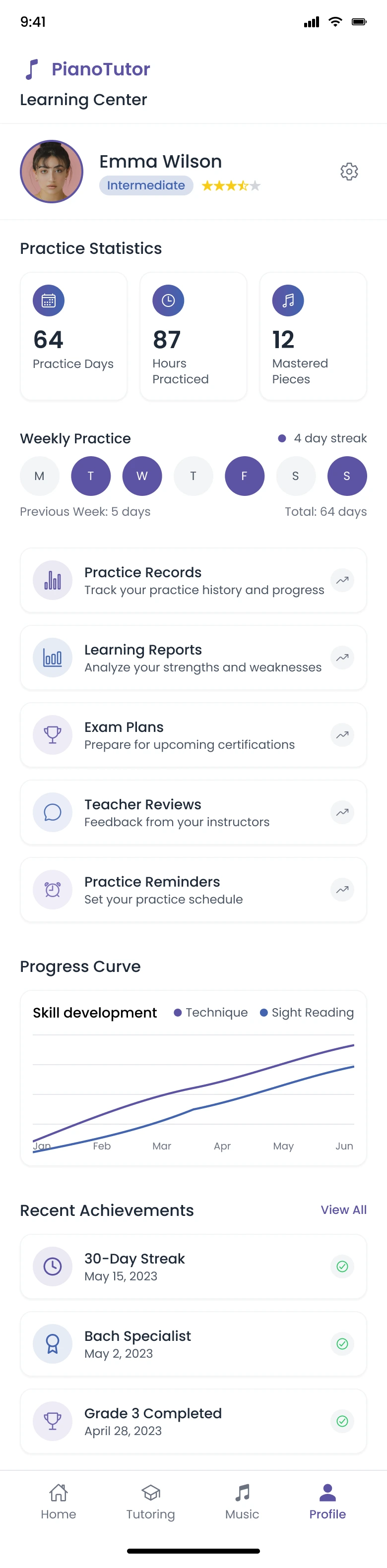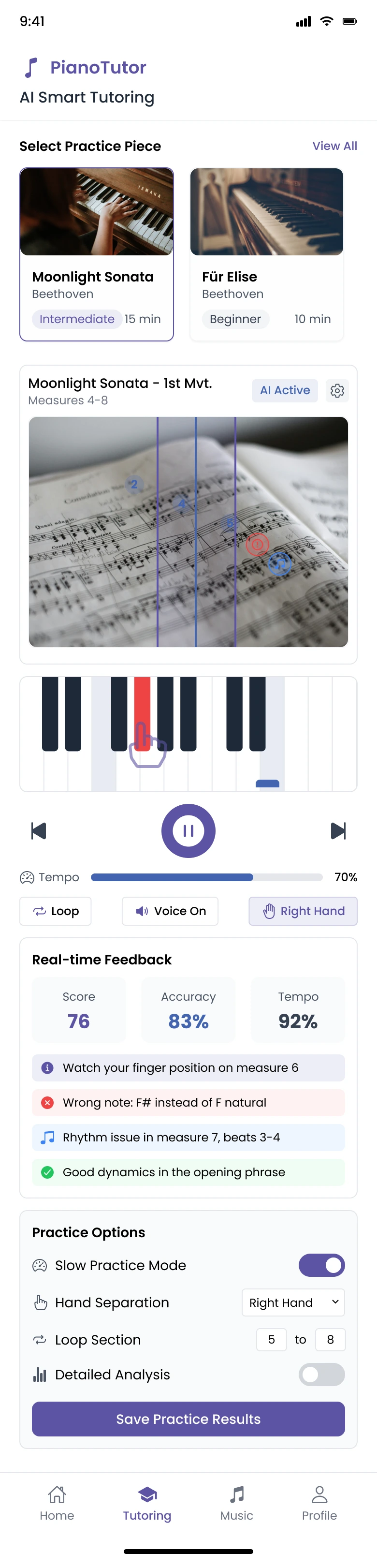 I need a piano practice app called PianoTutor. Start with the home page: The top displays today's practice tasks and learning progress. Below shows recommended pieces, master videos, and practice records. Quick access includes Video Tutoring, AI Practice, Sheet Music Library, and Exam Guidance. Displays music education news and parent classroom. Bottom nav: Home, Tutoring, Music, and Profile (current: Home). Visual style: Simply Piano/Flowkey: Musical purple-blue, sheet music, lesson progress, elegant design