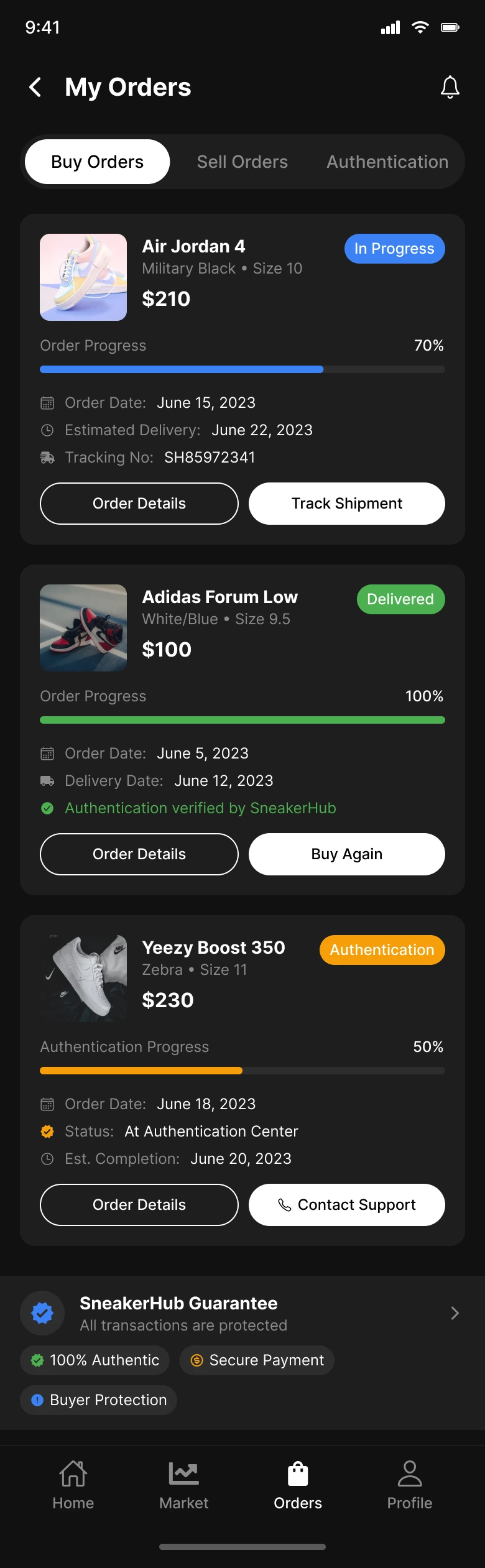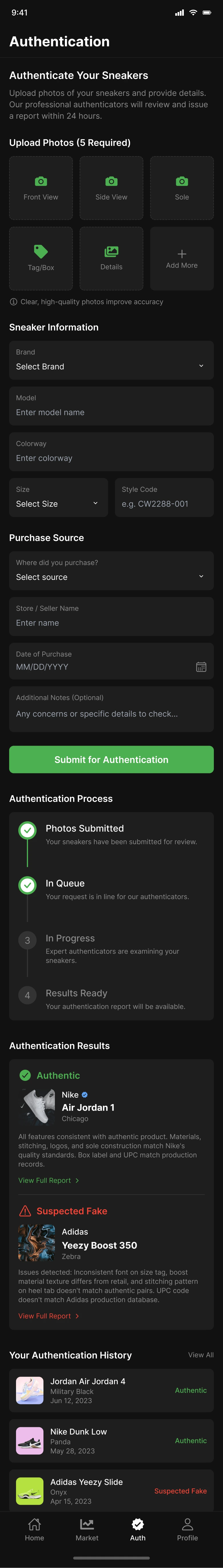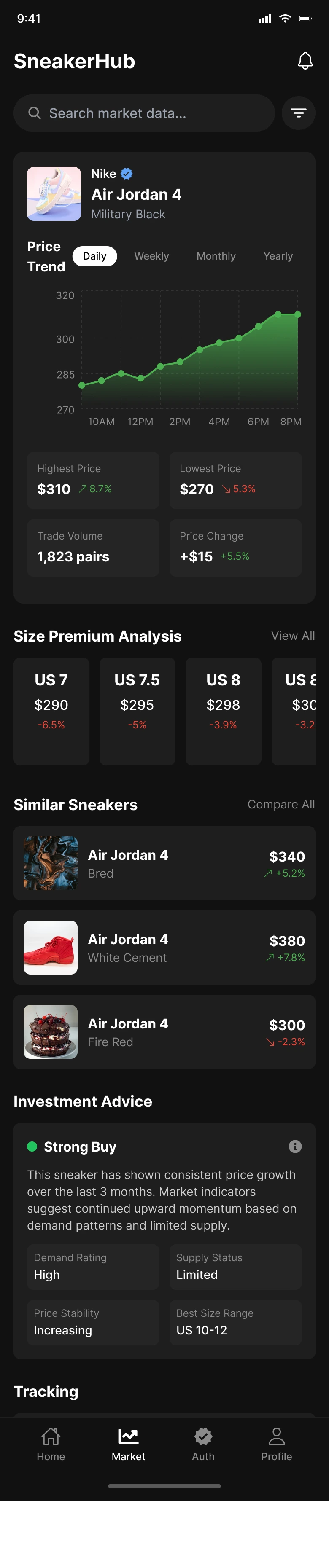 SneakerHub is a sneaker marketplace app designed to help sneaker enthusiasts buy, sell, and authenticate sneakers. This case showcases a complete sneaker trading platform with streetwear black-white theme, including home page, sneaker details, market analysis, authentication, transaction orders, and profile pages, referencing GOAT and StockX.