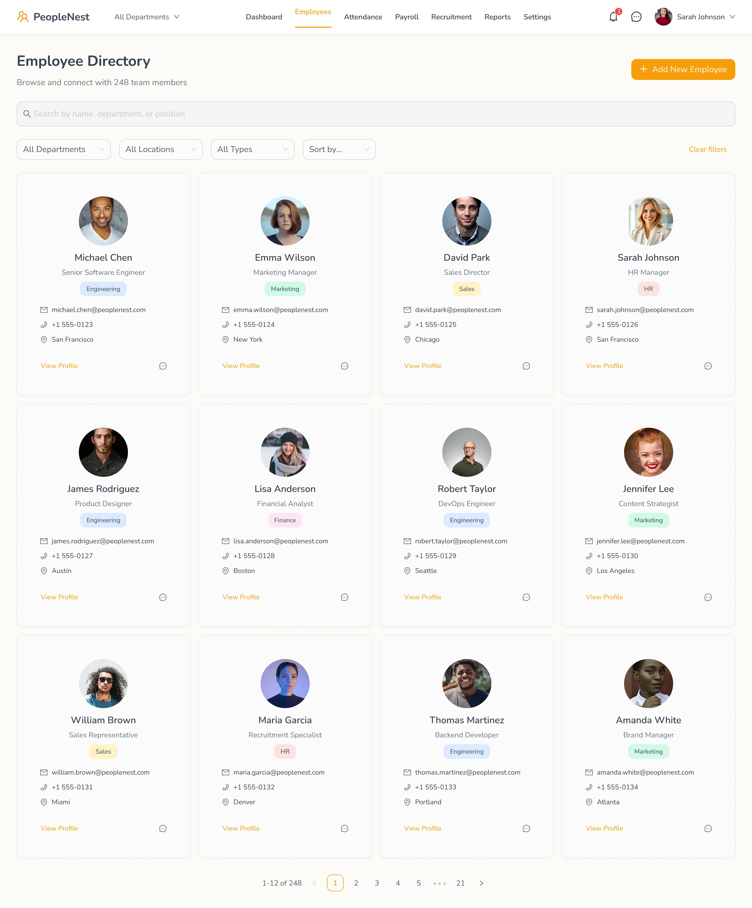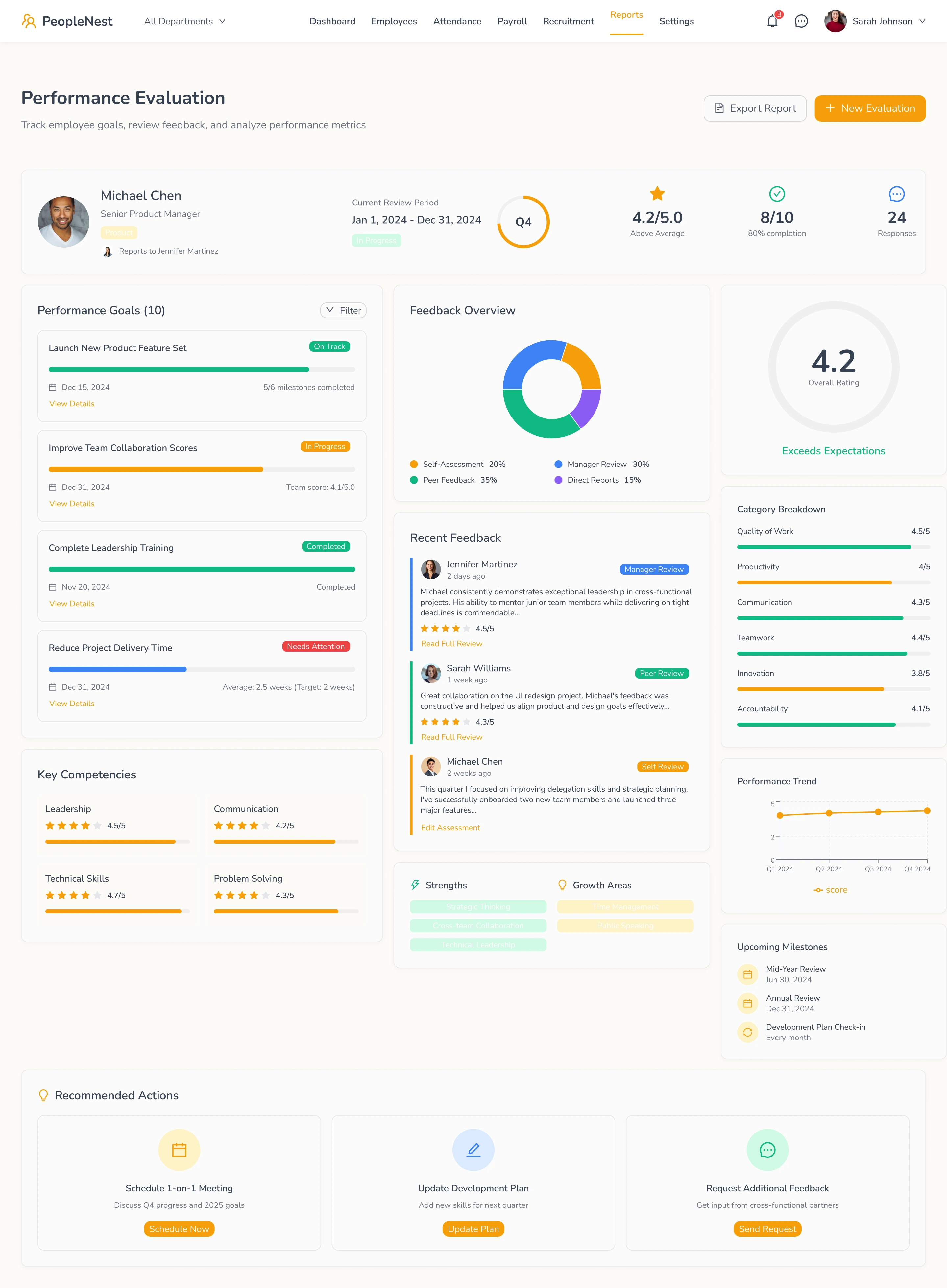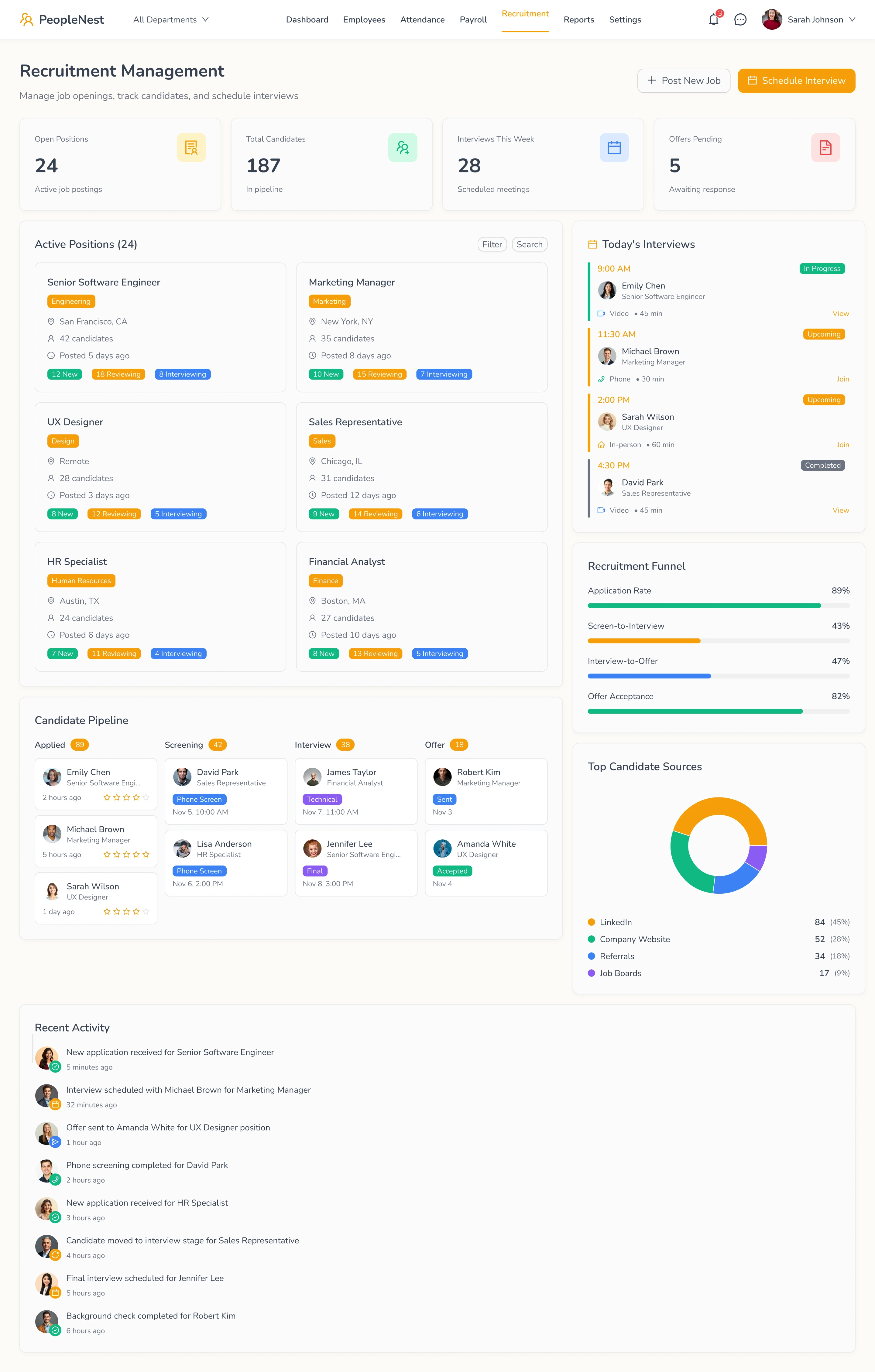PeopleNest HRM is a web-based human resource management system designed for comprehensive employee management. This case showcases a complete HR platform with soft human-centered color palette featuring warm beige tones, rounded cards, and subtle shadows, including dashboard, employee directory, attendance, payroll, recruitment, performance evaluation, reports, and settings pages.
