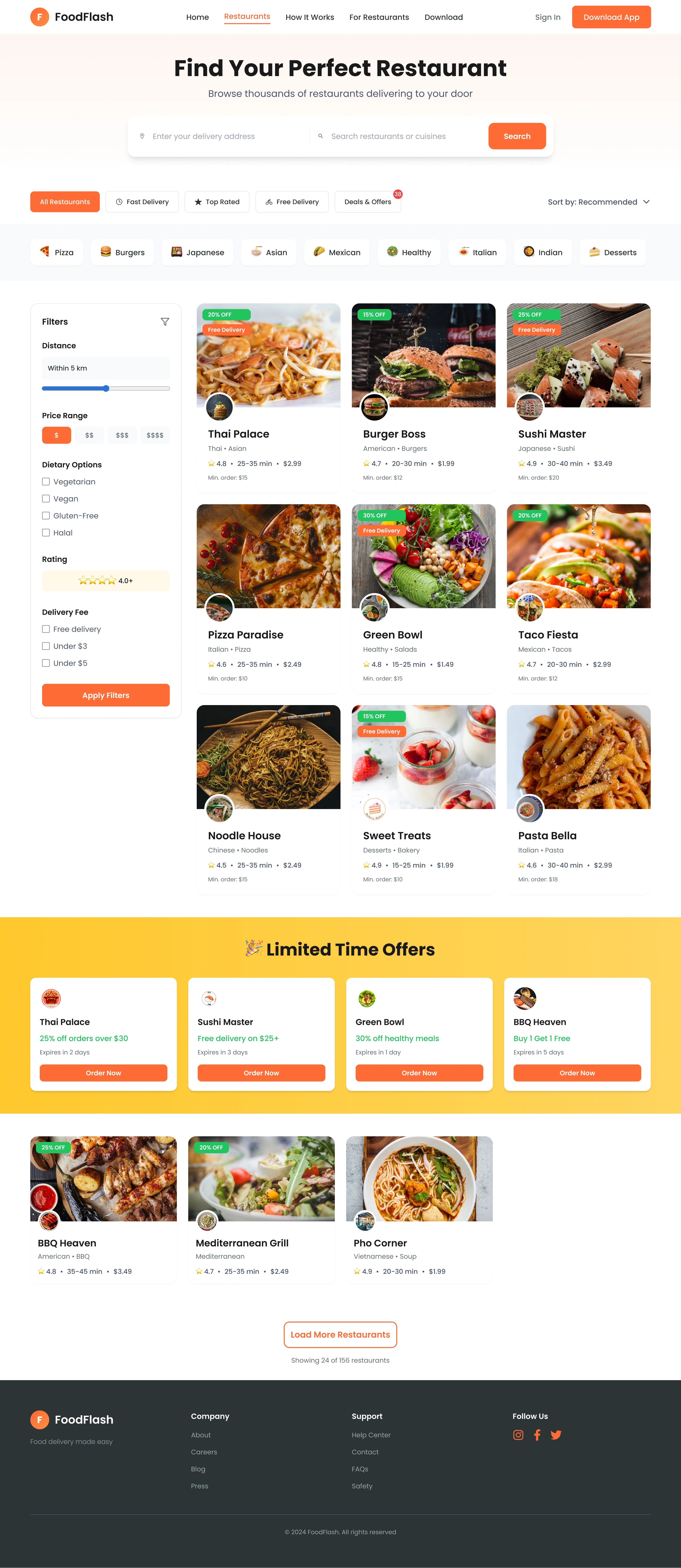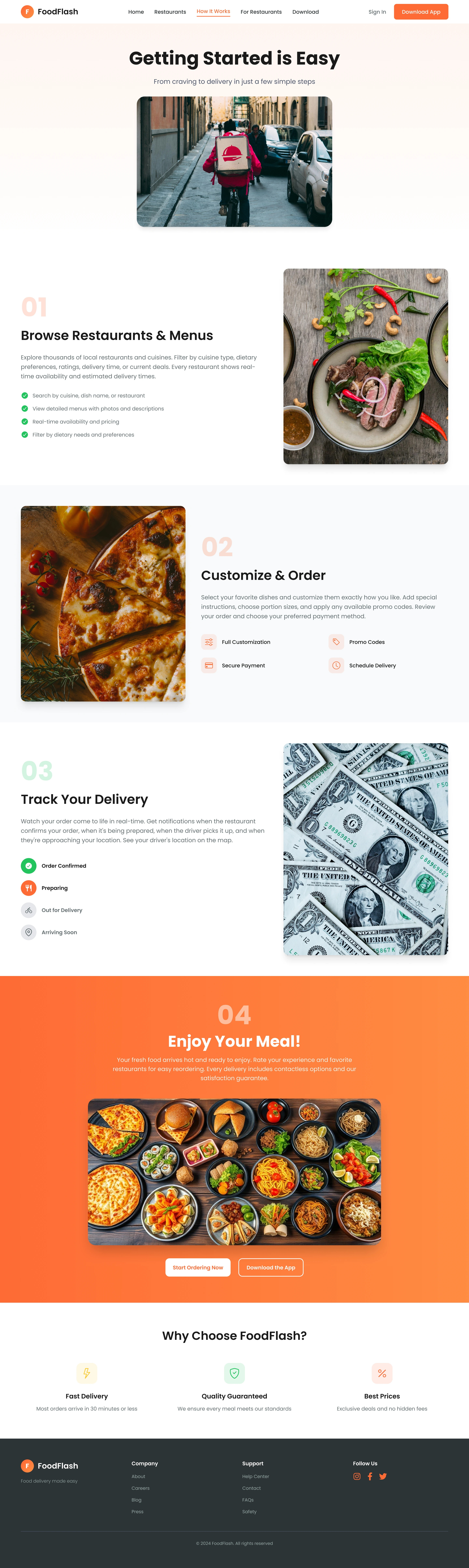 FoodFlash is a recipe website designed to drive landing page downloads and first orders. This case showcases a complete food delivery platform, including homepage, restaurant directory, how it works guide, restaurant partner program, and app download pages, with a food delivery style featuring vibrant food photography and appetite appeal, referencing DoorDash.