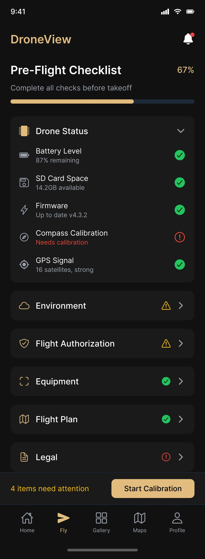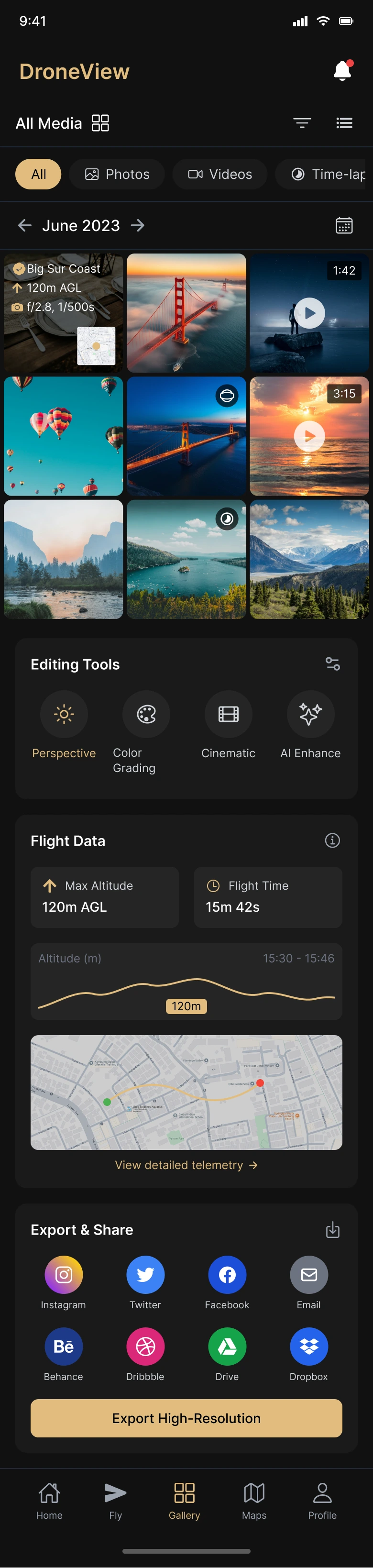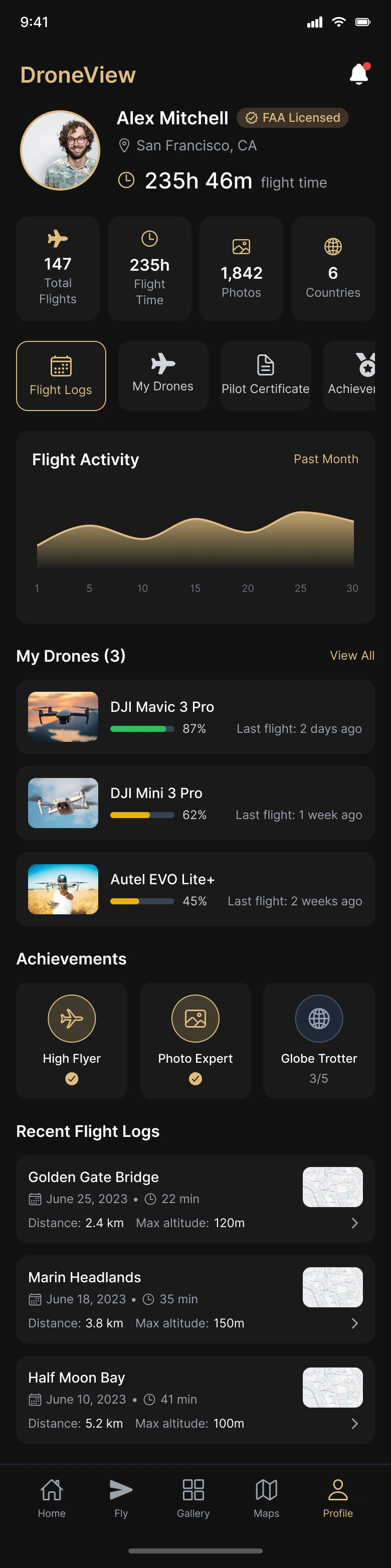 I need a drone photography app called DroneView. Start with the home page: The top displays featured aerial shots and flying conditions. Below shows flight logs, photo gallery, and pilot community. Quick access includes Pre-Flight Check, No-Fly Zones, Flight Planning, and Shot Library. Displays drone news and regulation updates. Bottom nav: Home, Fly, Gallery, Maps, and Profile (current: Home). Visual style: VSCO/Lightroom: Premium black-gold, pro editing tools, gallery-centric, artistic aesthetic