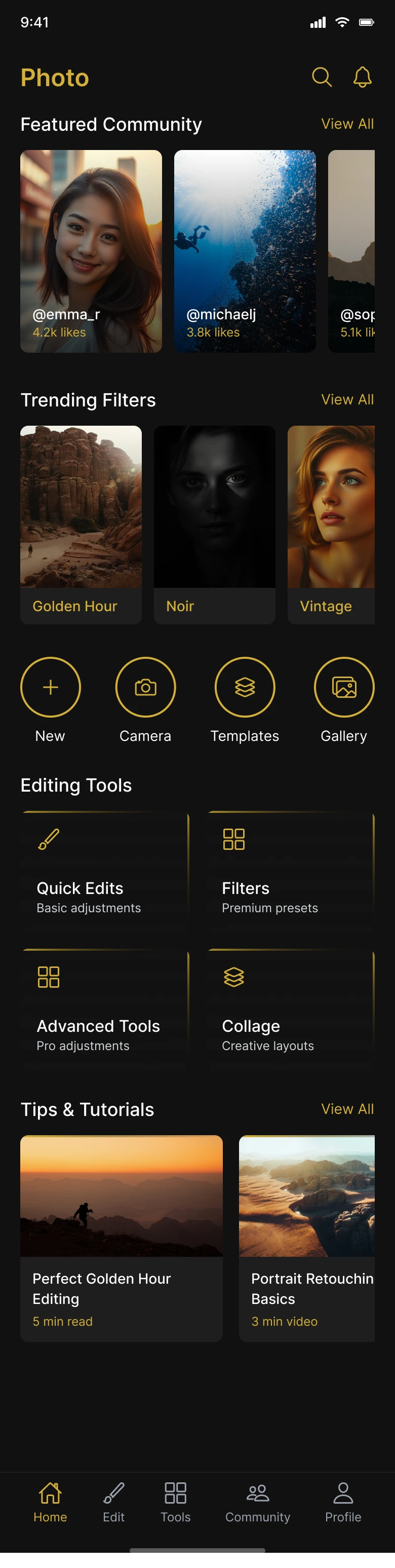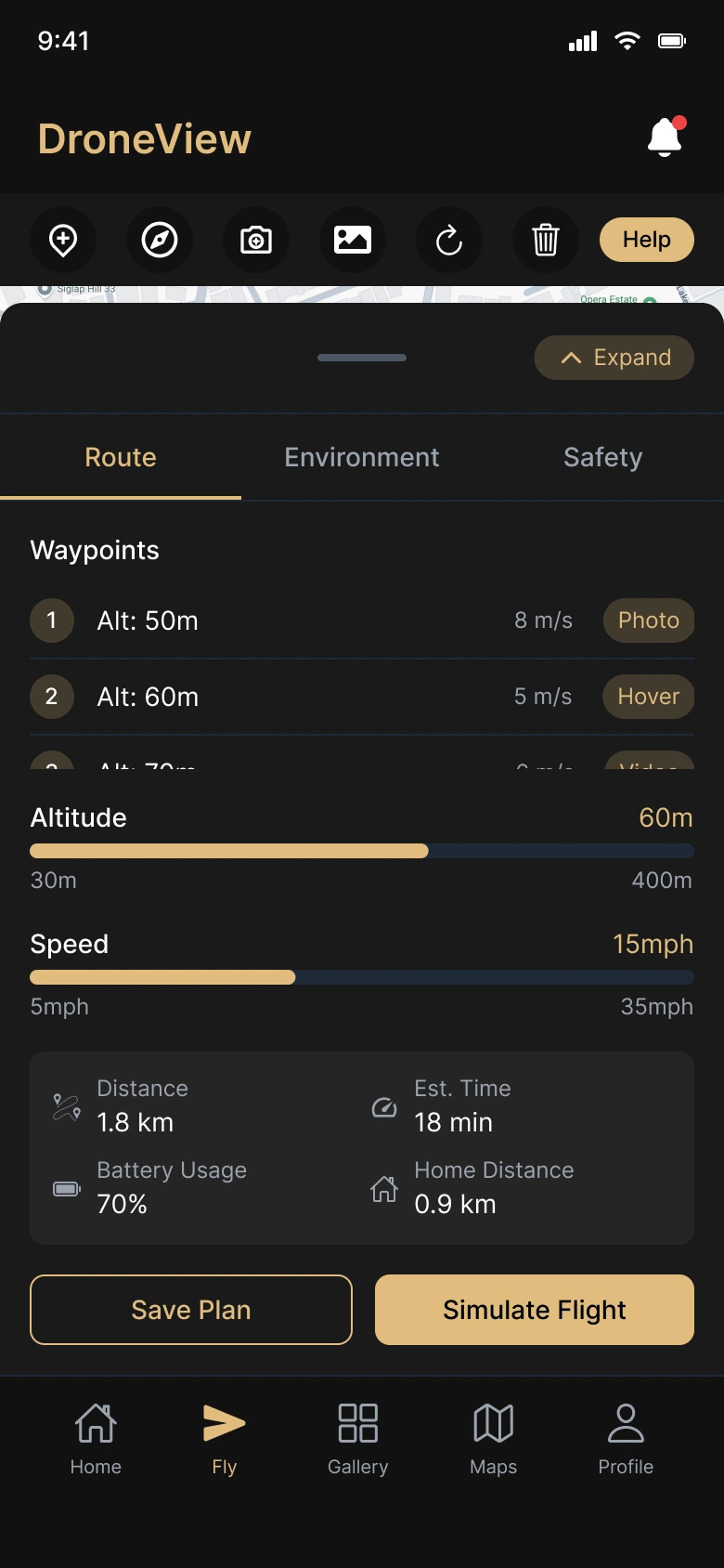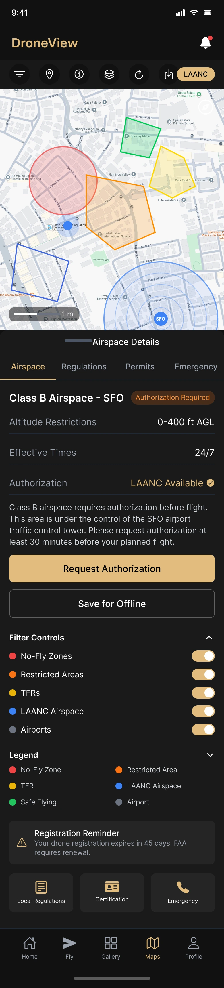 I need a drone photography app called DroneView. Start with the home page: The top displays featured aerial shots and flying conditions. Below shows flight logs, photo gallery, and pilot community. Quick access includes Pre-Flight Check, No-Fly Zones, Flight Planning, and Shot Library. Displays drone news and regulation updates. Bottom nav: Home, Fly, Gallery, Maps, and Profile (current: Home). Visual style: VSCO/Lightroom: Premium black-gold, pro editing tools, gallery-centric, artistic aesthetic