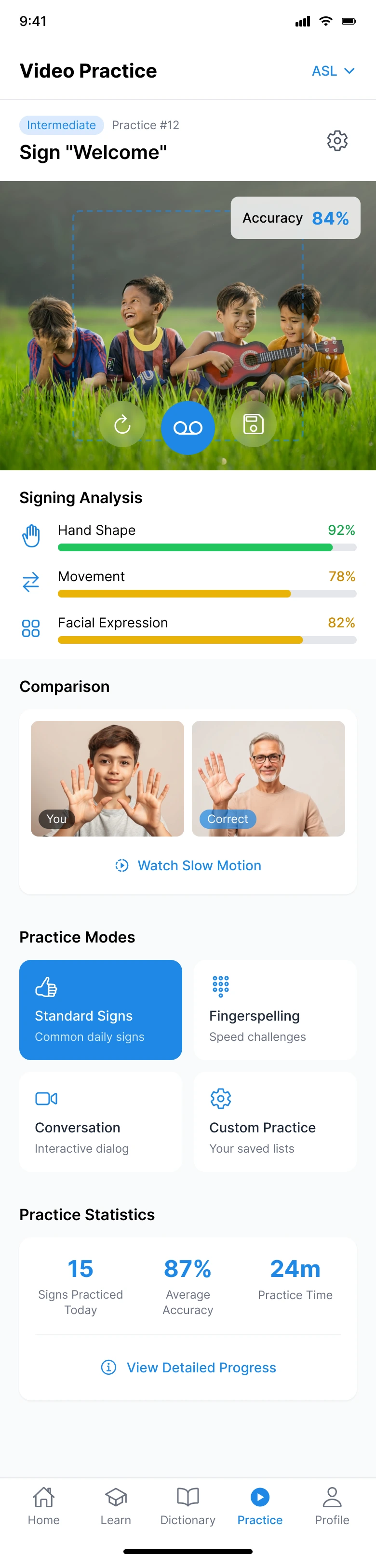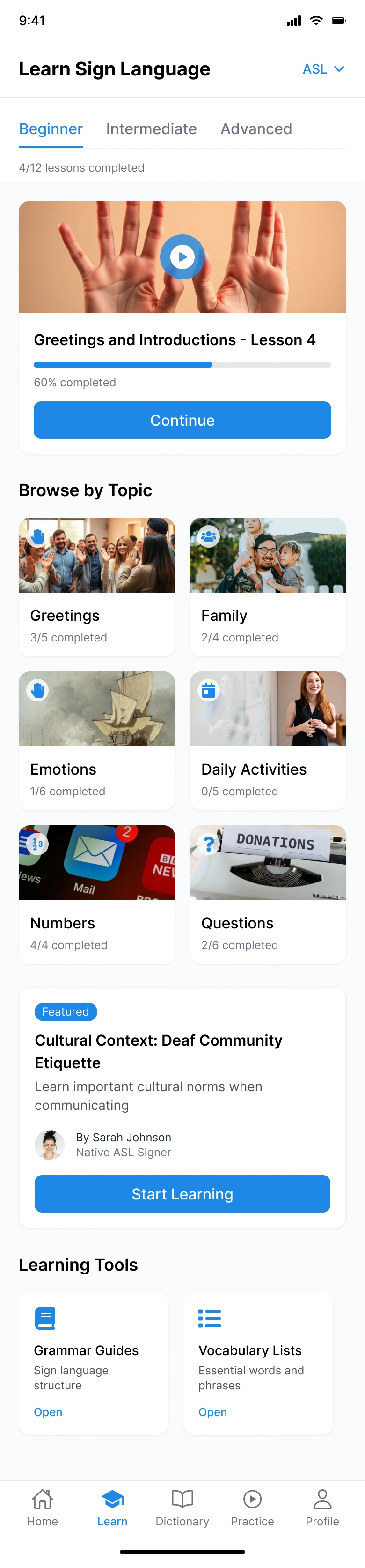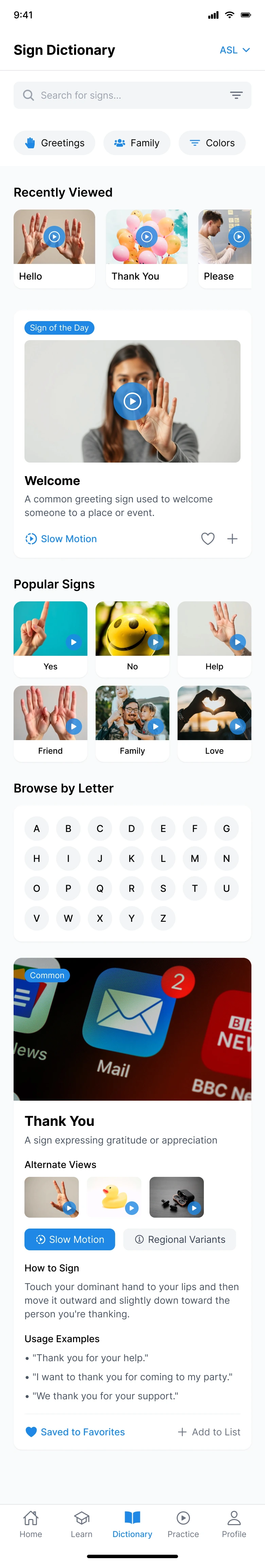 SignTalk is a sign language learning app designed to help users learn ASL/BSL/ISL through video lessons and practice. This case showcases a complete sign language platform with inclusive interface, including home page, lesson courses, sign dictionary, video practice, conversation practice, and profile pages, referencing SignSchool and The ASL App.
