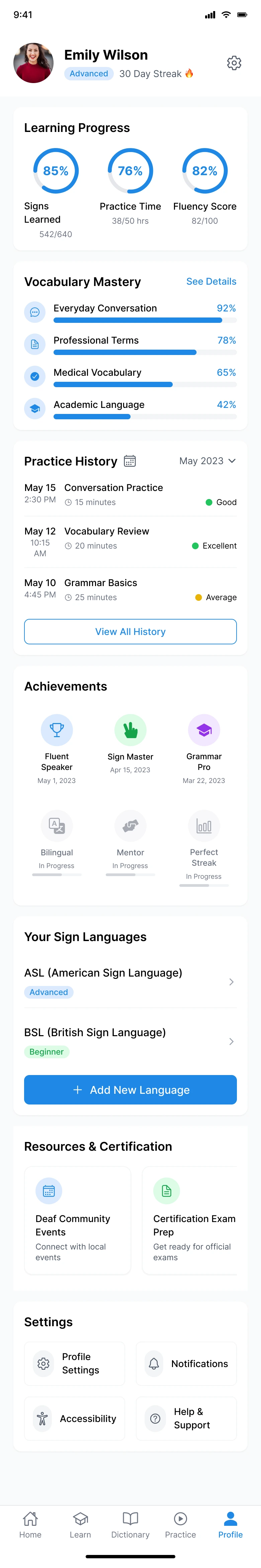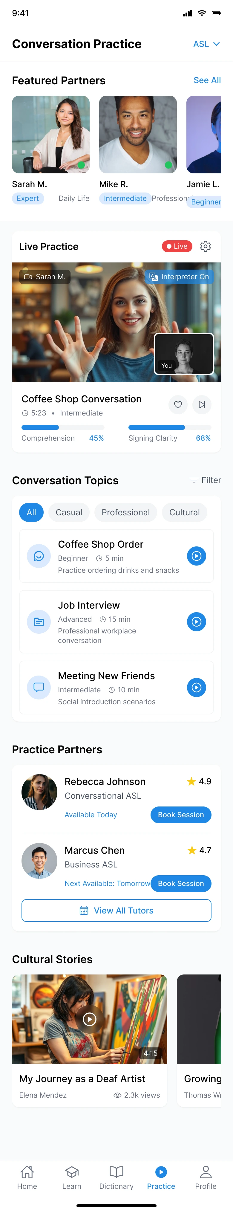 I need a sign language learning app called SignTalk. Start with the home page: The top displays today's learning goal and practice streak. Below shows lessons, vocabulary practice, and deaf community content. Quick access includes Video Lessons, Dictionary, Practice Mode, and Conversation Practice. Displays sign language news and deaf culture education. Bottom nav: Home, Learn, Dictionary, Practice, and Profile (current: Home). Visual style: SignSchool/The ASL App: Accessible design, gesture videos, learning modules, inclusive interface
