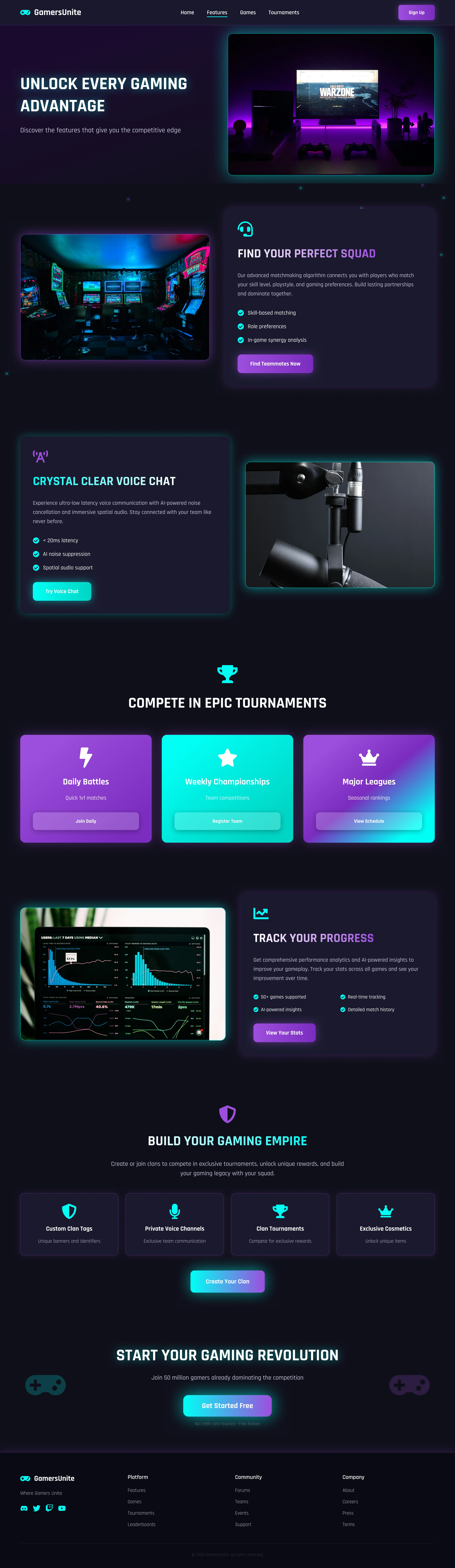GamersUnite is a social networking website designed to drive account registration for gamers. This case showcases a complete gaming community platform, including homepage, features overview, supported games directory, tournament listings, and sign-up pages, with gaming aesthetics featuring dark mode, energetic and competitive design, referencing Discord.