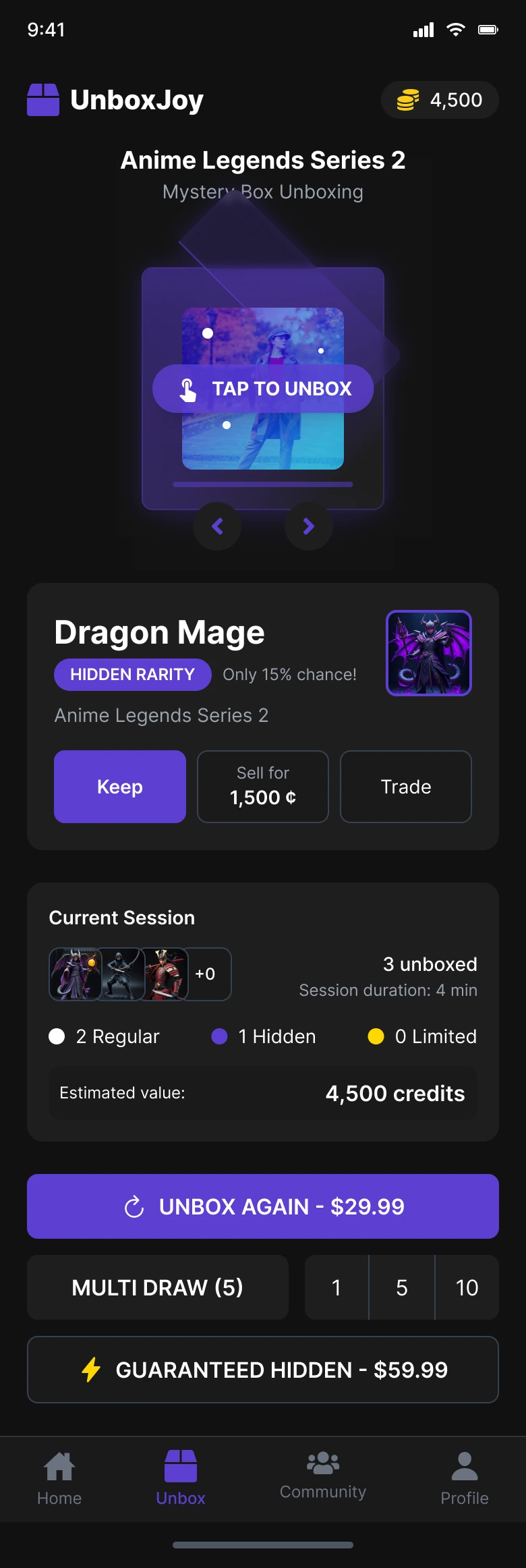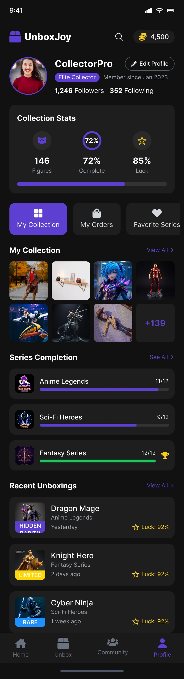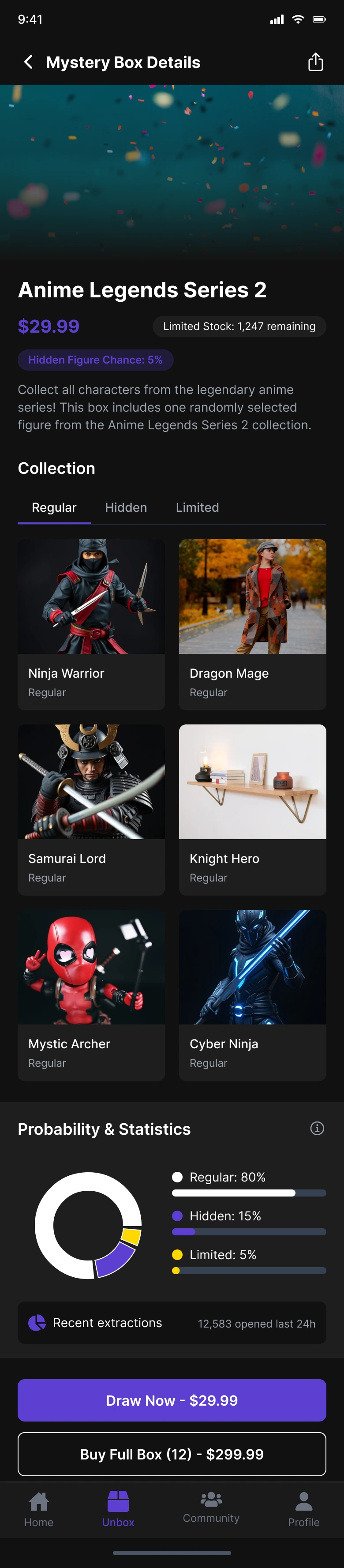 UnboxJoy is a mystery box e-commerce app designed to help collectors purchase mystery boxes, unbox online, and trade duplicates. This case showcases a complete collectibles platform with hype culture design, including home page, mystery box details, online unboxing, trading market, community, and profile pages, referencing StockX and GOAT.