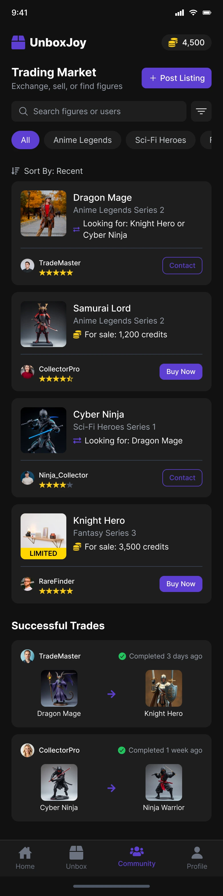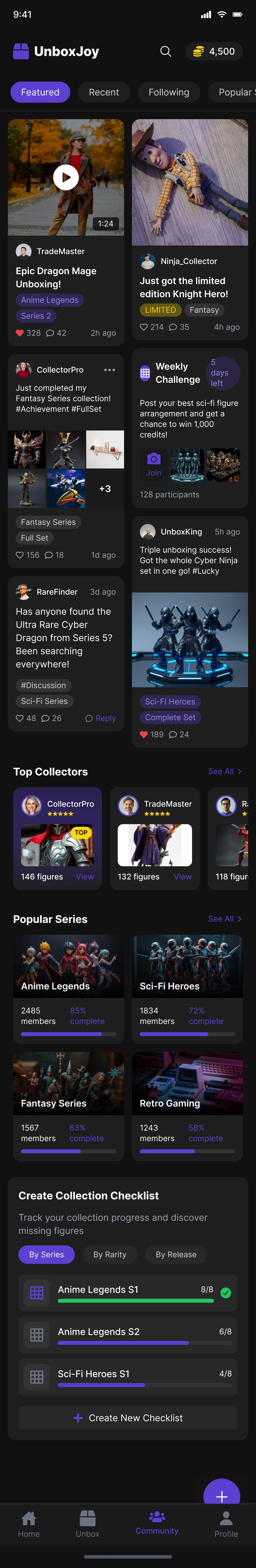 I need a mystery box e-commerce app called UnboxJoy. Start with the home page: Top banner displays limited edition mystery boxes and new release countdowns. Below shows popular series, collectible brands, and today's new arrivals. Quick access includes Unbox Machine, Trade Duplicates, Second-hand Market, and Unboxing Live. Displays collectibles news and collector showcases. Bottom nav: Home, Unbox, Community, and Profile (current: Home). Visual style: StockX/GOAT: Hype culture, product photography, authentication badges, collectible-focused