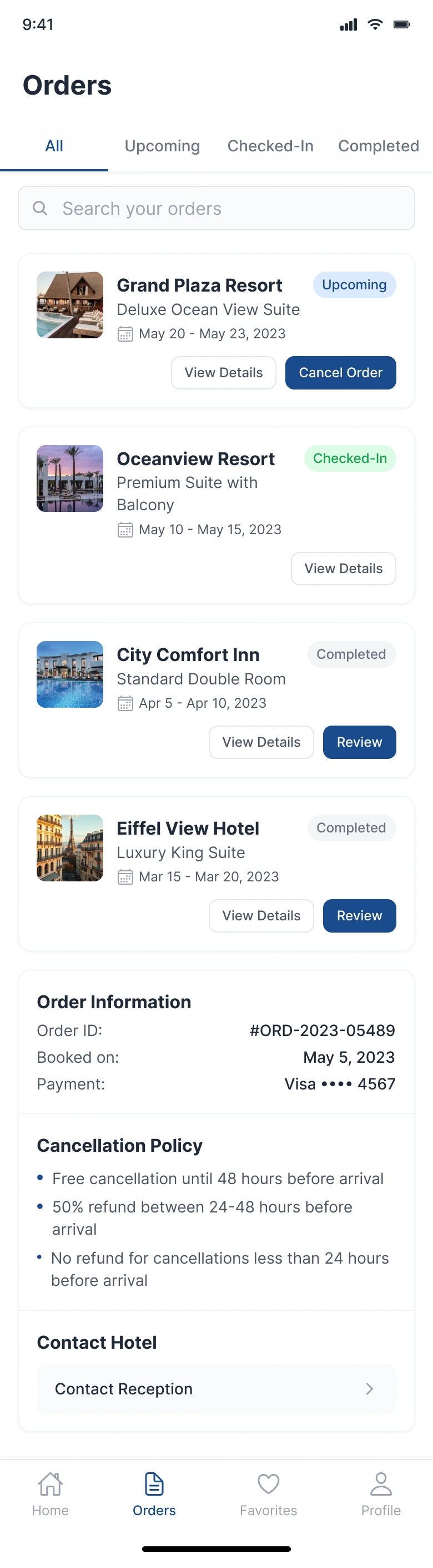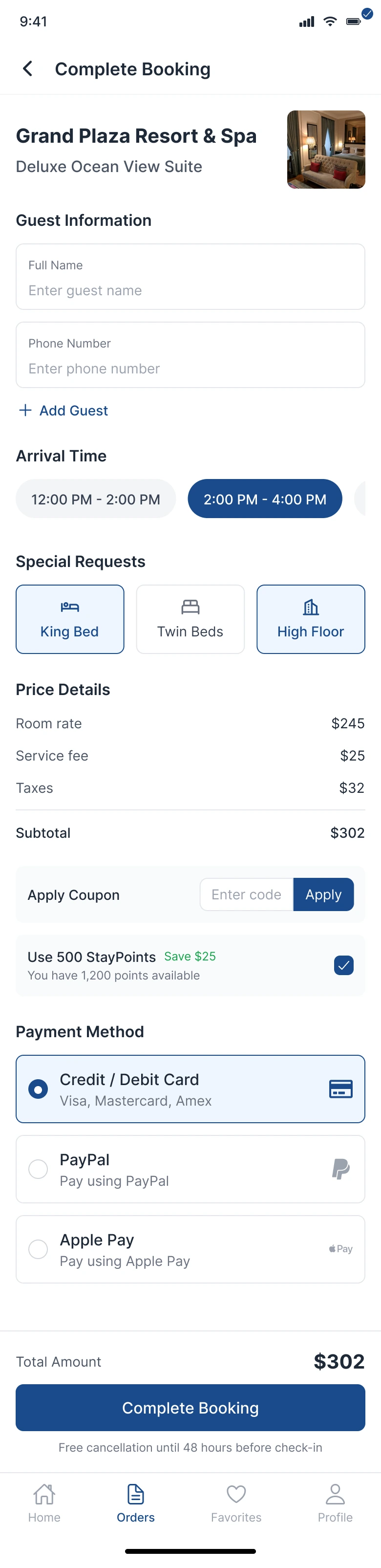 StayFinder is a hotel booking app designed to help users search, browse, and book hotels. This case showcases a complete accommodation platform with travel-themed blue and gold colors, including home page, hotel details, order fill-in, order management, map search, and profile pages.