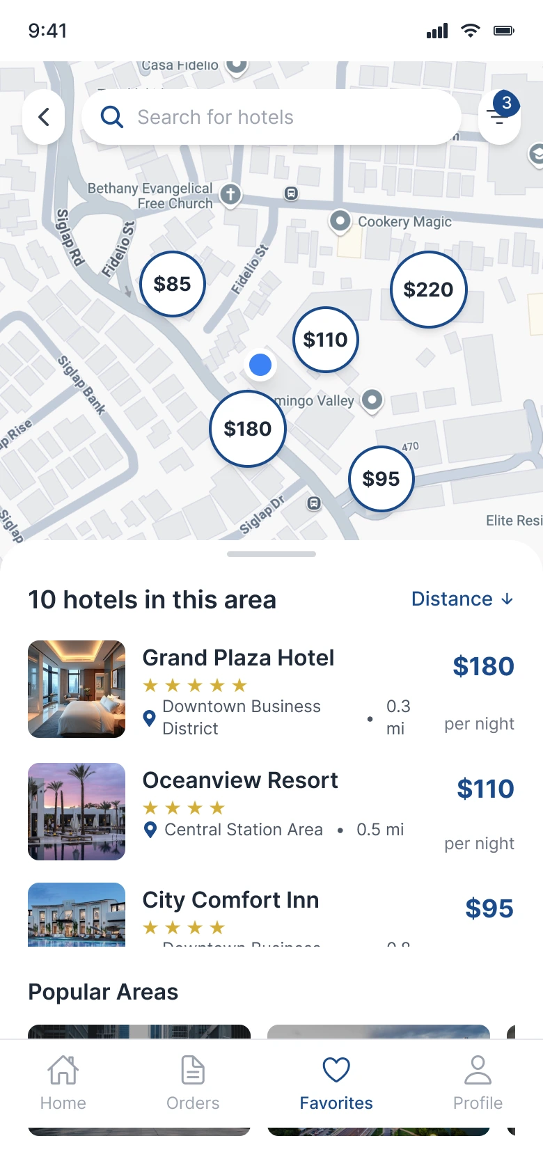 A hotel booking app called StayFinder. Top search bar inputs destination, check-in/checkout dates, and guest count. Below tabs switch Hotels/Guesthouses/Apartments. Displays nearby hotels or destination recommended hotel cards, each showing hotel image, name, star rating, score, price, and distance. Quick filters include price, star rating, and brand. The app's bottom navigation bar includes Home, Orders, Favorites, and Profile, with "Home" currently selected. The visual style uses a travel accommodation theme with blue and gold colors.