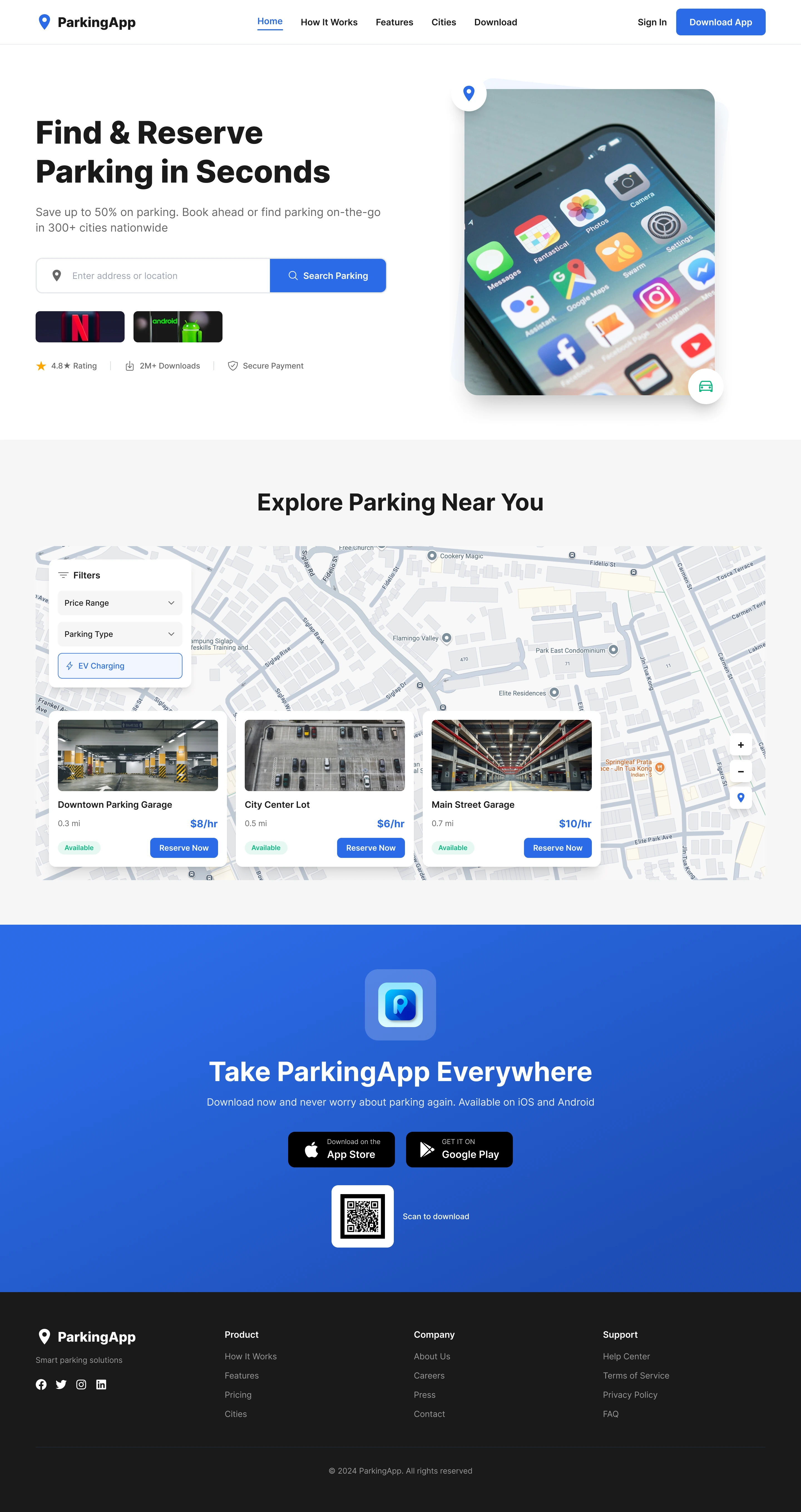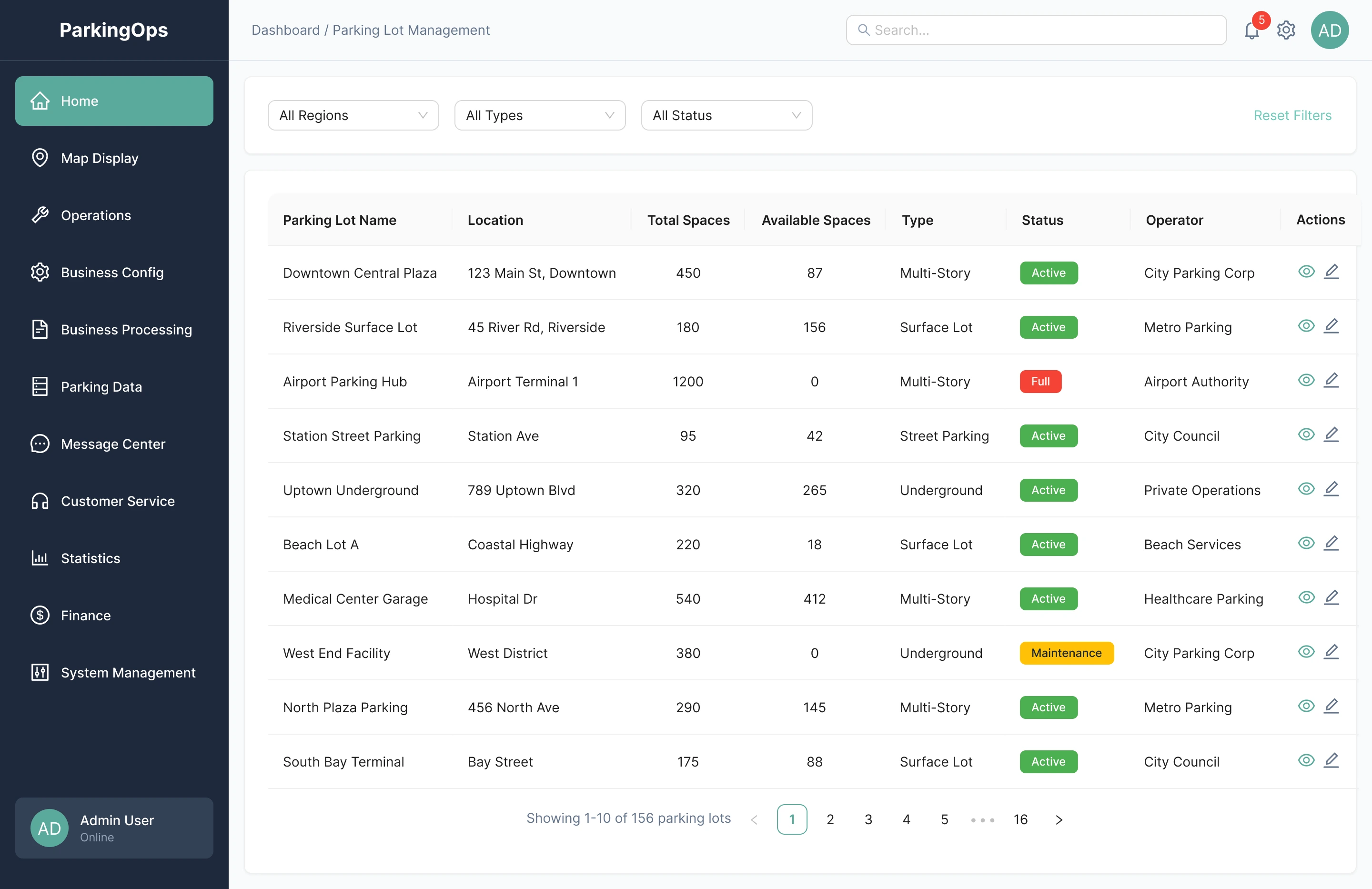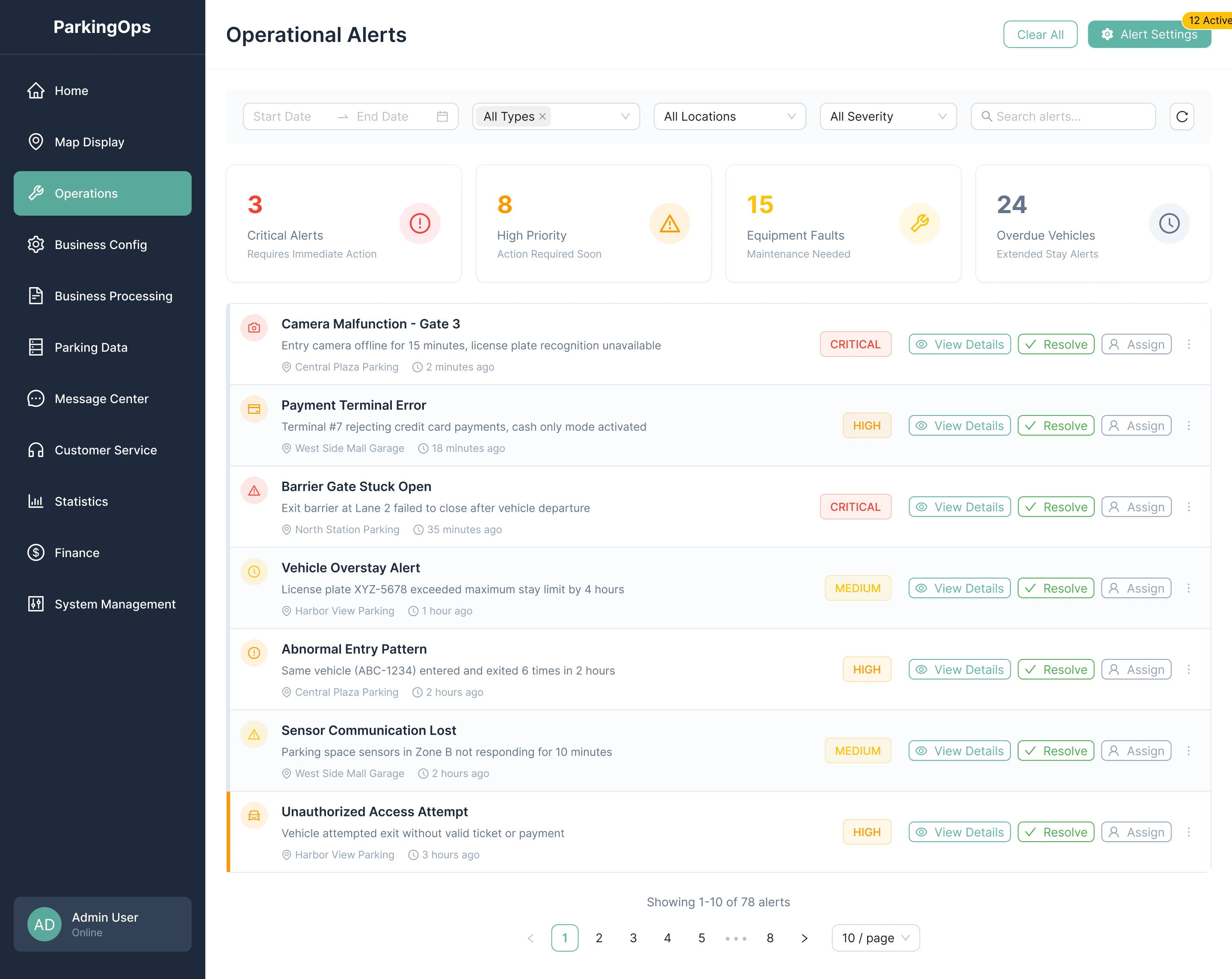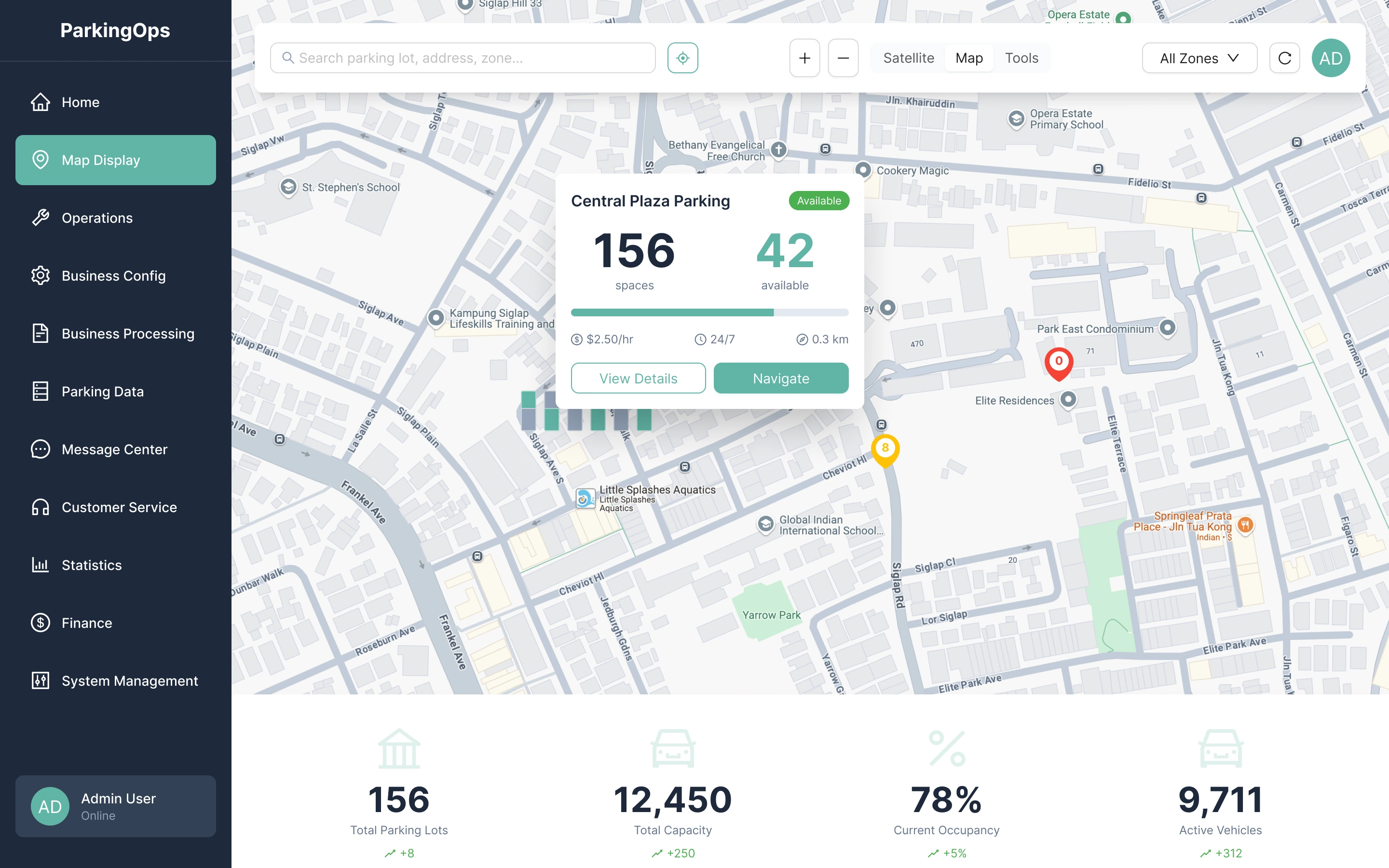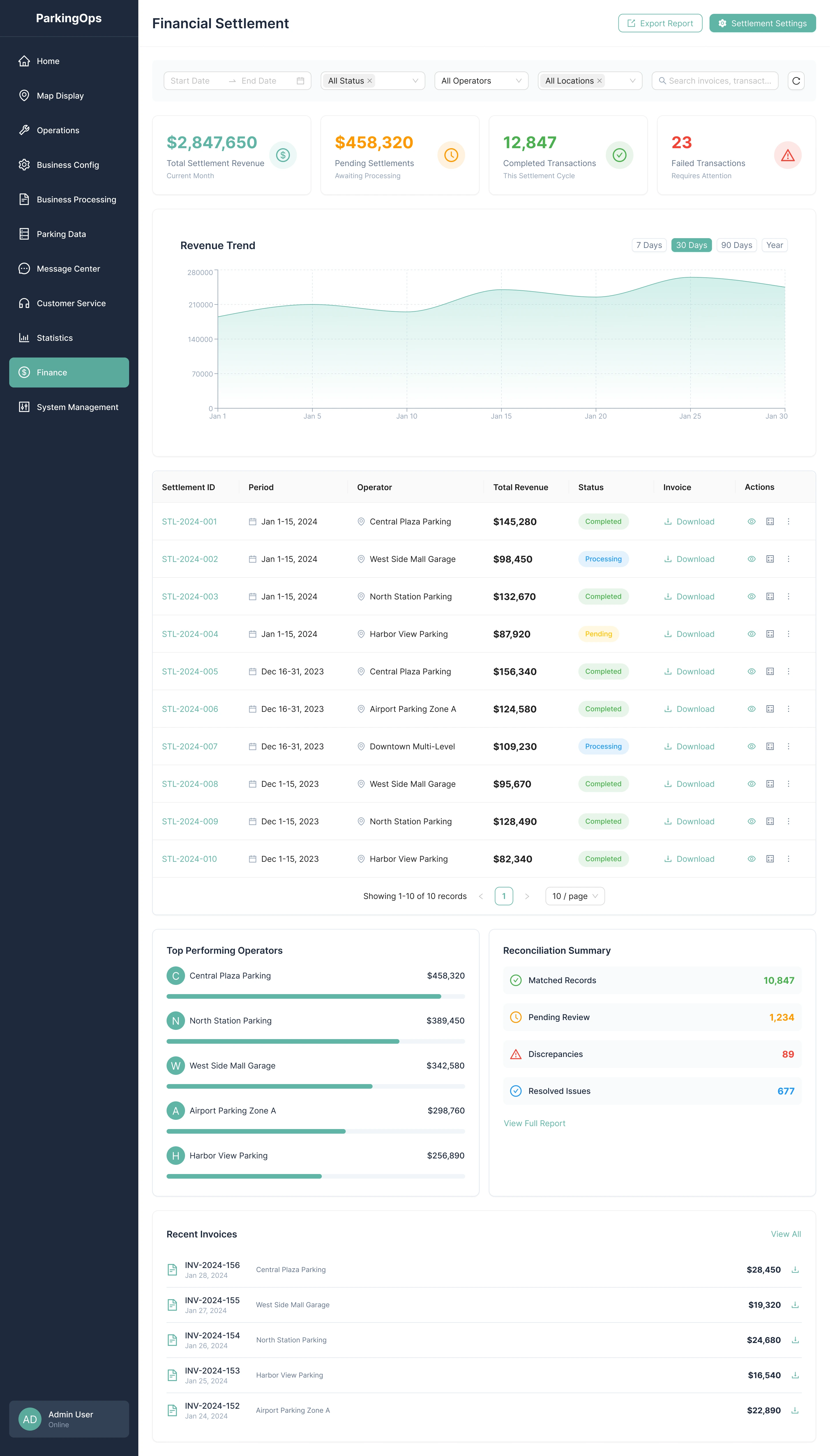 ParkingOps is a web-based parking management system designed for comprehensive parking operations. This case showcases a complete parking admin platform with clean white background and dark blue-gray navigation, including dashboard overview, real-time map monitoring, parking lot management, vehicle records, operational alerts, financial settlement, and configuration pages.