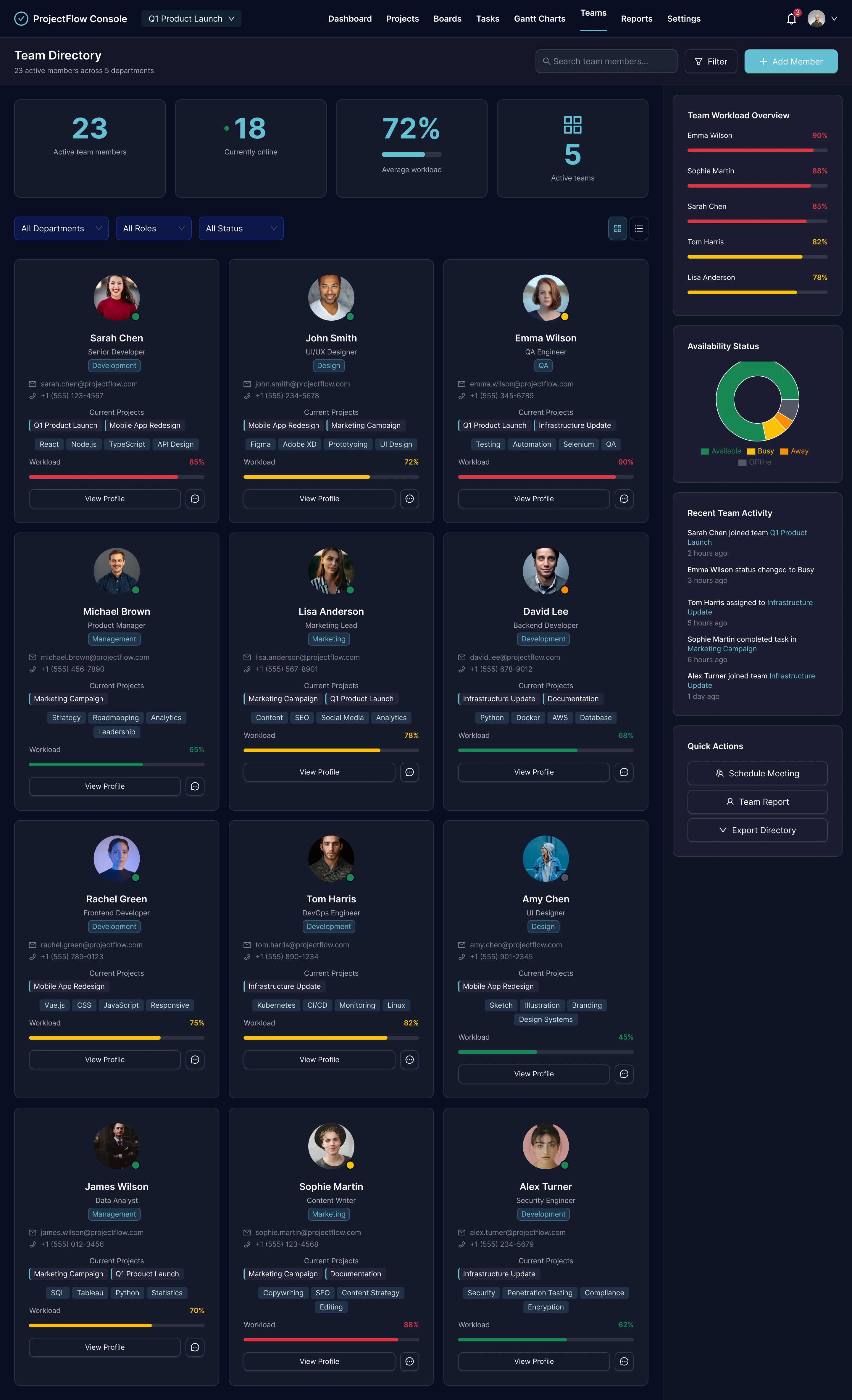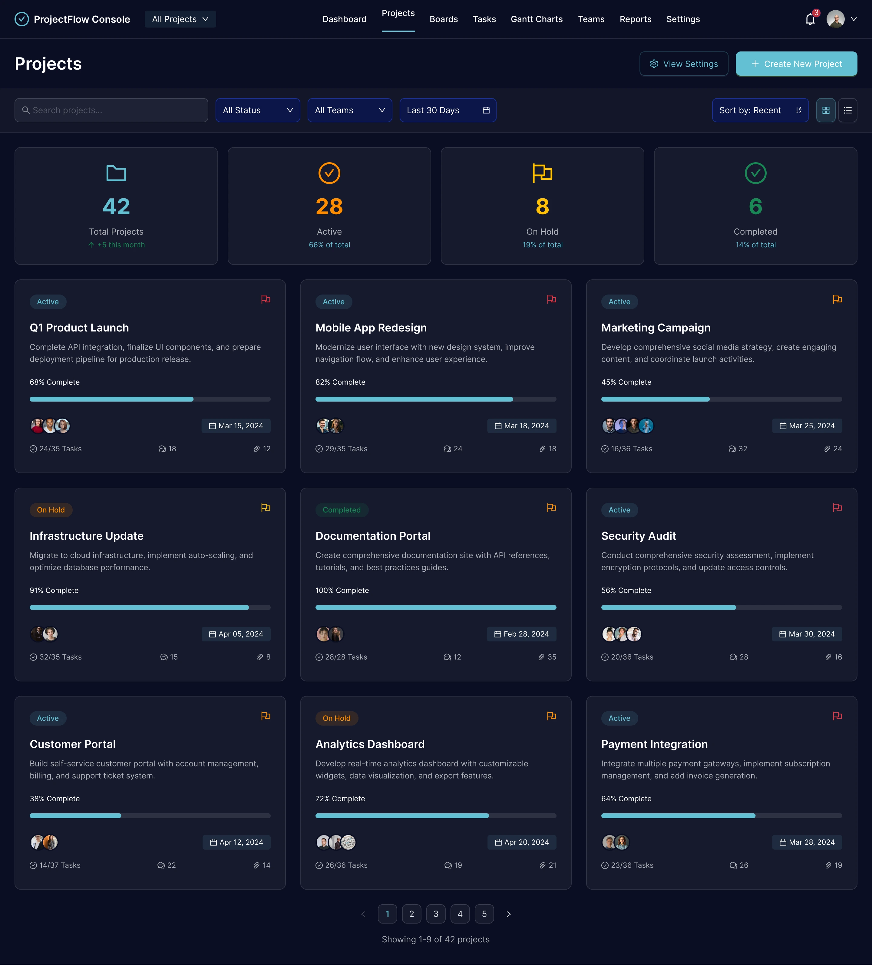 A Project Management Dashboard for a web-based project management system called ProjectFlow Console.