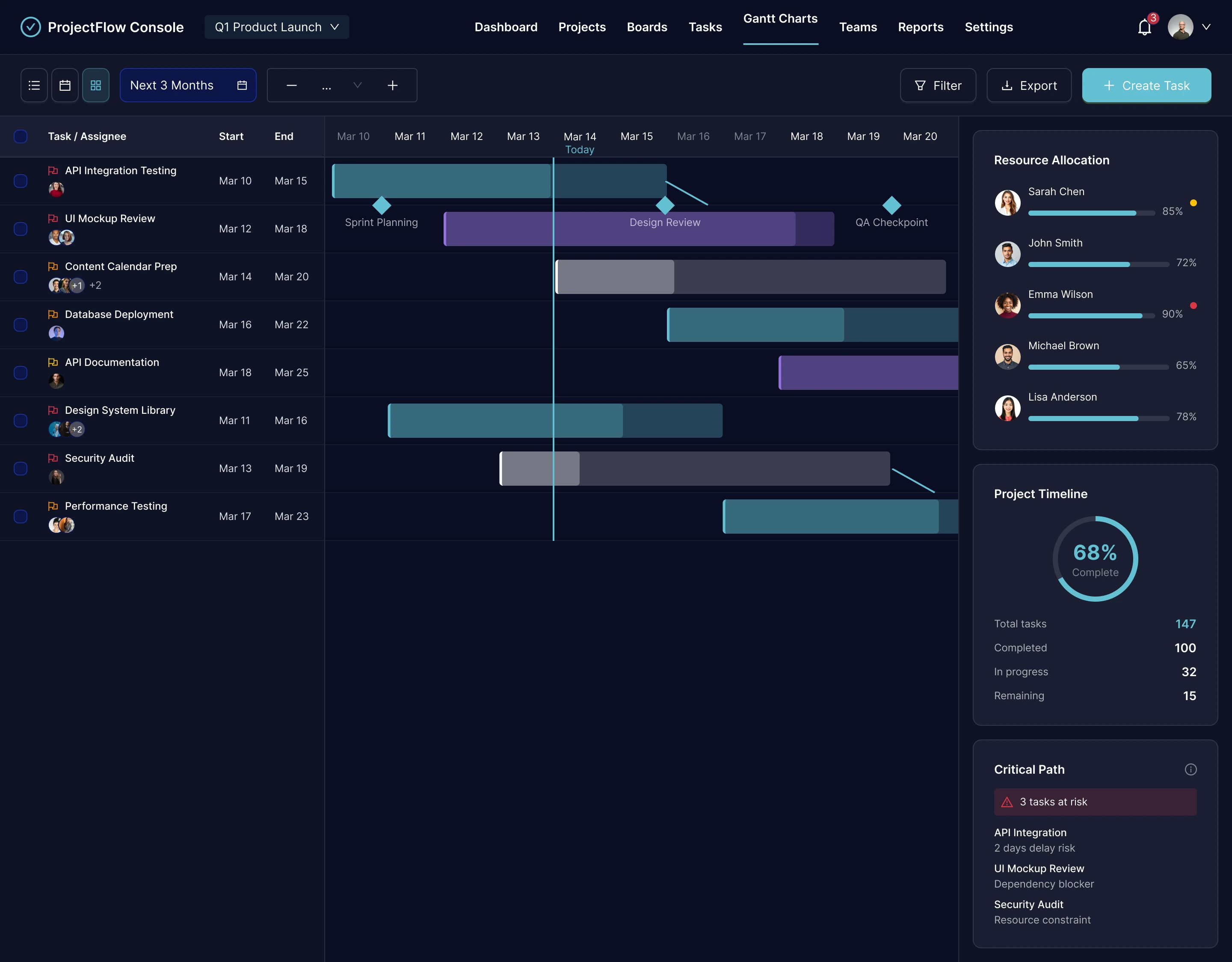 ProjectFlow Console is a web-based project management system designed for comprehensive project tracking and team collaboration. This case showcases a complete project management platform with dark mode interface featuring deep navy-black background and high contrast cyan accents, including dashboard with Kanban boards and Gantt charts, boards management, projects overview, tasks tracking, Gantt chart visualization, and teams management pages.