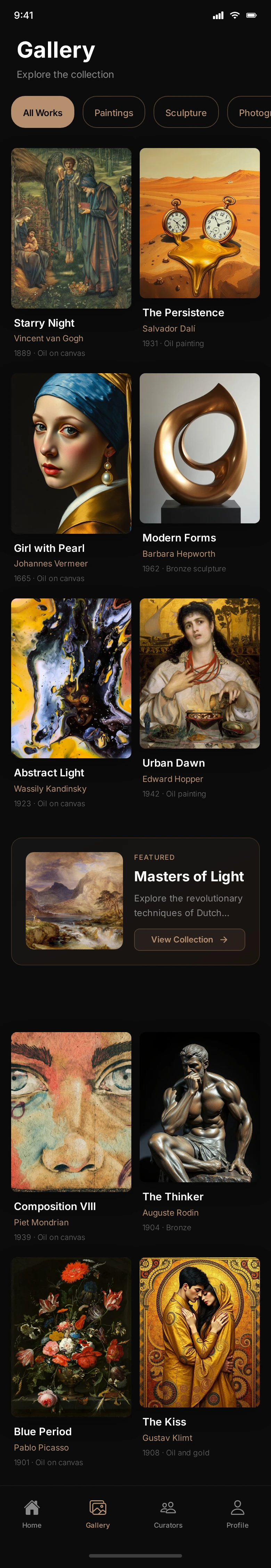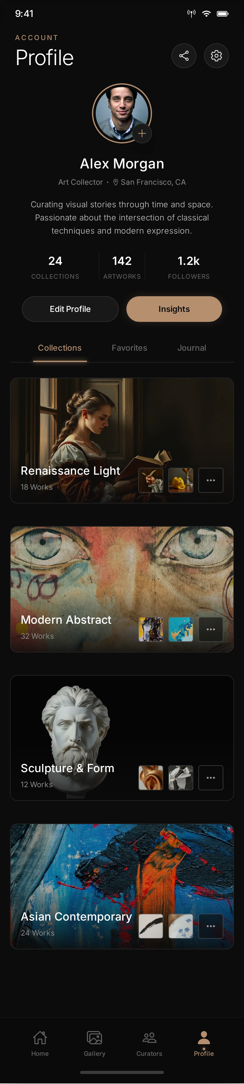 An art exhibition mobile app showcasing fine paintings and sculptures. This case features a complete gallery experience including home page, gallery listing, curators, and profile pages, all designed with minimalist dark base, warm bronze accents, and subtle paper texture.