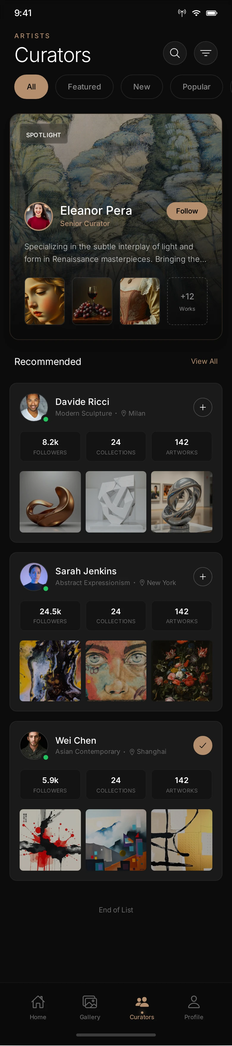- Bottom navigation: Home · Gallery · Curators · Profile