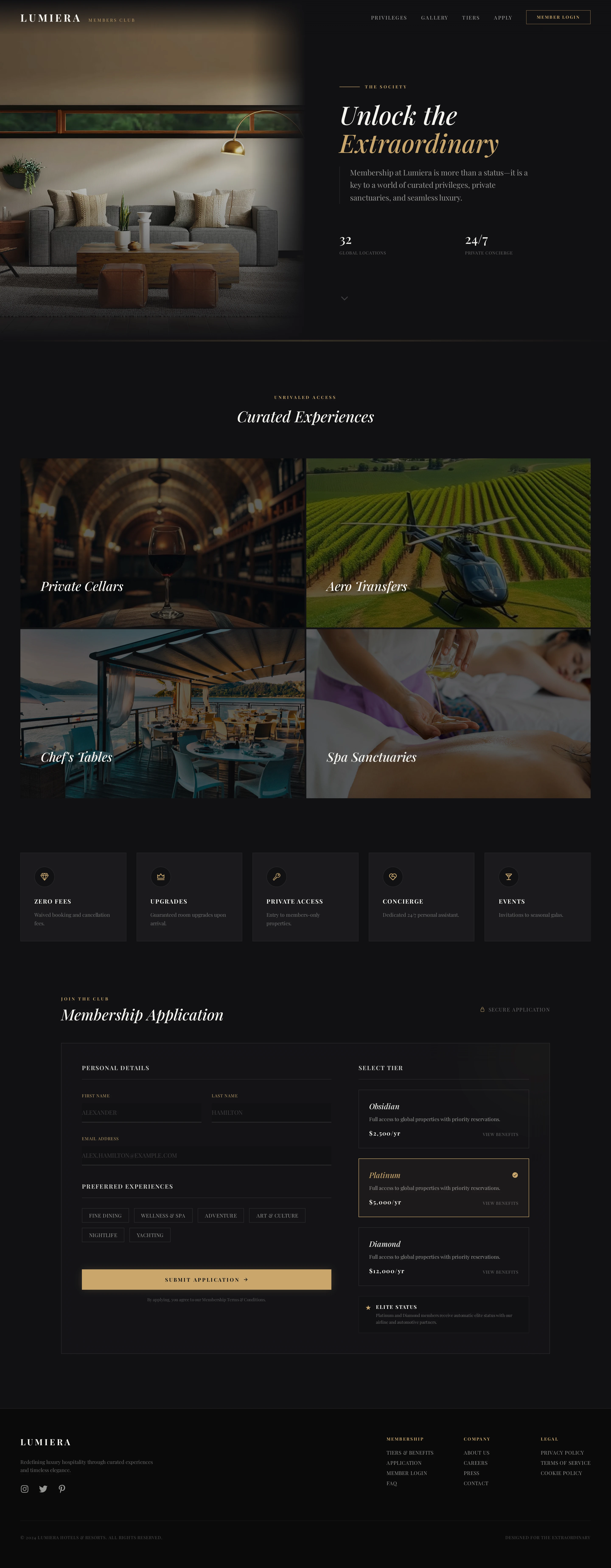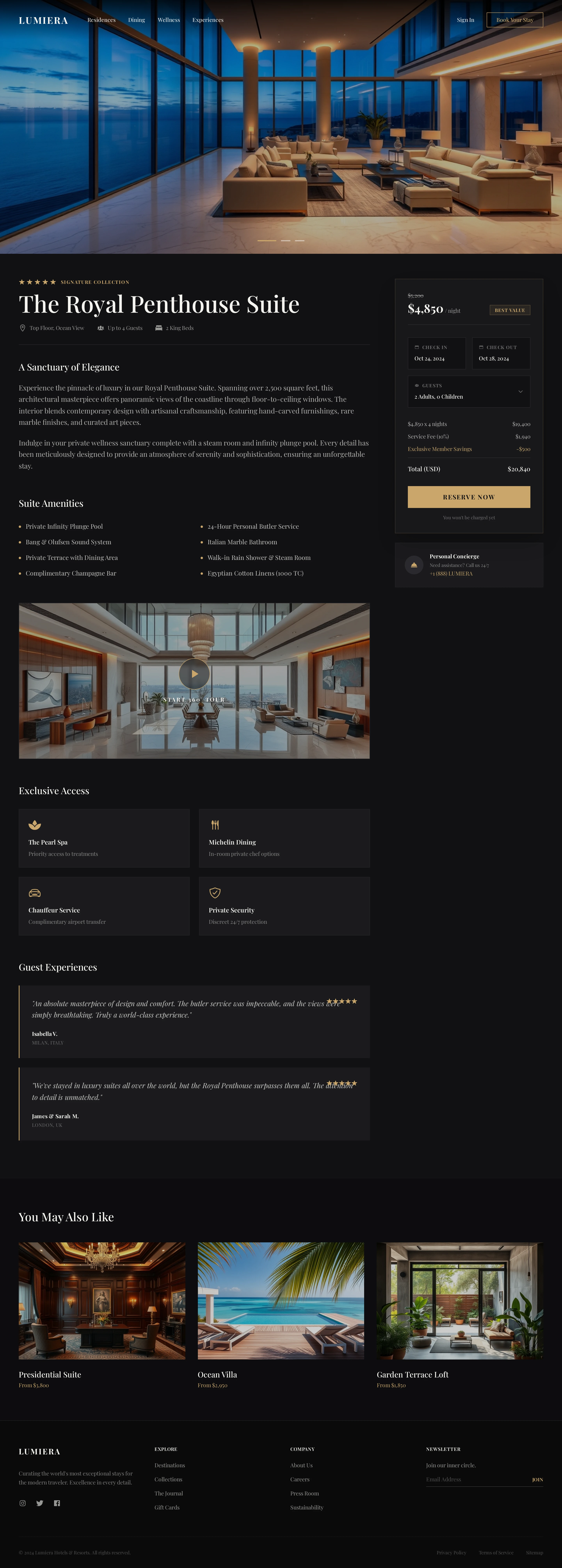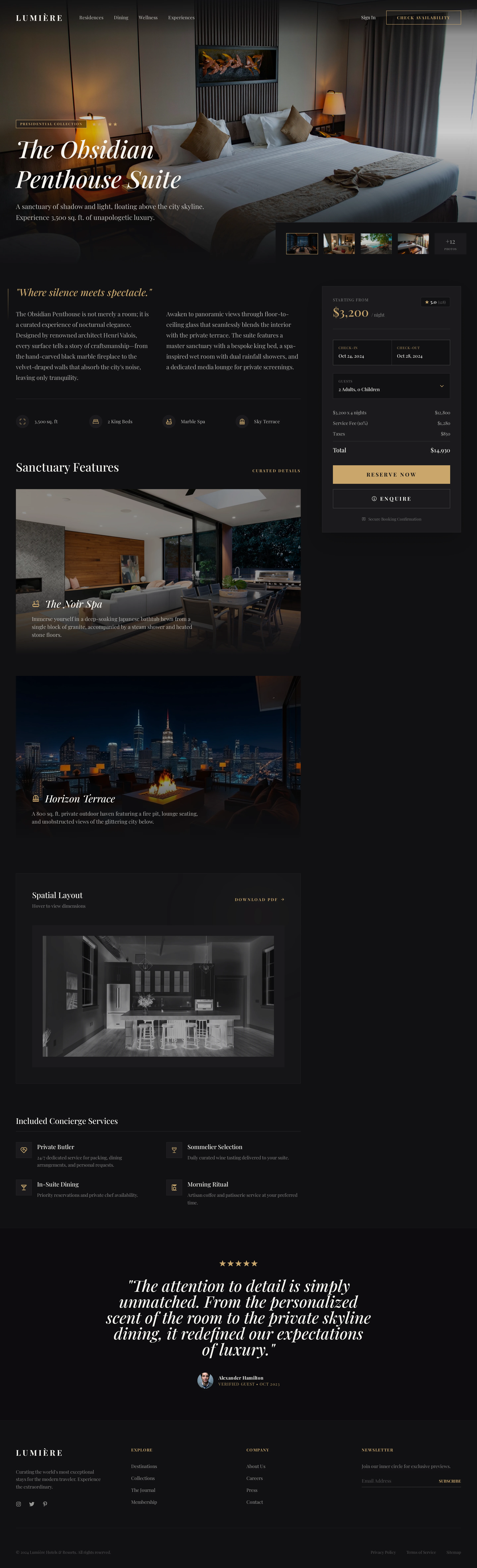 A boutique hotel booking platform web application showcasing cinematic luxury design. This case features a complete booking experience including landing page, room detail, experiences, checkout, and members club pages, all designed with deep charcoal background, ivory cream, and elegant gold accents.