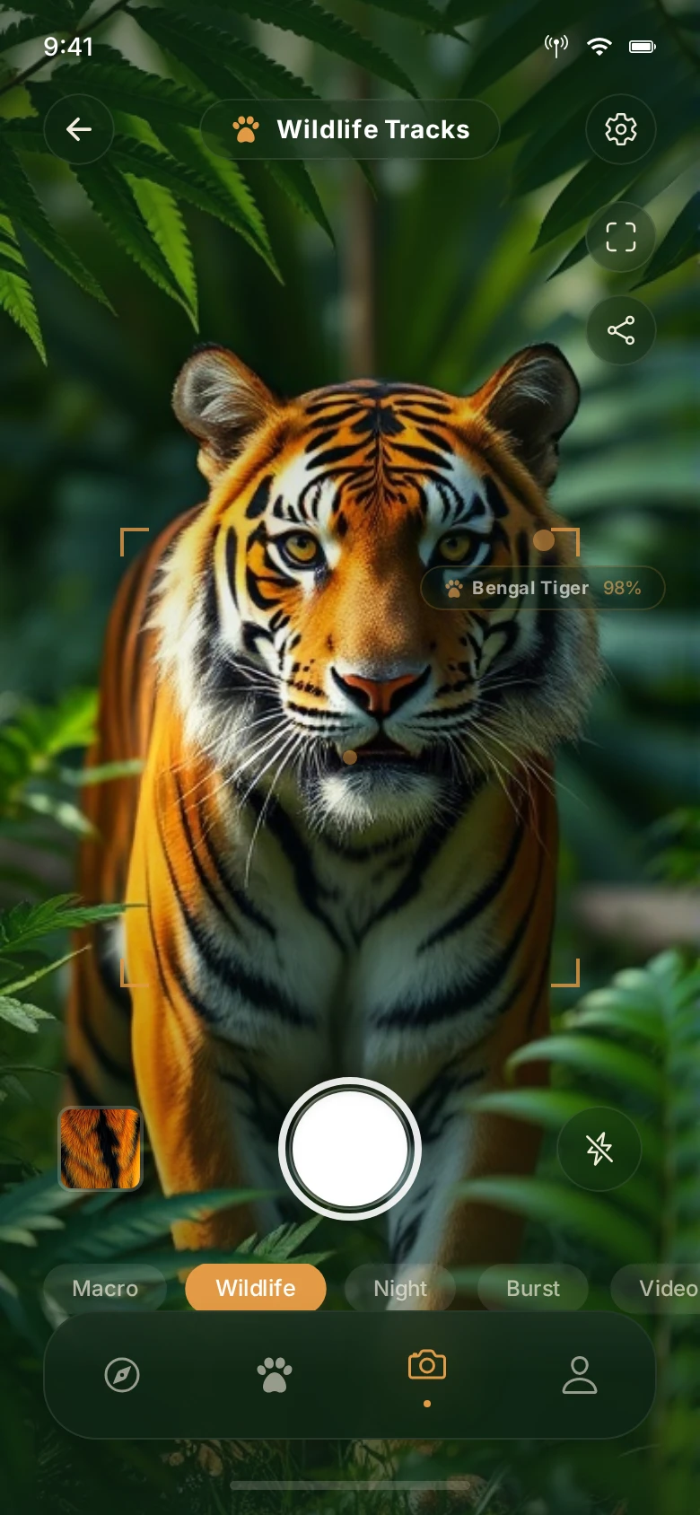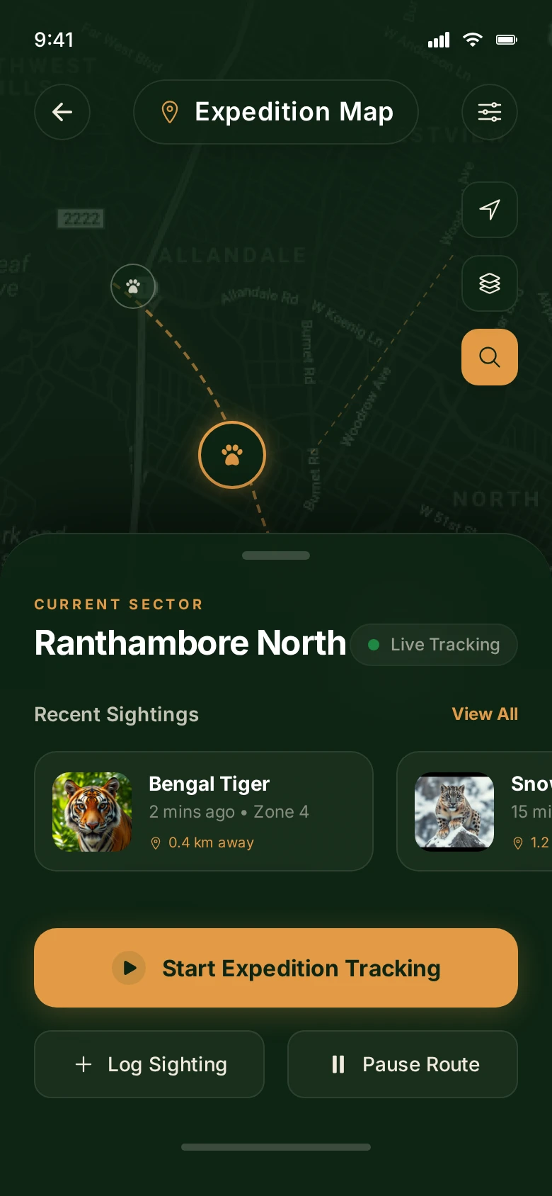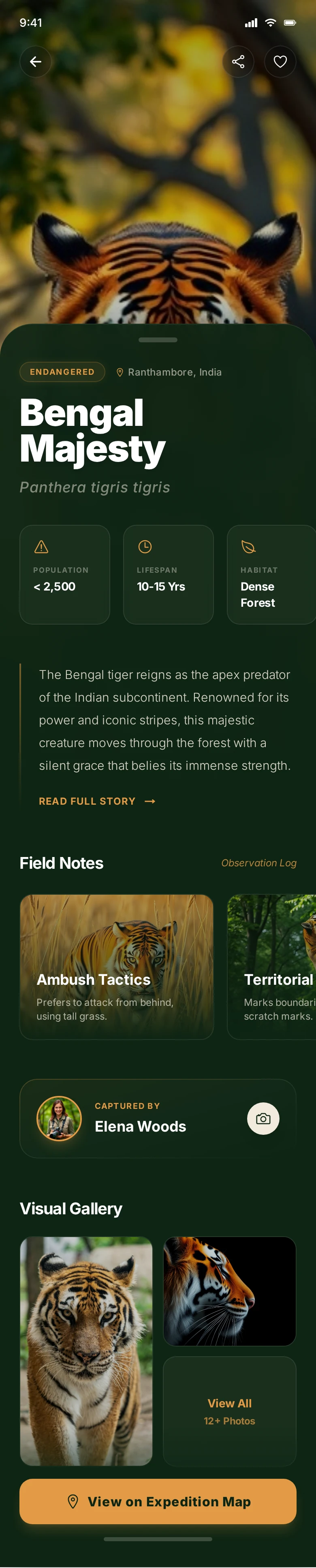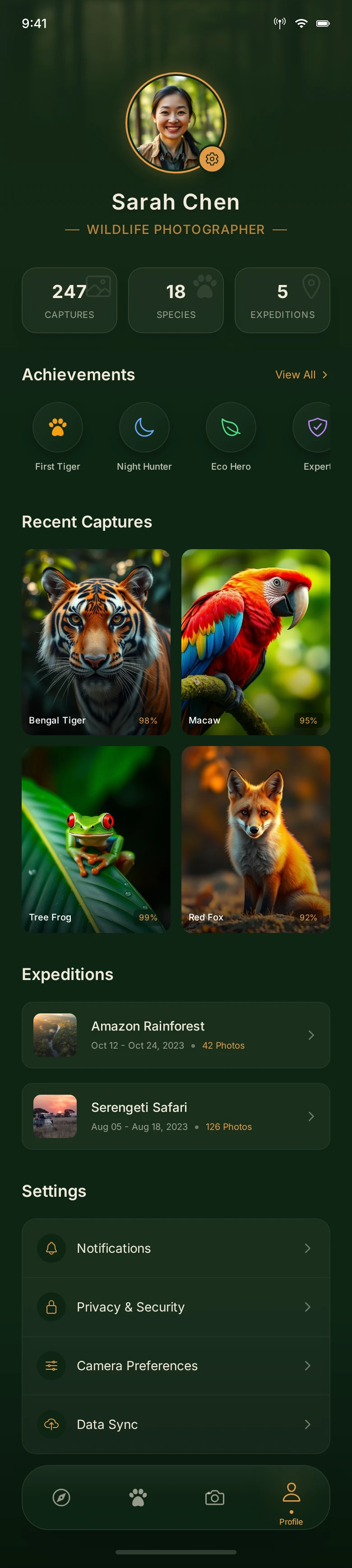 A wildlife photography mobile app showcasing cinematic nature photography. This case features a complete wildlife exploration experience including discovery home, wildlife detail, expedition map, paw guide, camera, and user profile pages, all designed with deep forest green base, warm sand, and amber accents.