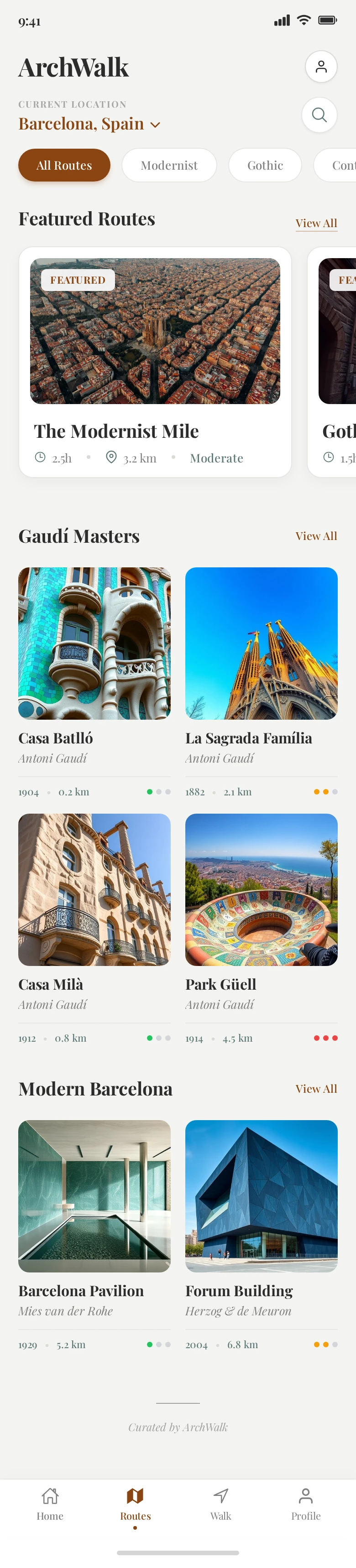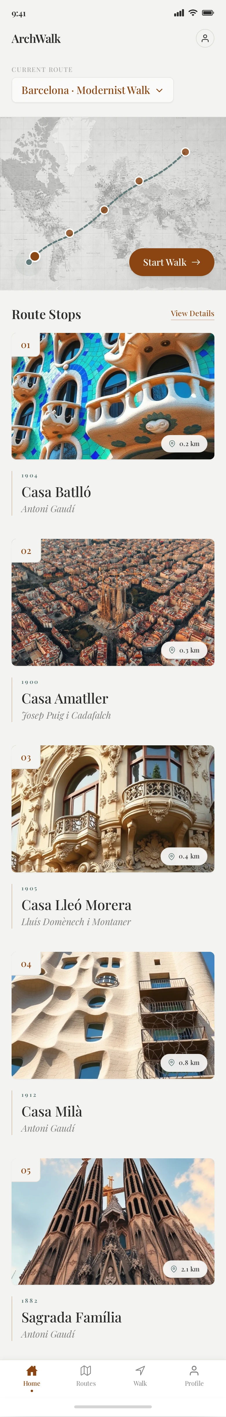 - Top: city and route selector (e.g., "Barcelona · Modernist Walk").