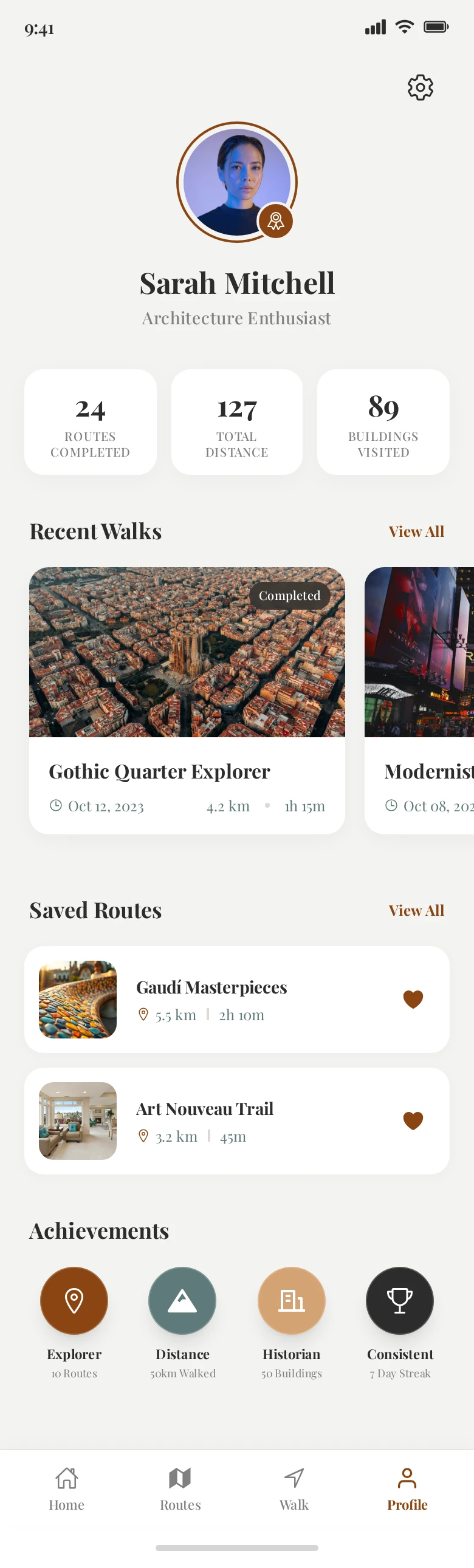 A city architecture walk mobile app helping users explore iconic buildings through curated walking routes. This case features a complete architecture exploration experience including home screen, routes, walk navigation, and profile pages, all designed with light warm gray background, deep brick red accents, and modern editorial typography.