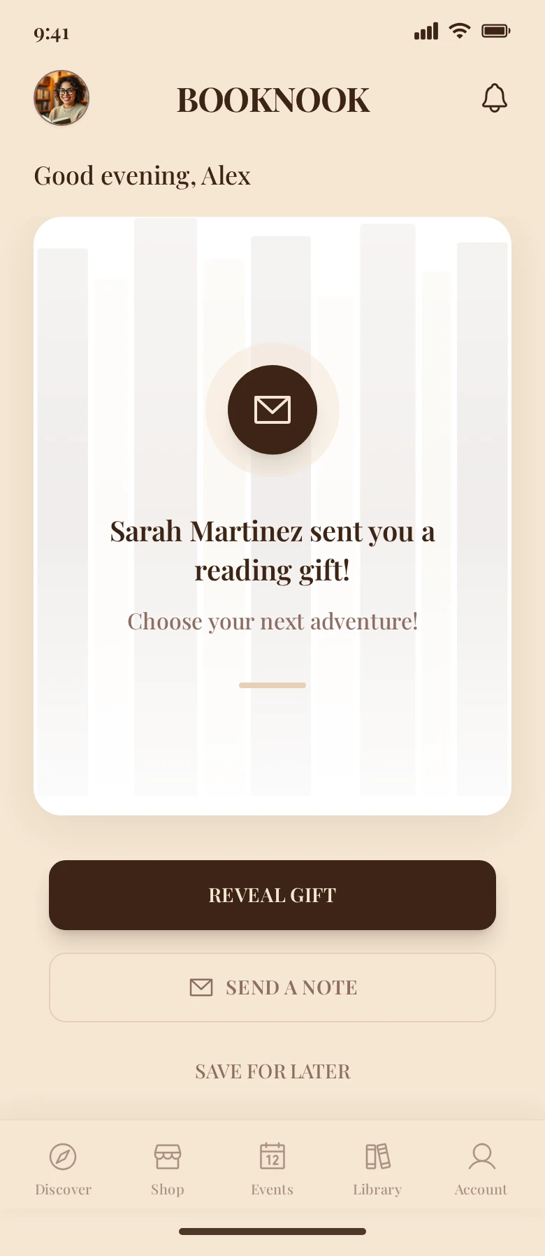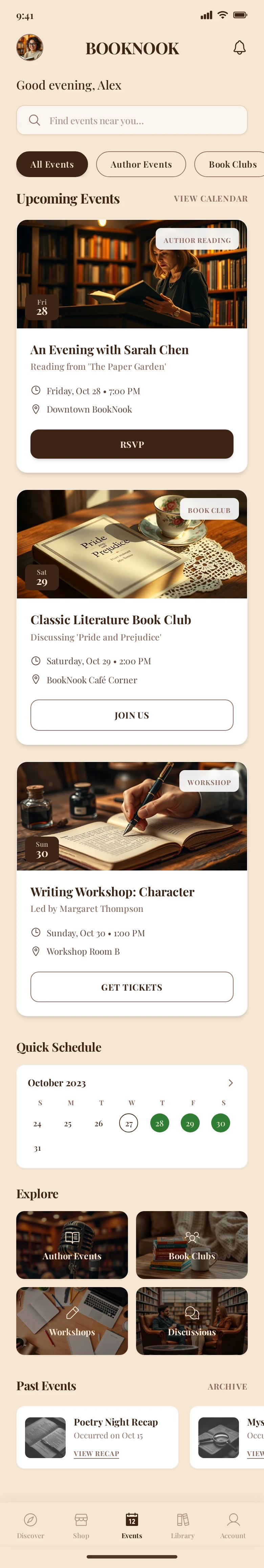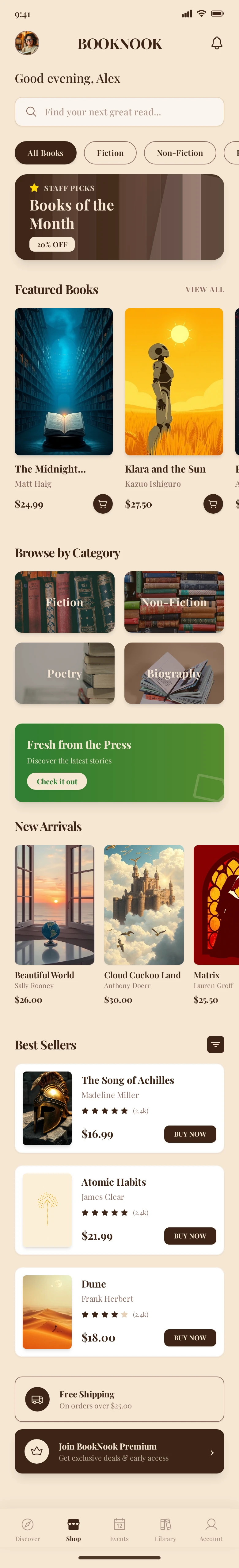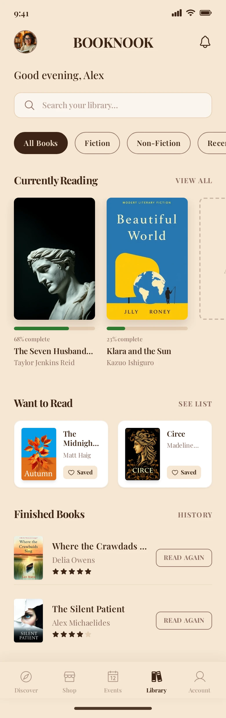 BookNook is an independent bookstore mobile app designed with a warm, literary atmosphere. This case showcases a complete bookstore app experience, including home reading dashboard, shop page, events page, personal library, order & hold status, and gift card features, in a cozy, bookish style with cream, brown, burgundy, and forest green color palette.