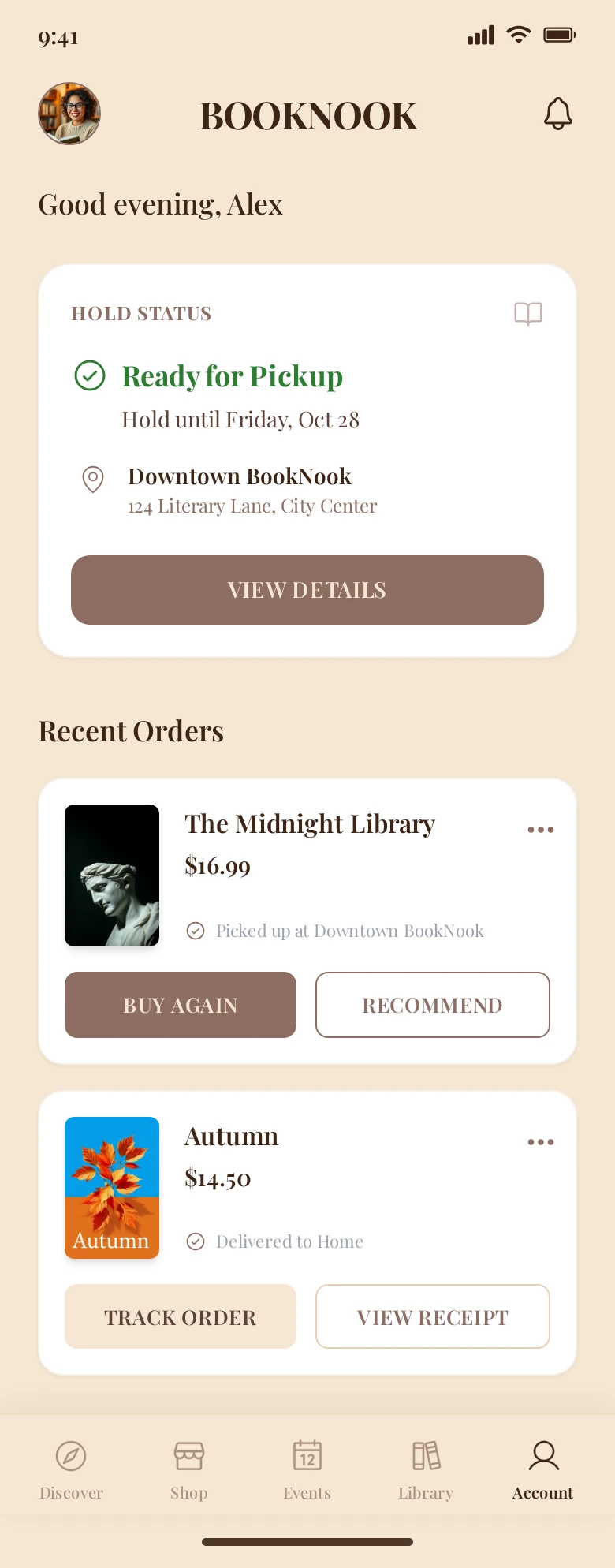 A Home Reading Dashboard for the independent bookstore mobile app called BookNook. Top left shows book icon logo, 'BOOKNOOK' in serif font. Top right displays user avatar. Personalized greeting 'Good evening, Alex'. 'What's new' section features: - Large card with cozy reading corner photo, stacked books, warm lighting - Overlay text 'Curl Up with Fall Favorites' and 'New Arrivals & Staff Picks' - 'BROWSE NOW' button in warm brown Second card shows author event promotion. 'Currently Reading' section shows book covers of in-progress reads with progress bars. 'Your Holds Ready' shows available pickup books. Warm, bookish color palette: cream, brown, burgundy, forest green. Bottom navigation: Discover, Shop, Events, Library, Account. Cozy, literary design with book-focused imagery.