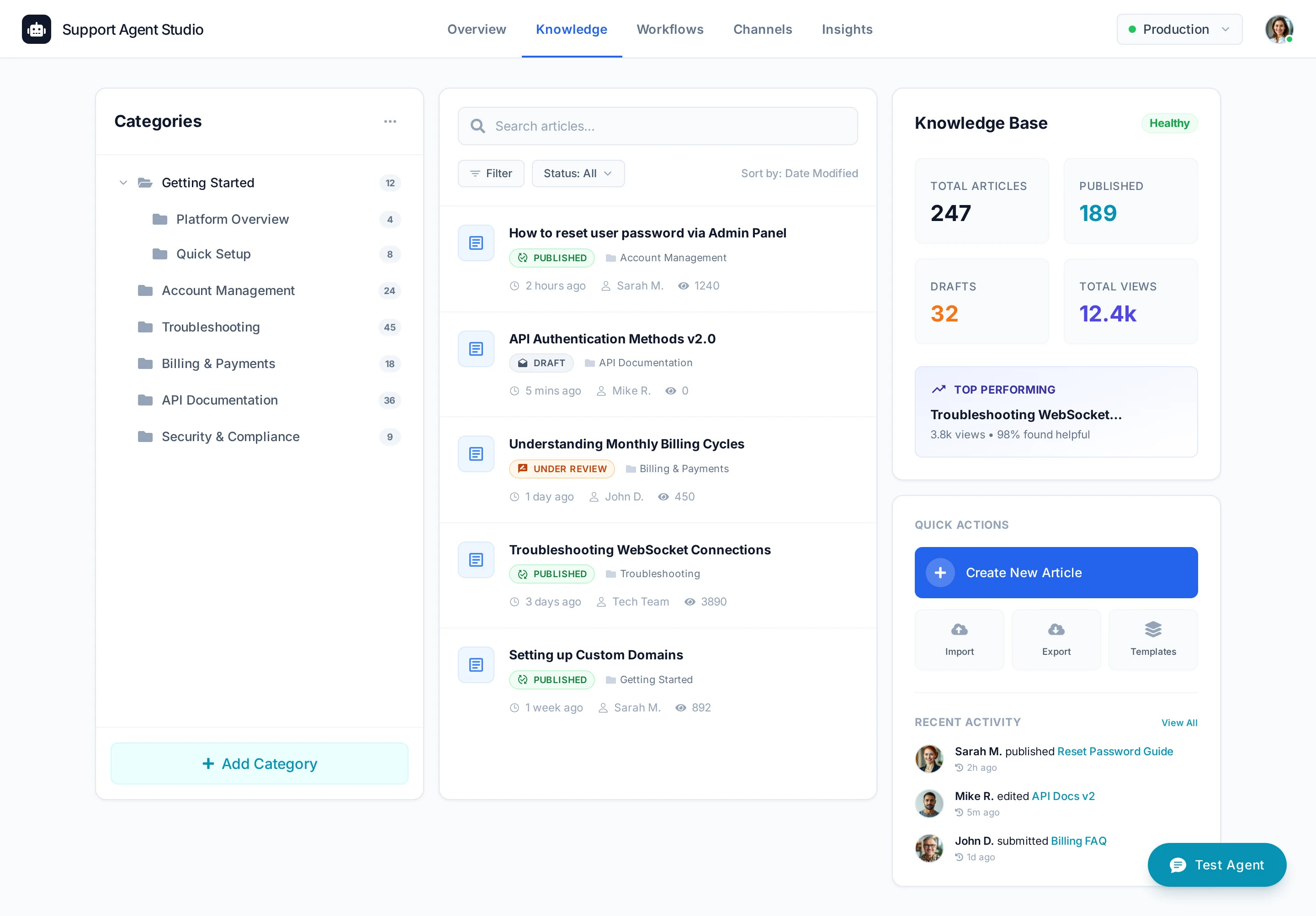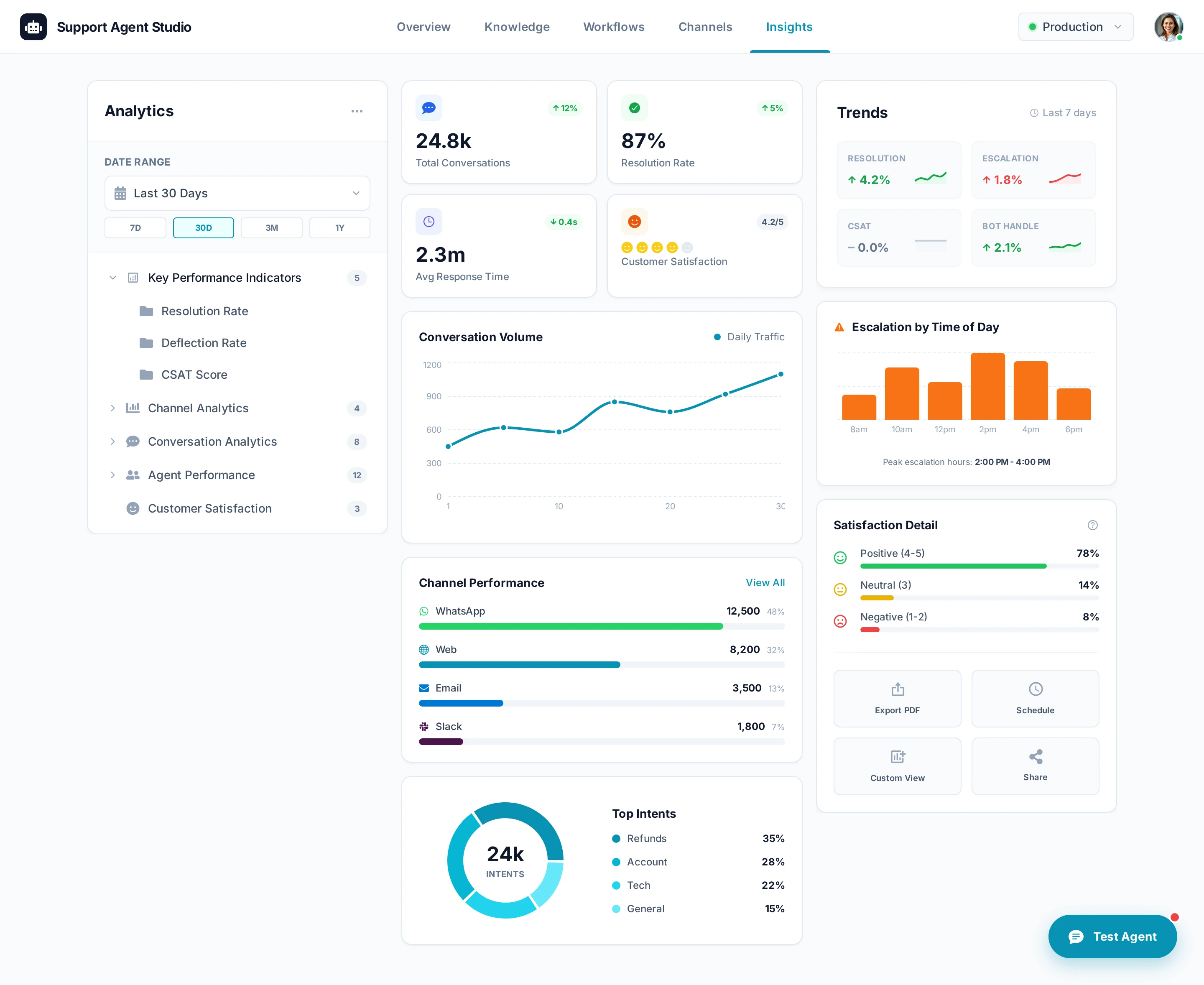 A desktop web app interface for configuring and monitoring an AI customer service agent. Features Support Agent Studio with overview dashboard, knowledge base, workflows, channels, and insights pages. Clean B2B SaaS design with light background, soft gray panels, and calm blue/teal accents.