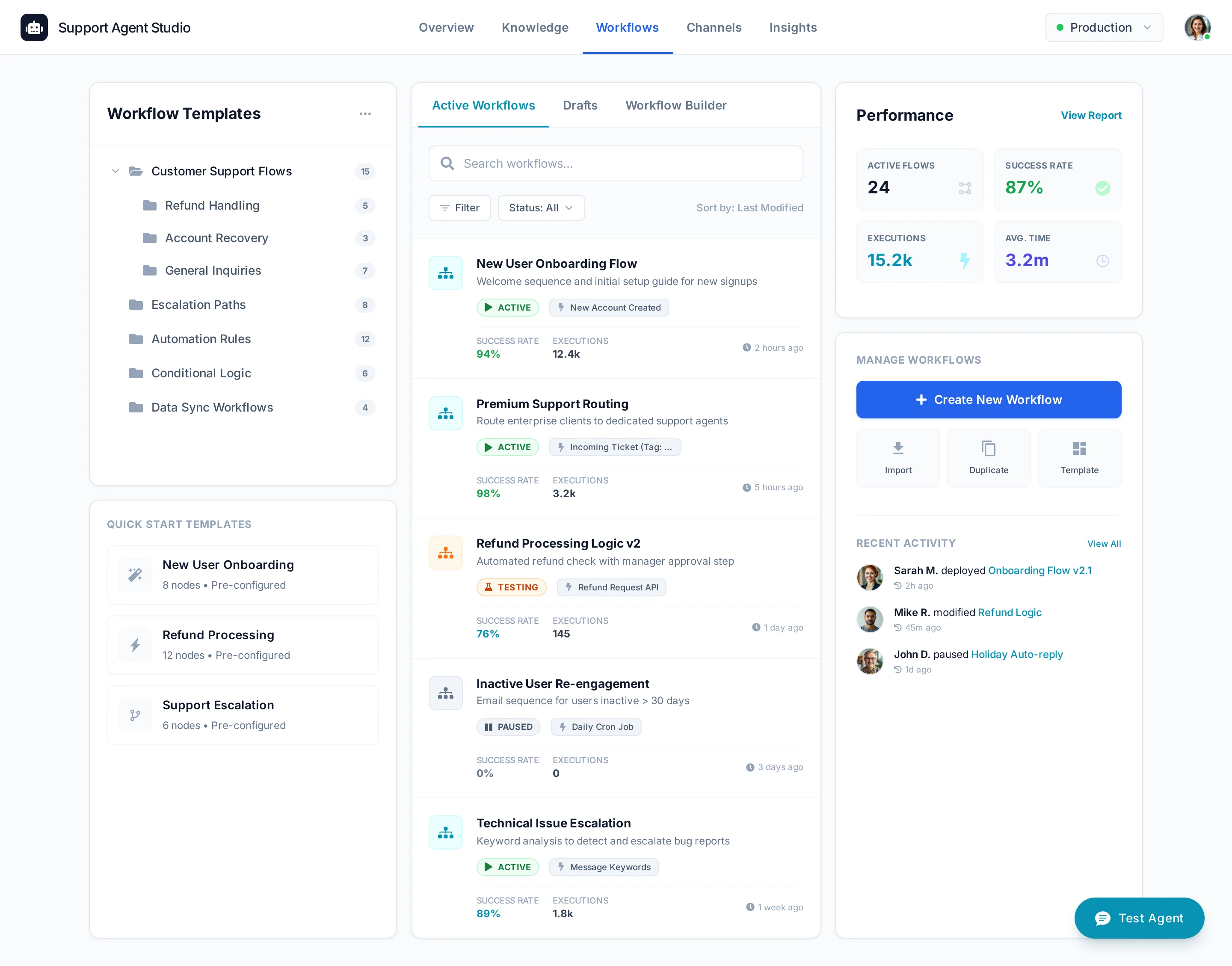 Let support leaders configure and monitor an AI customer service agent that resolves frontline queries across chat, email, and messaging channels, while handing off complex issues to humans.