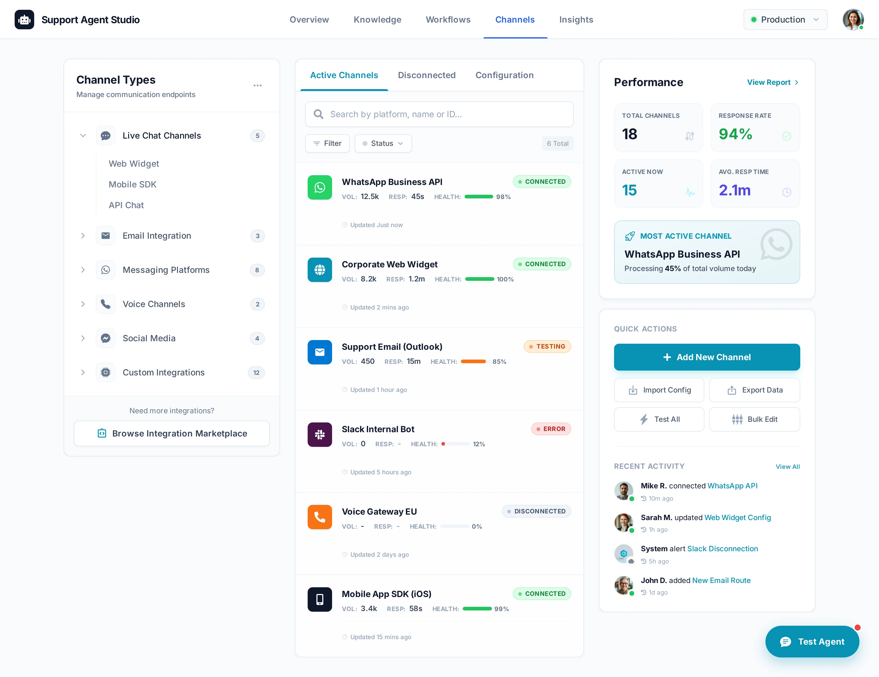 - Main tabs: Overview · Knowledge · Workflows · Channels · Insights