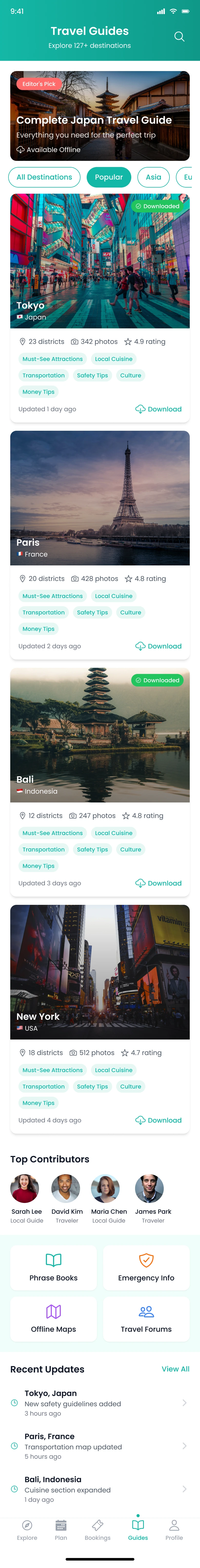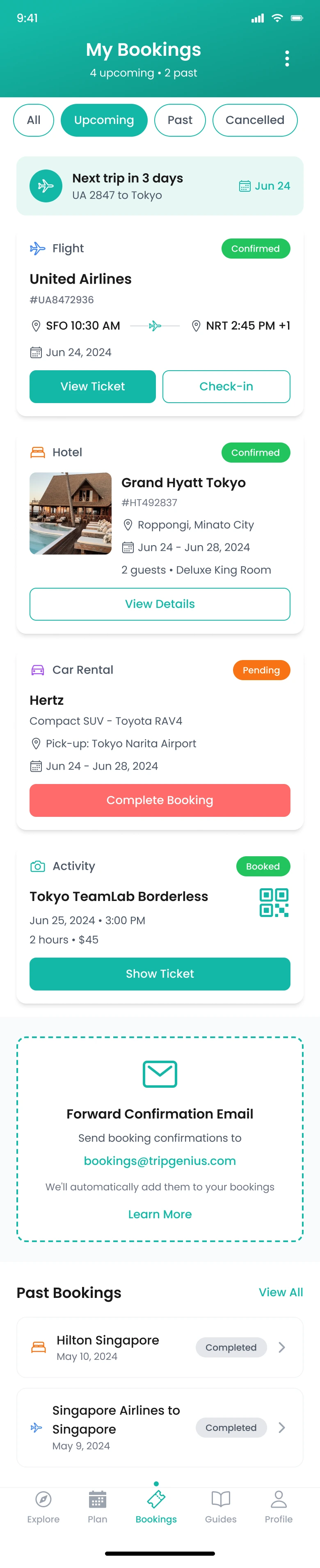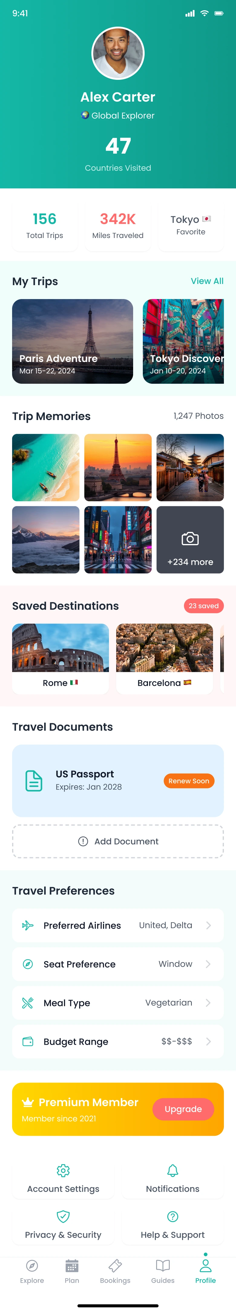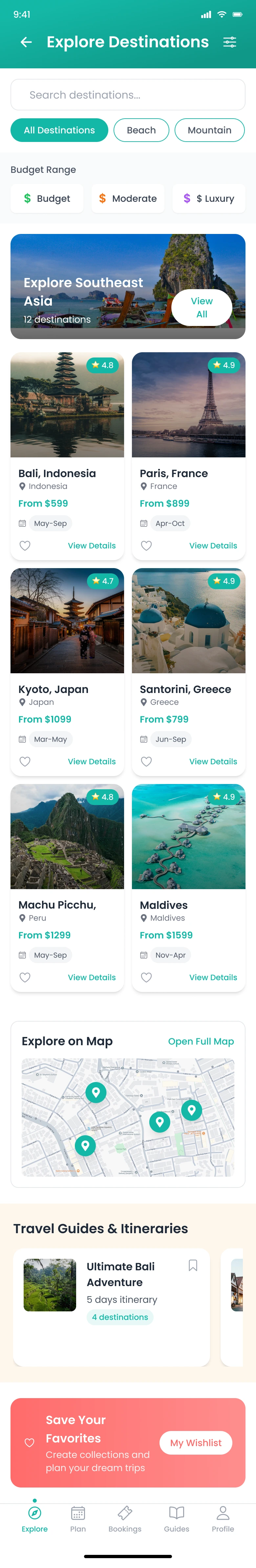 TripGenius is a travel planning app designed to help users explore destinations, build itineraries, manage bookings, and access travel guides. This case showcases a complete travel planning platform with vibrant travel theme using teal and coral colors, including home page, destination explorer, itinerary builder, booking hub, travel guides, and profile pages.