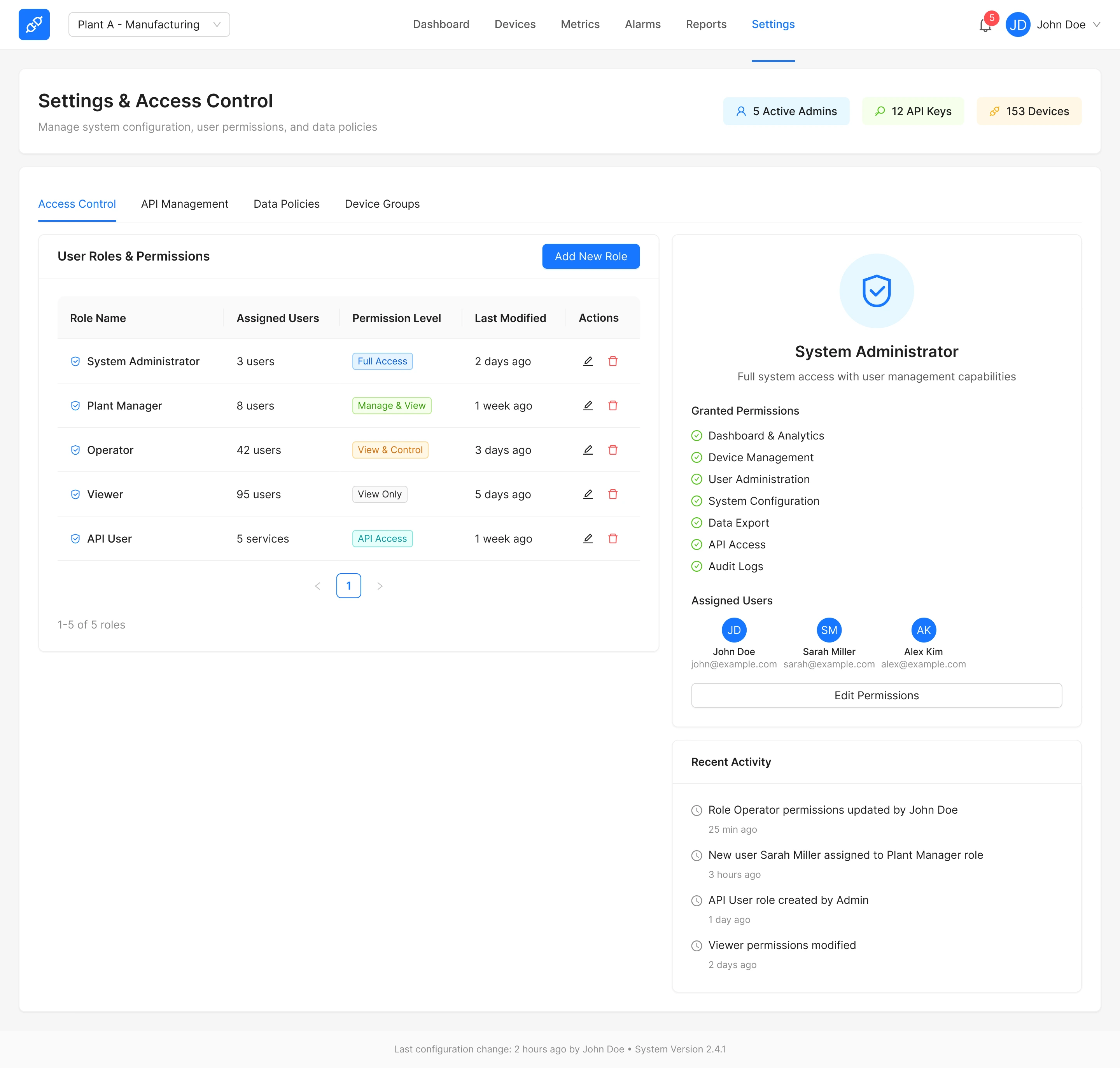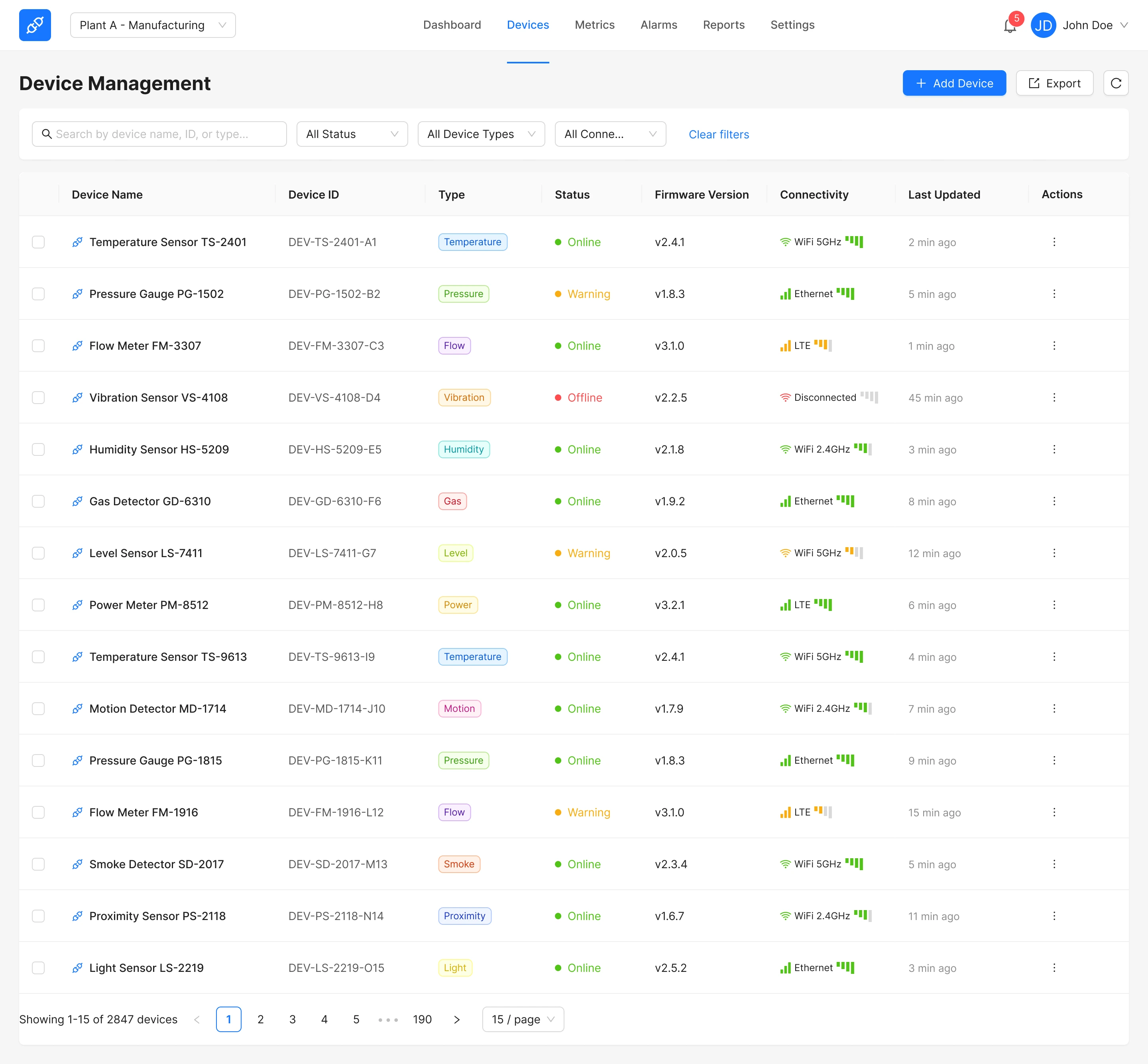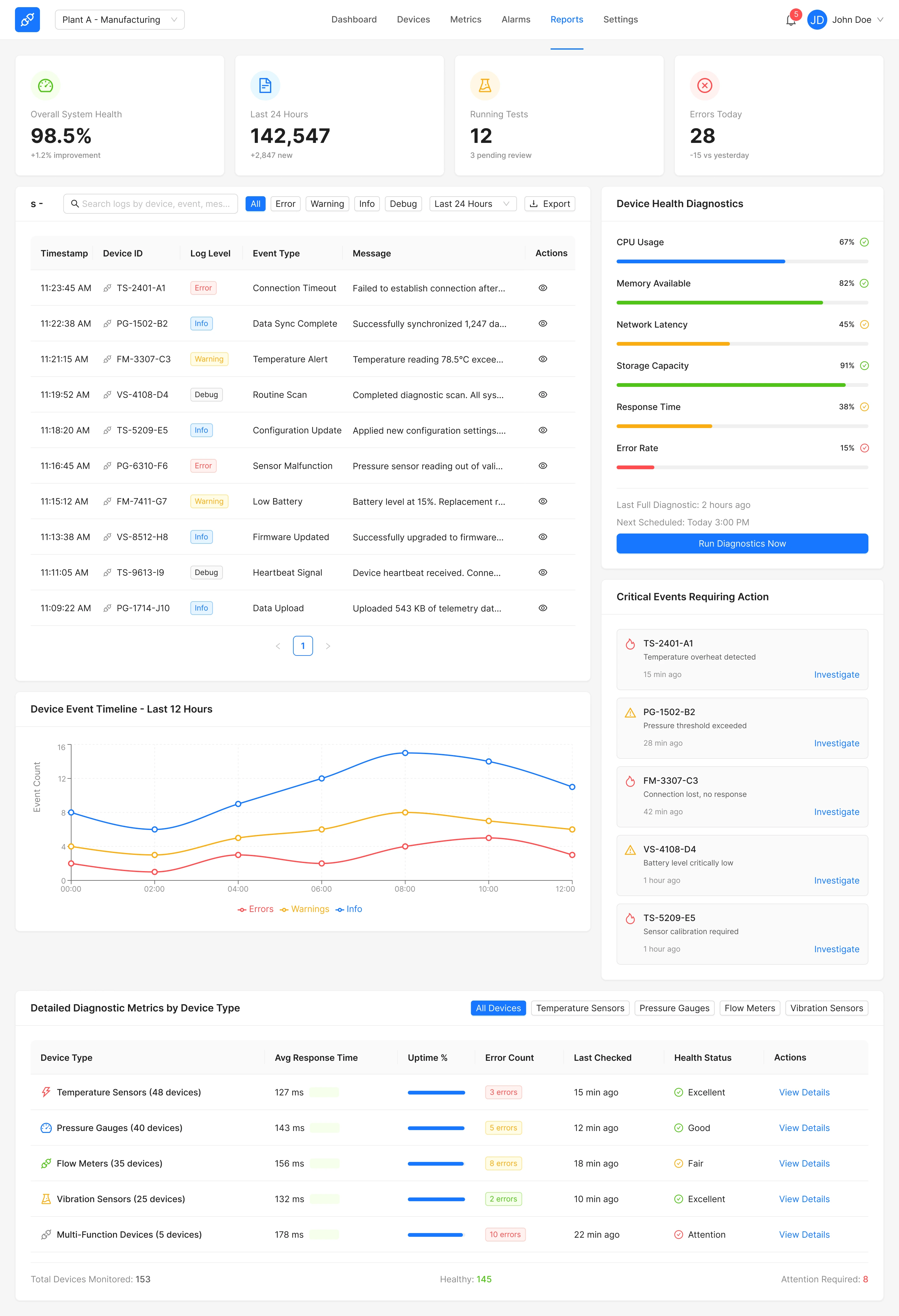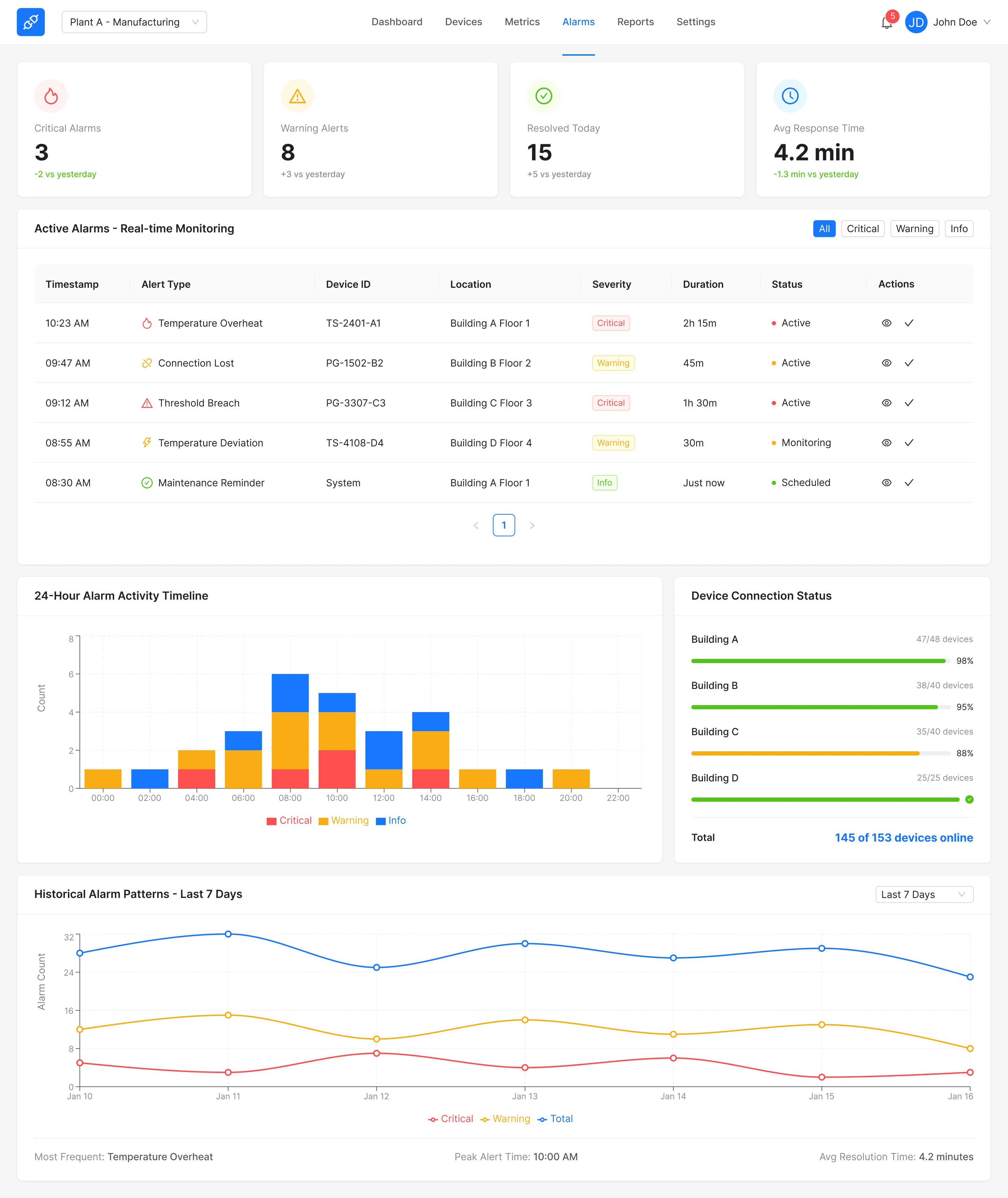 Top navigation shows Logo, Plant selector, main navigation (Dashboard / Devices / Metrics / Alarms / Reports / Settings), notifications, user menu.