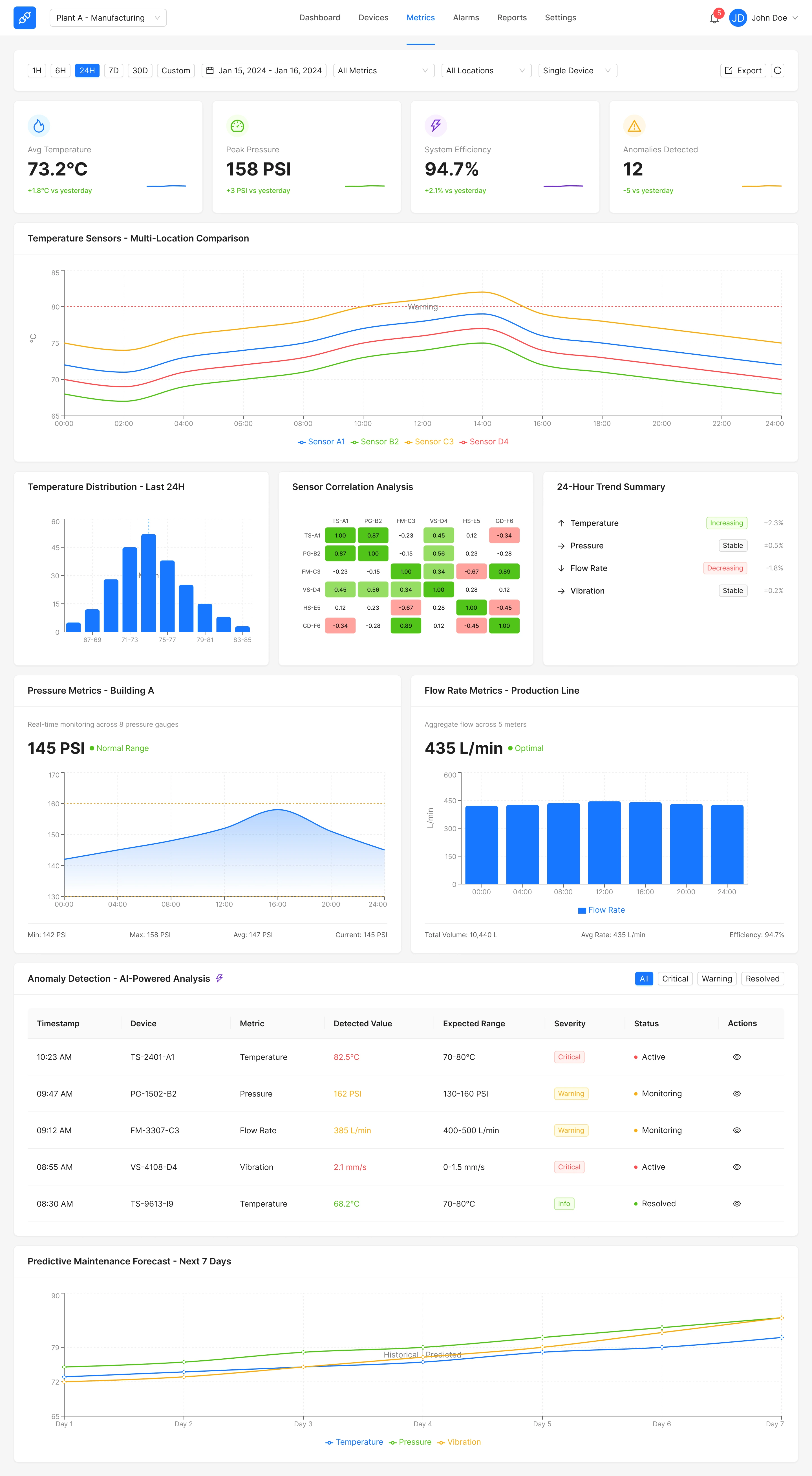 Main content shows sensor KPIs, device uptime, temperature/pressure charts, and real-time device status grid.