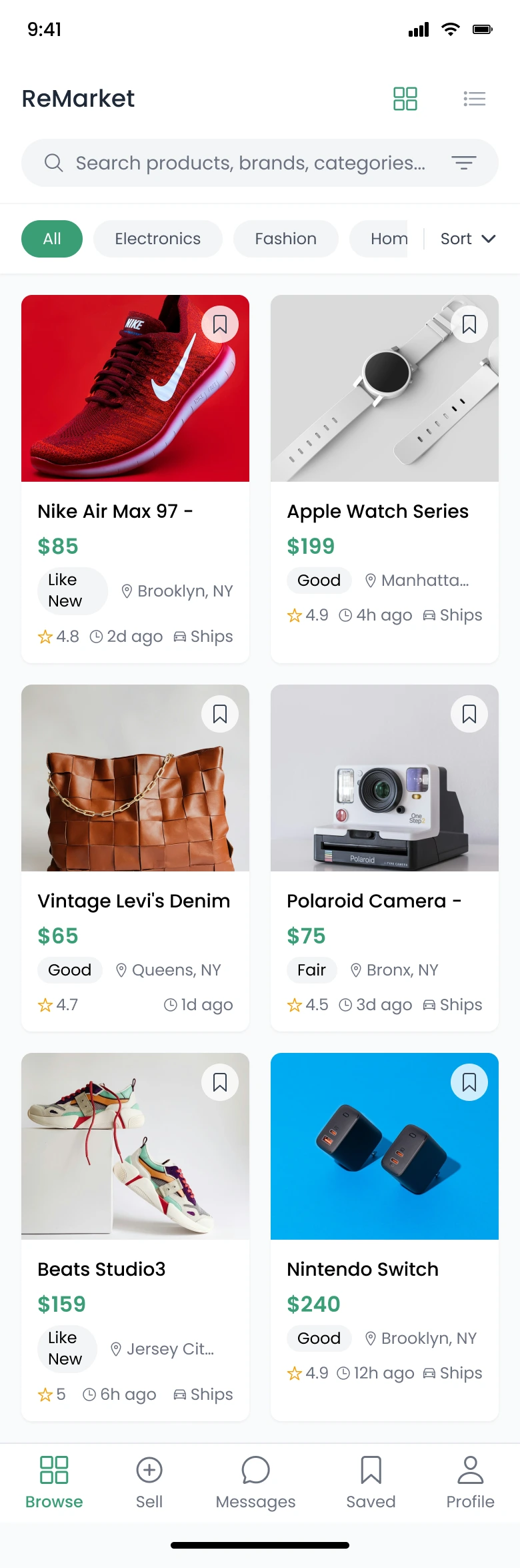 I need a secondhand marketplace app called ReMarket. Start with the home page:
