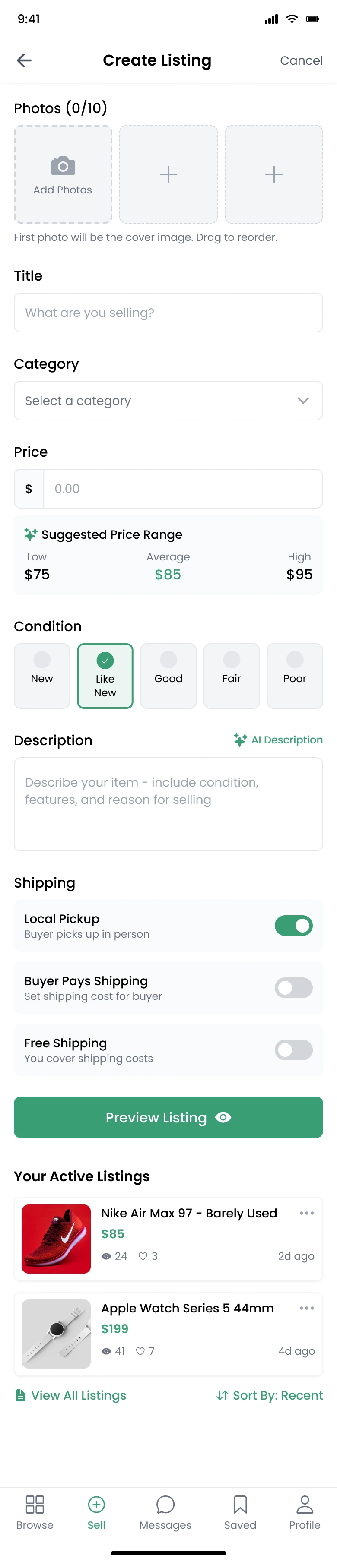 ReMarket is a secondhand marketplace app designed to help users buy and sell used items locally. This case showcases a complete marketplace platform with clean marketplace design and green sustainability theme, including browse page, product listings, selling interface, messaging, saved items, and profile pages, referencing Depop and Mercari.