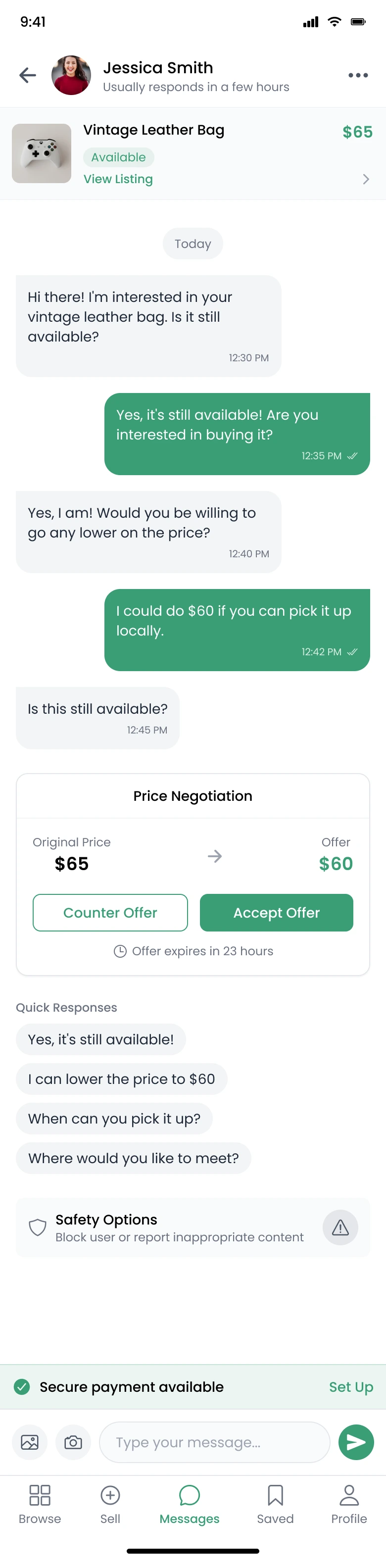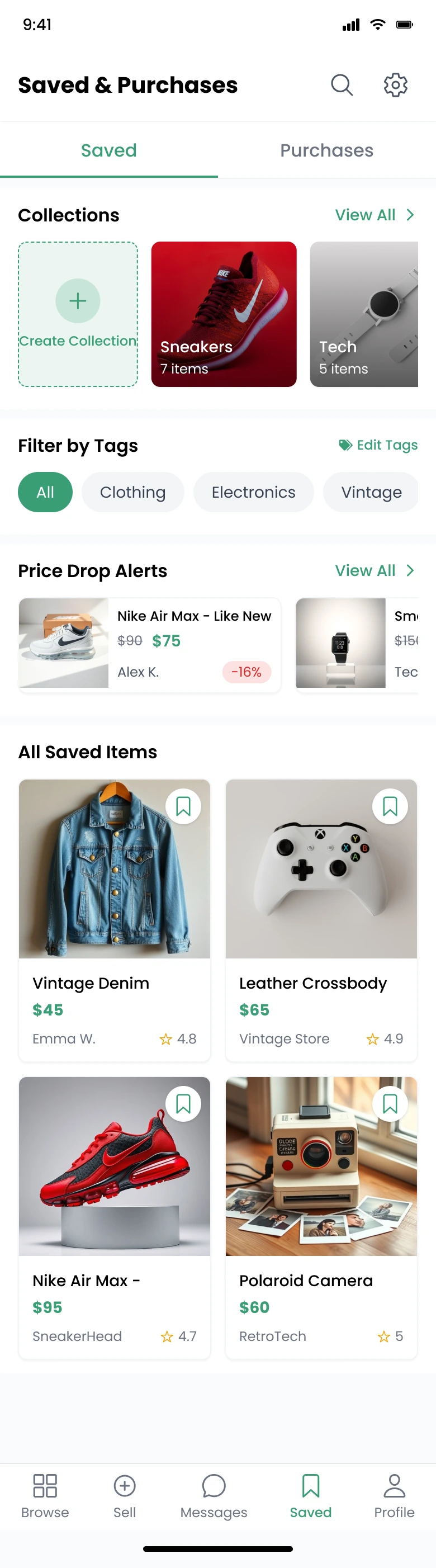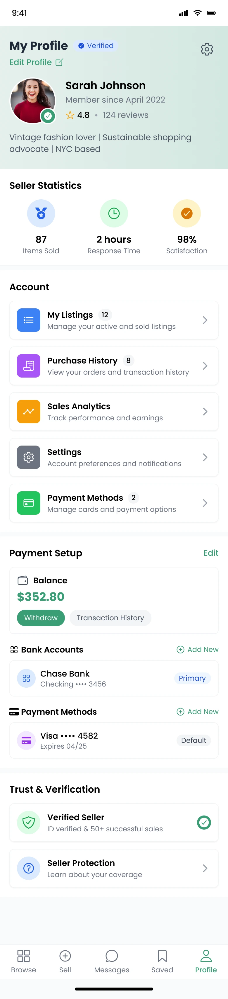 Bottom nav: Browse, Sell, Messages, Saved, and Profile (current: Browse).