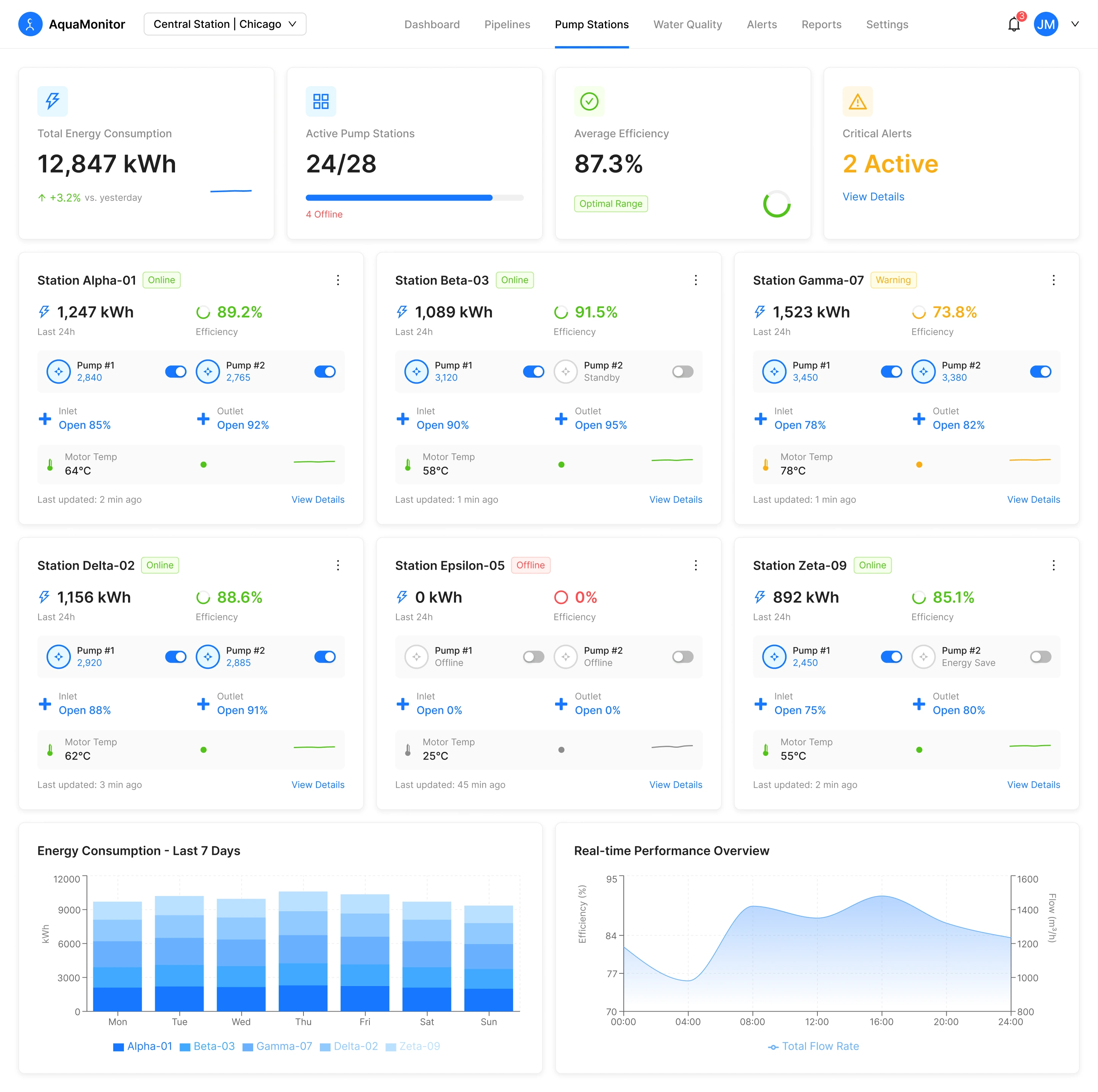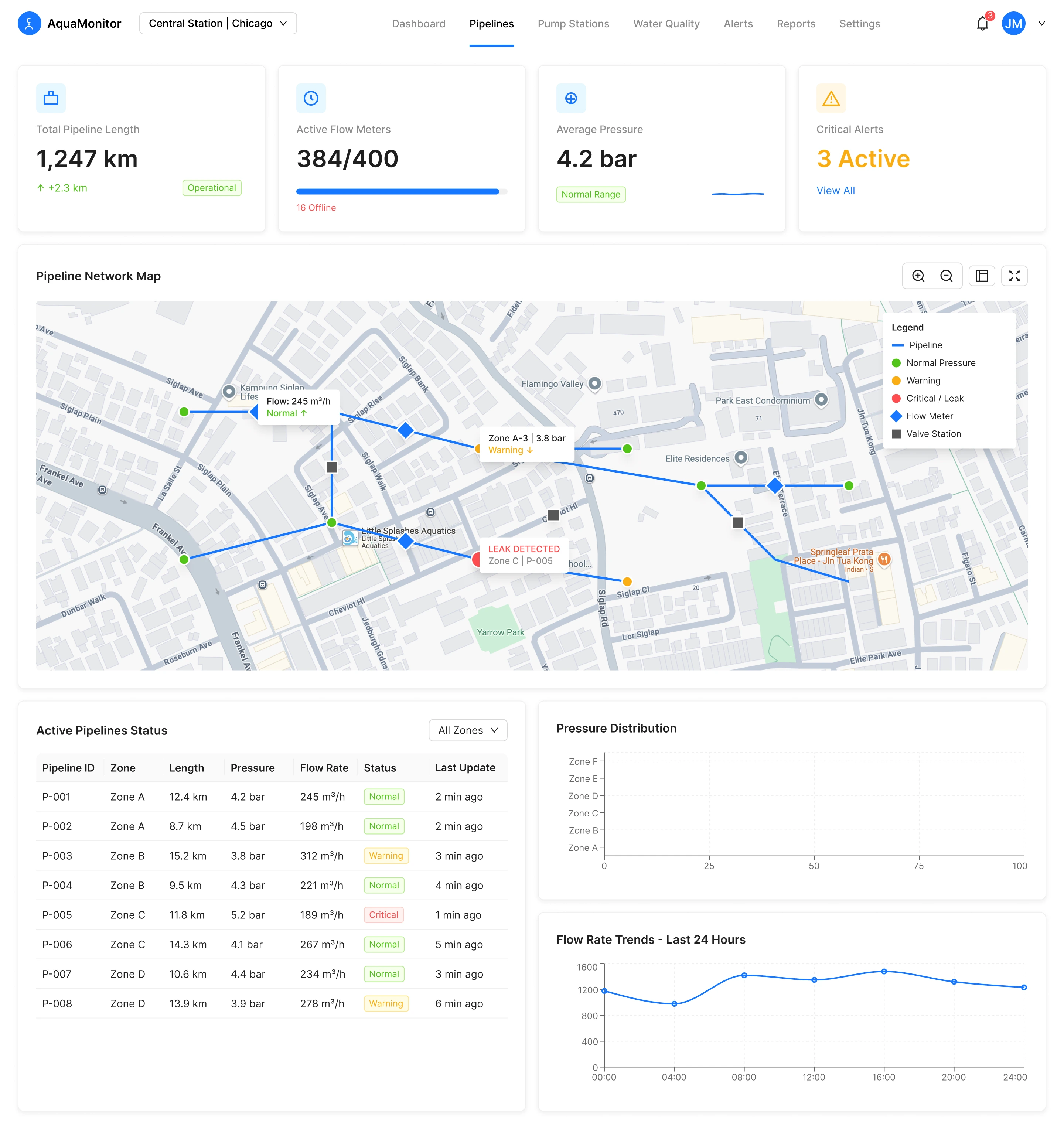 Top navigation shows Logo, Site selector, main navigation (Dashboard / Pipelines / Pump Stations / Water Quality / Alerts / Reports / Settings), notifications, user menu.