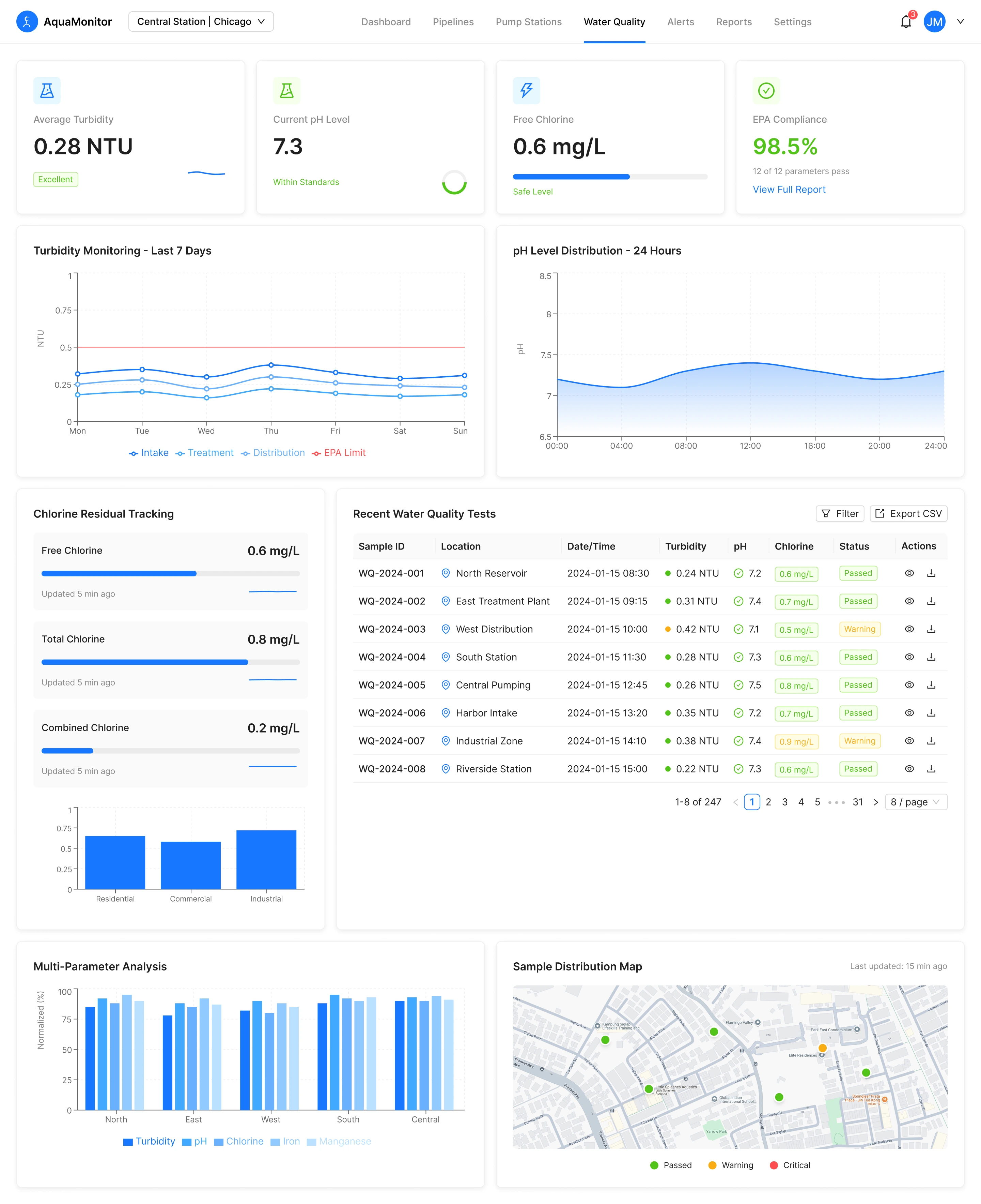 A Dashboard Overview Page for the web-based Water Utility Monitoring System.
