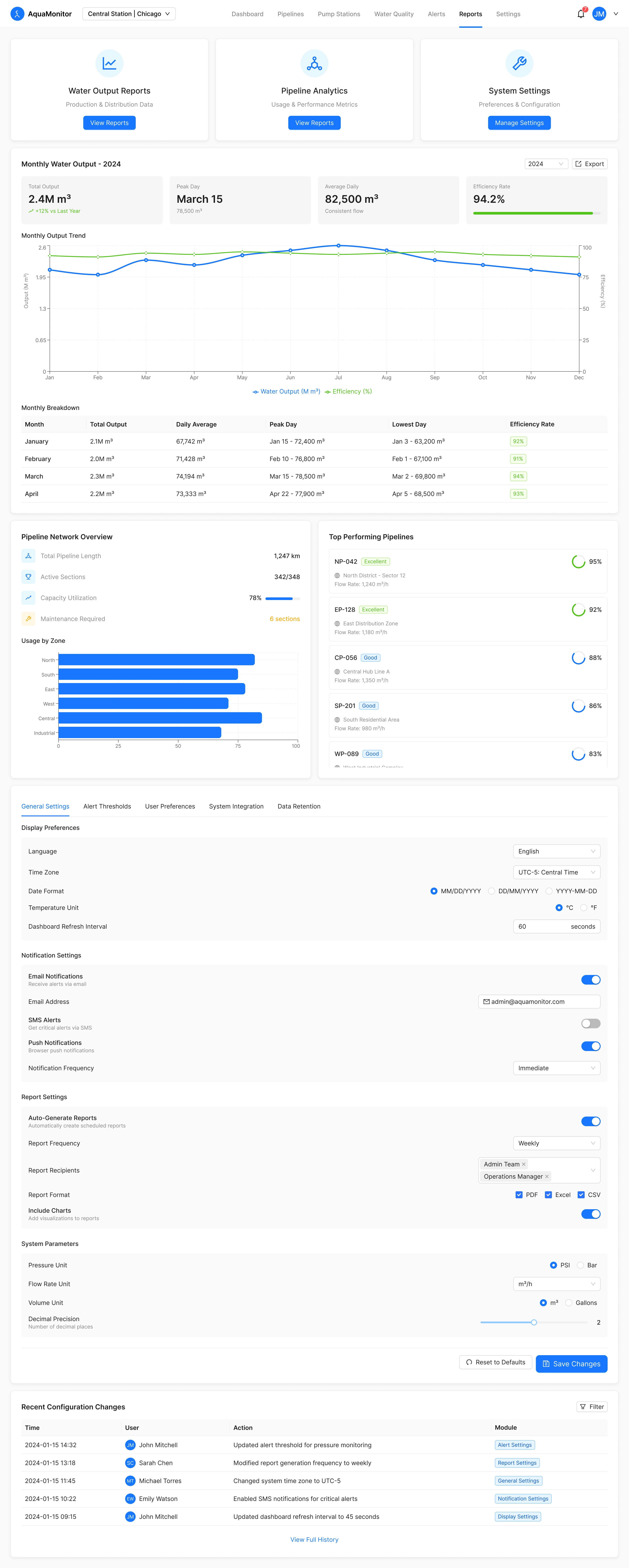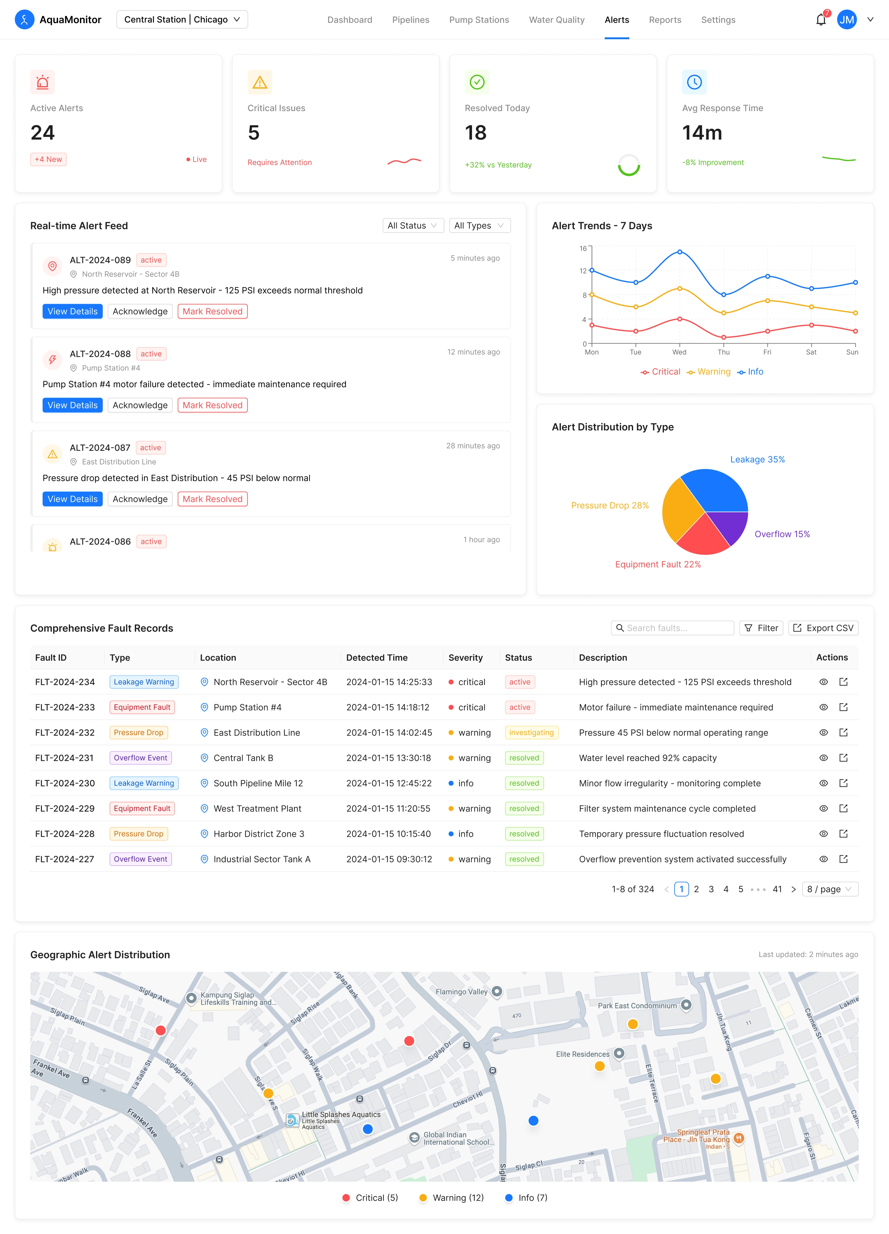 Water Utility Monitoring System is a web-based utility management platform designed for comprehensive water infrastructure monitoring. This case showcases a complete utility monitoring system with clean blue-white theme resembling water clarity, including dashboard overview, pipeline monitoring with maps, pump station management, water quality inspection, alerts and fault records, and reports and configuration pages.