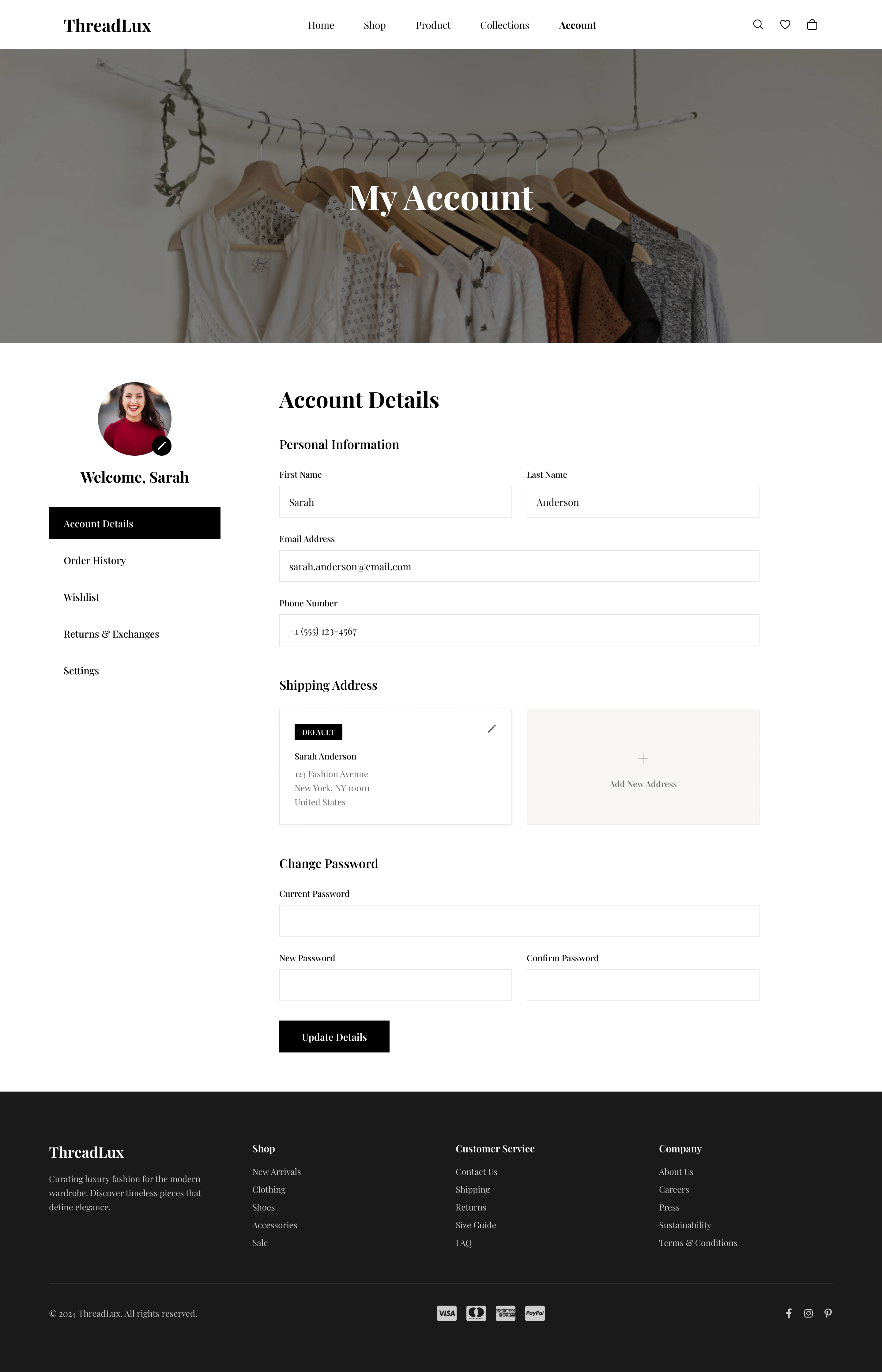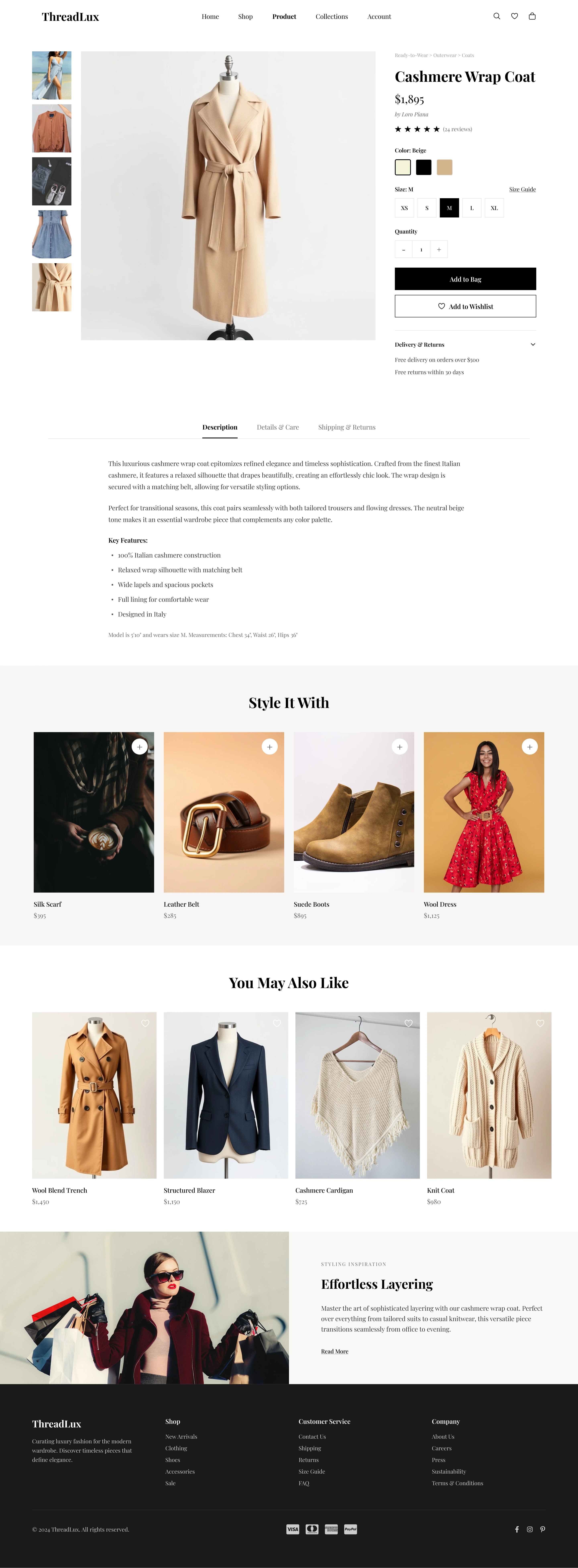 ThreadLux is an e-commerce website designed to drive browsing and purchases of luxury fashion items. This case showcases a complete fashion retail site, including homepage, shop catalog, product detail pages, seasonal collections, and account management pages, with a luxury fashion, editorial photography and minimal interface style, referencing Net-a-Porter.