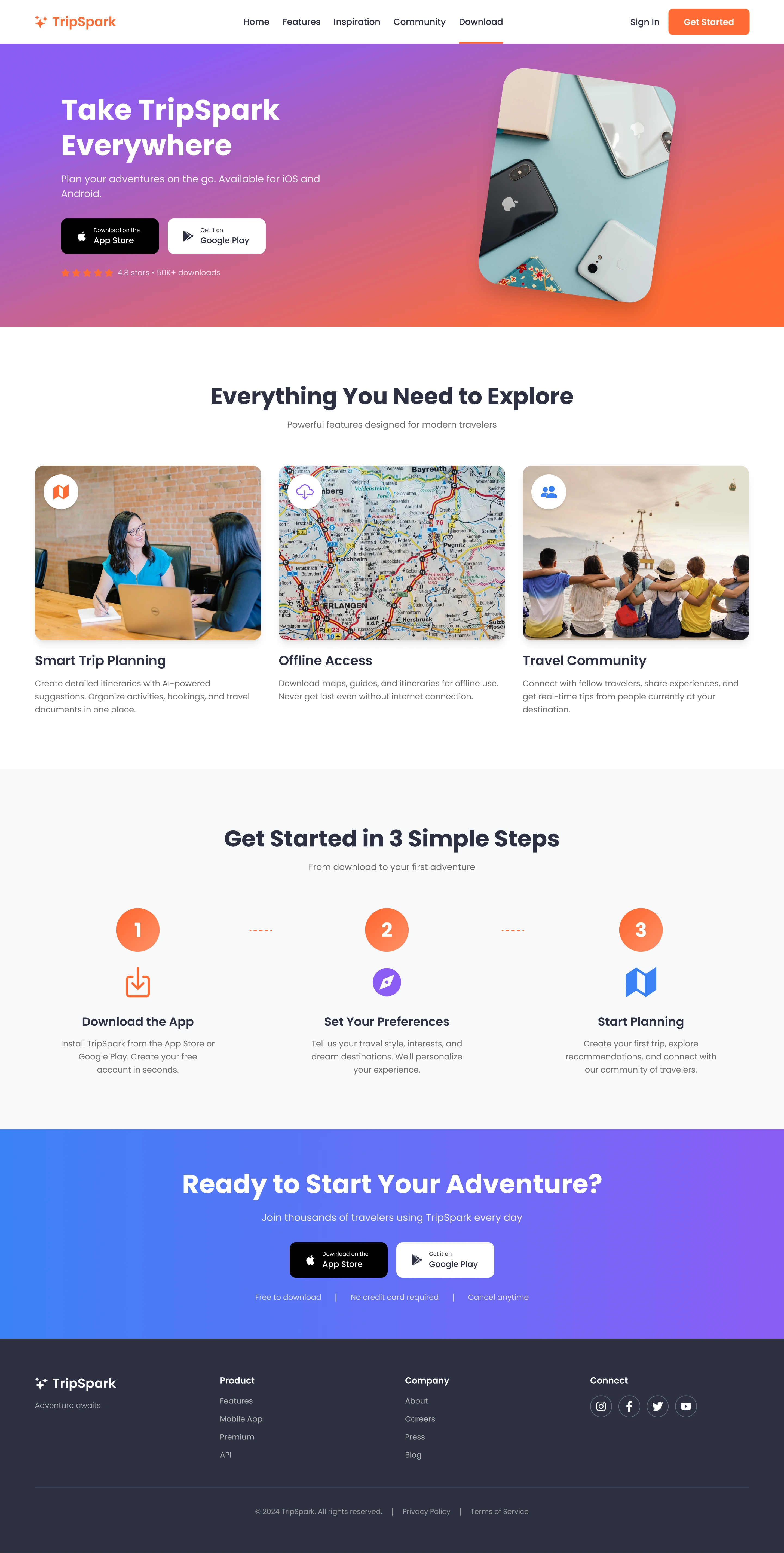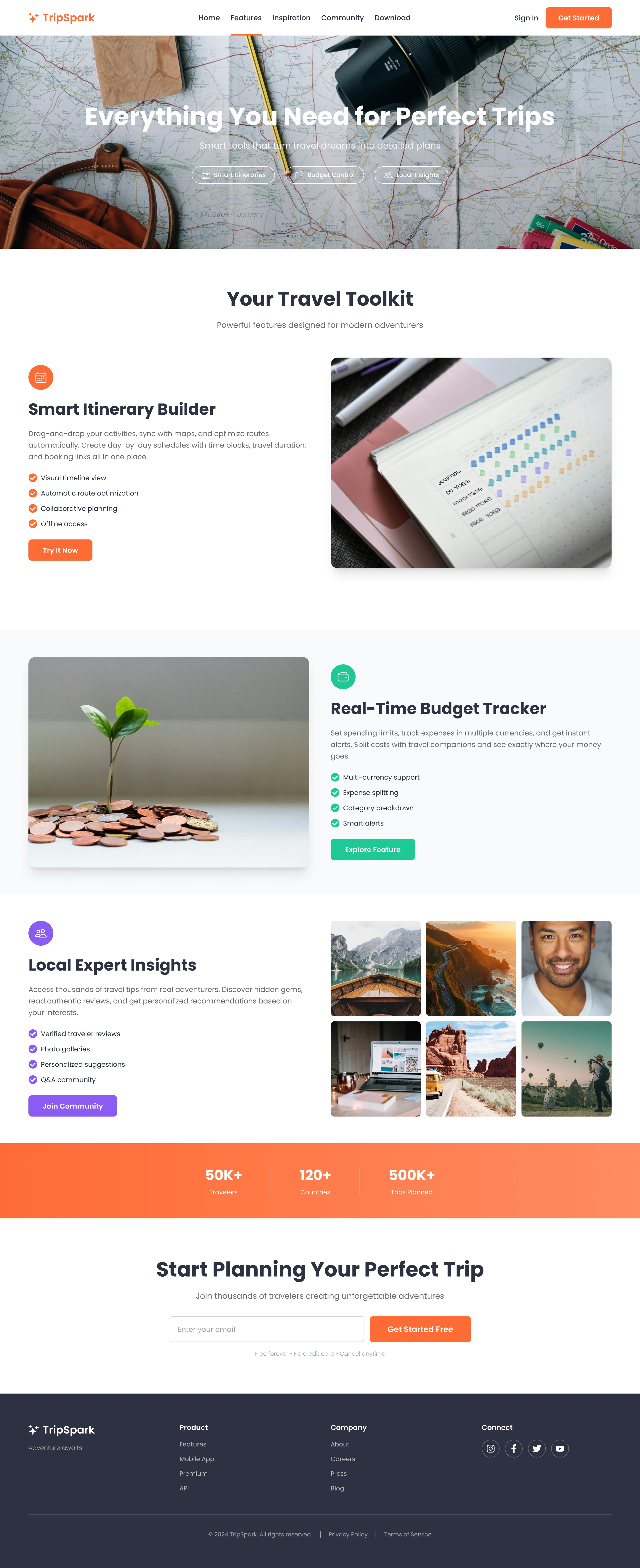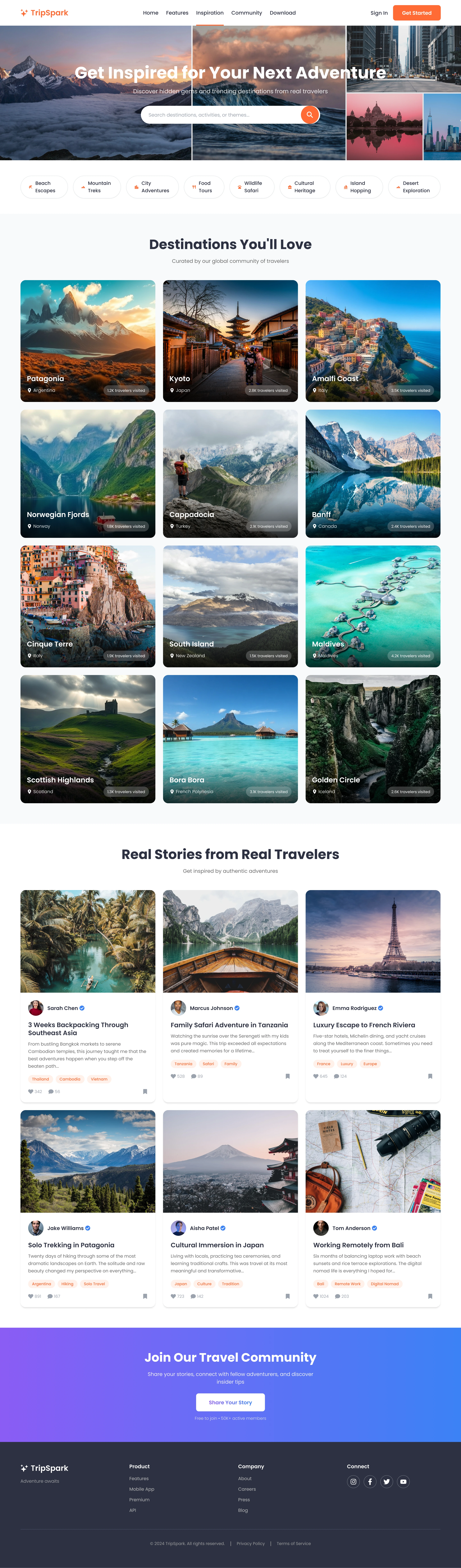 TripSpark is a travel planning website designed to drive account creation. This case showcases a complete travel platform, including homepage, planning features, destination inspiration, community content, and app download pages, with an adventurous, colorful and photo-centric style, referencing Airbnb.