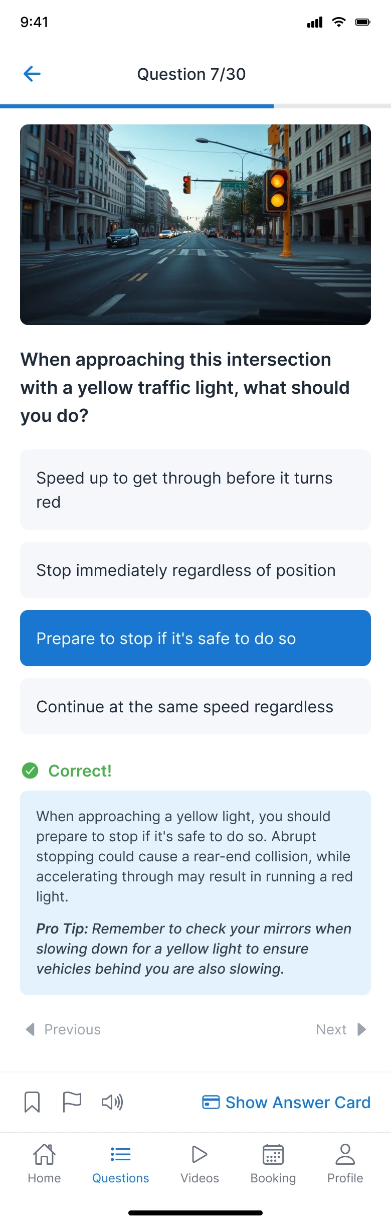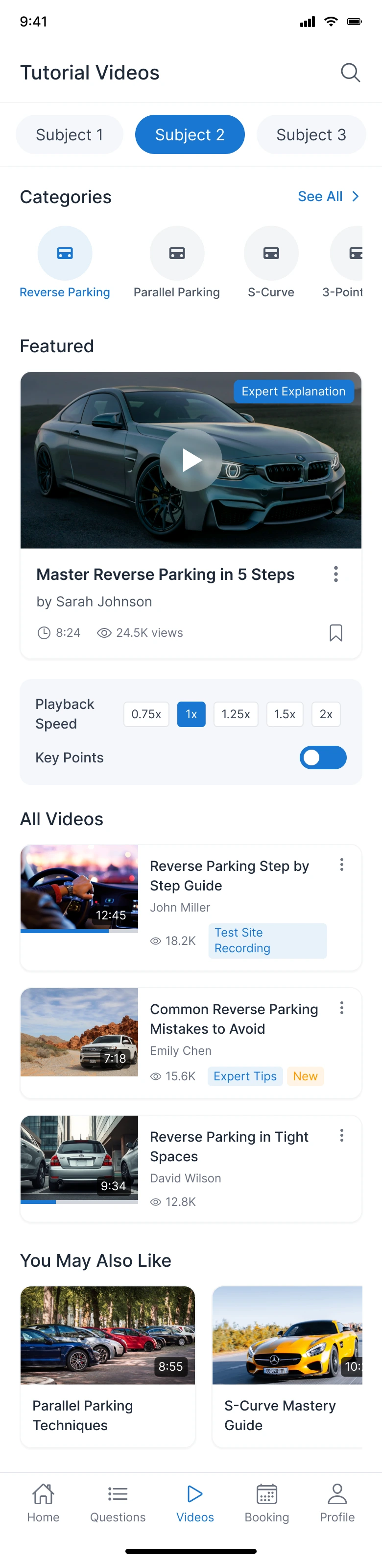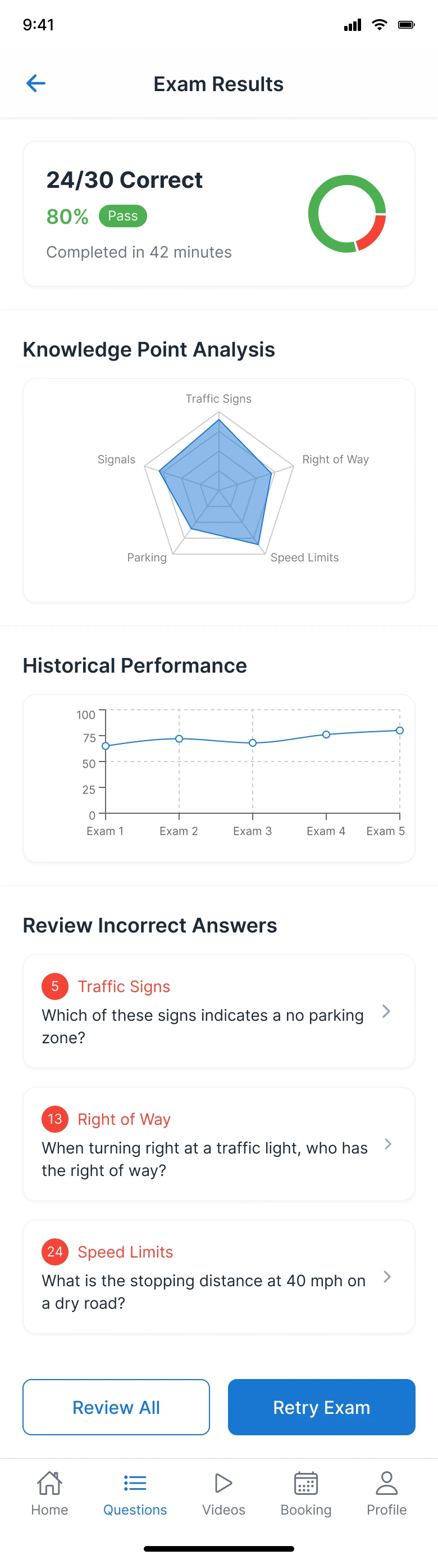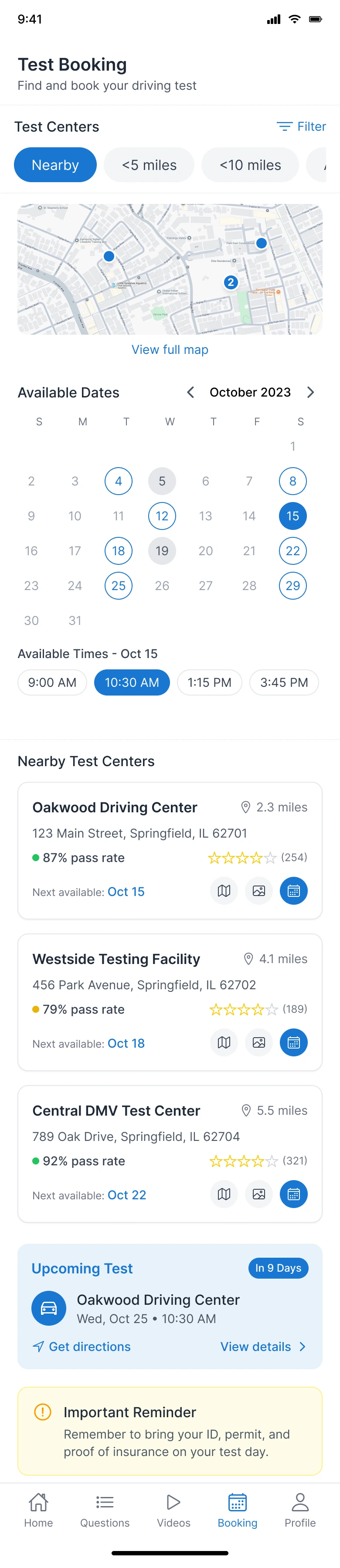 DriveTest is a driving test prep app designed to help users study for driving tests with practice questions, tutorial videos, and mock exams. This case showcases a complete test preparation platform with educational blue-orange theme, including home page, question practice, mock exam, tutorial videos, test booking, and profile pages, referencing DMV Genie.