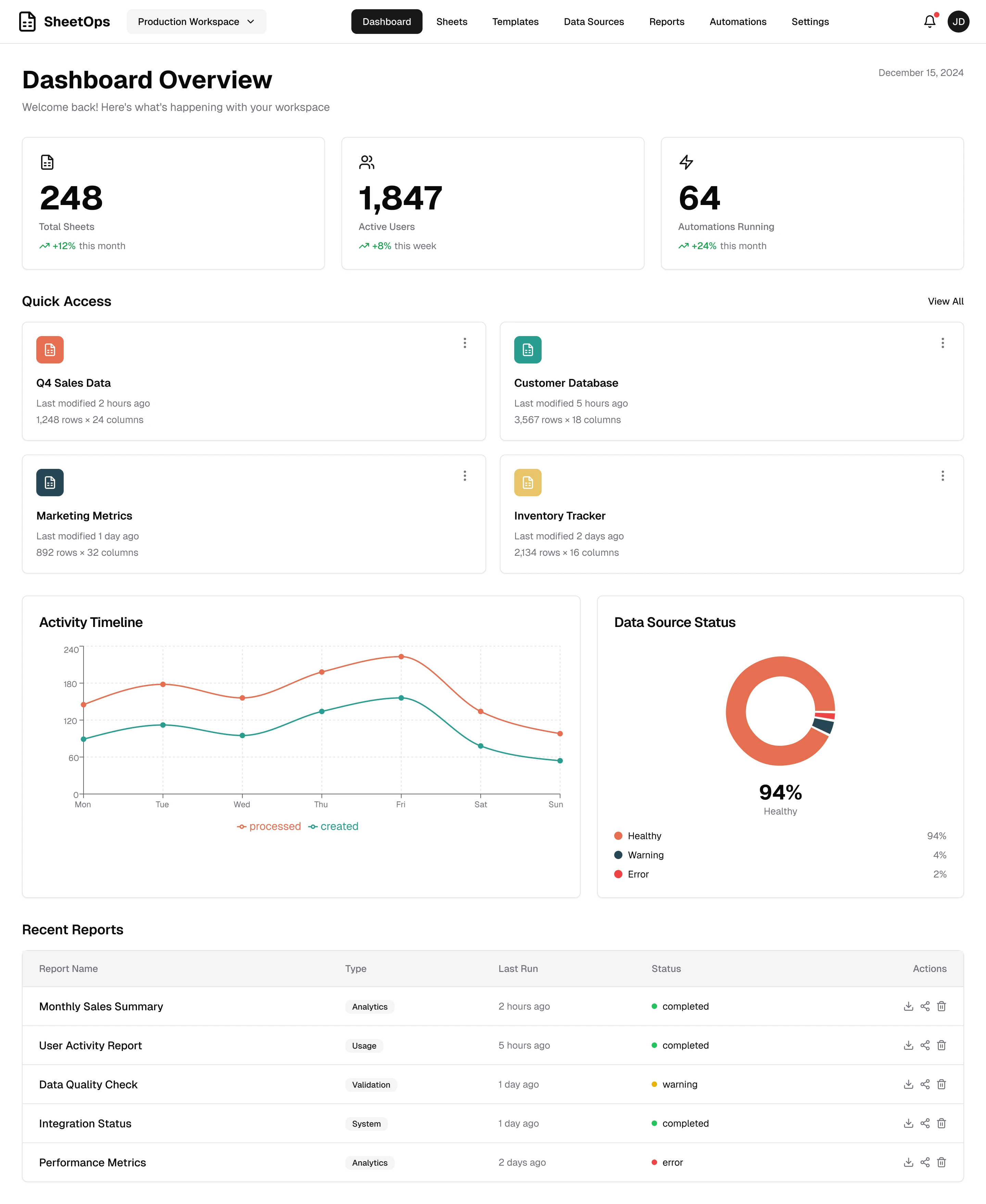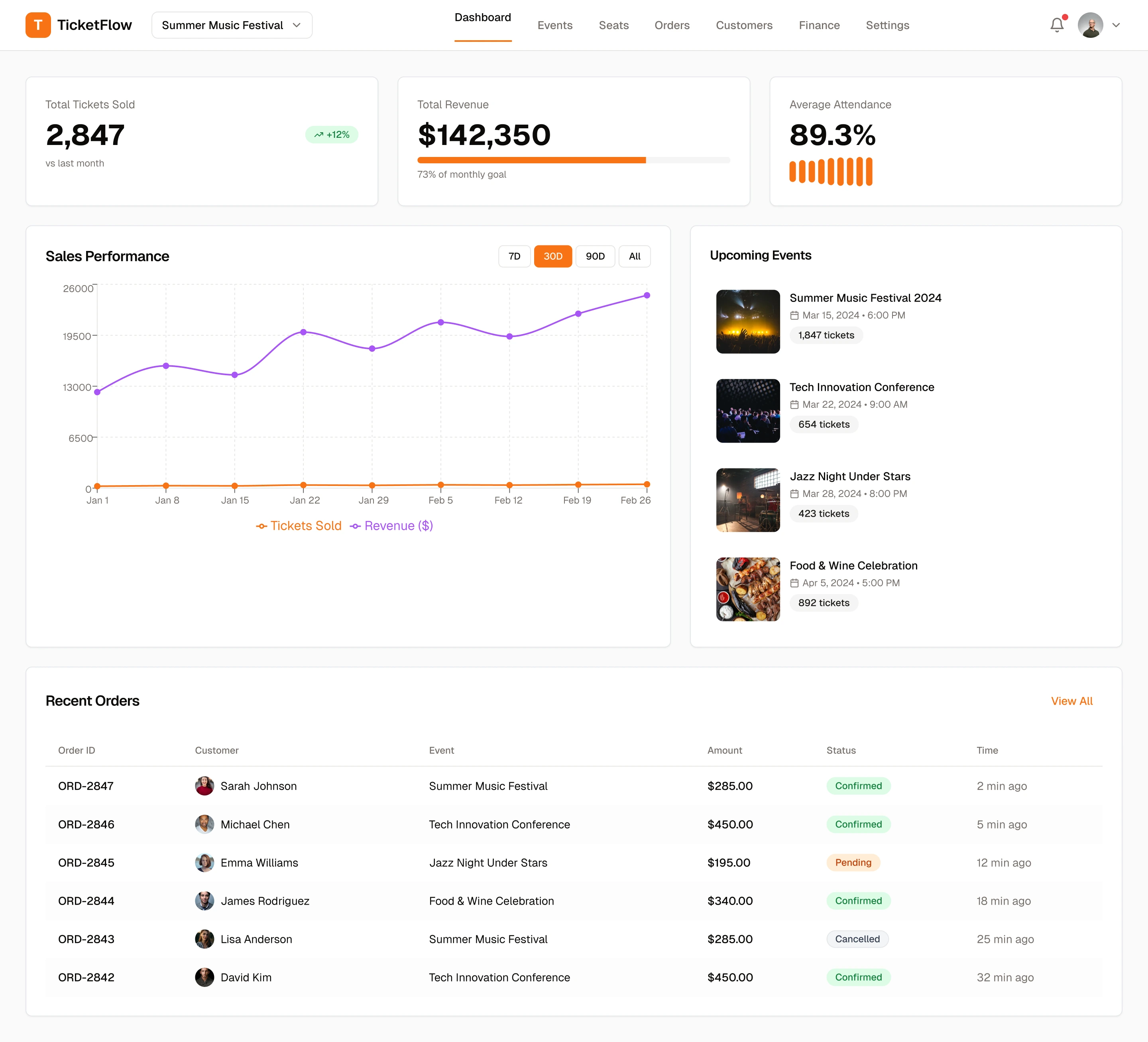 Main content shows sales overview charts, KPI cards, and recent activity logs.