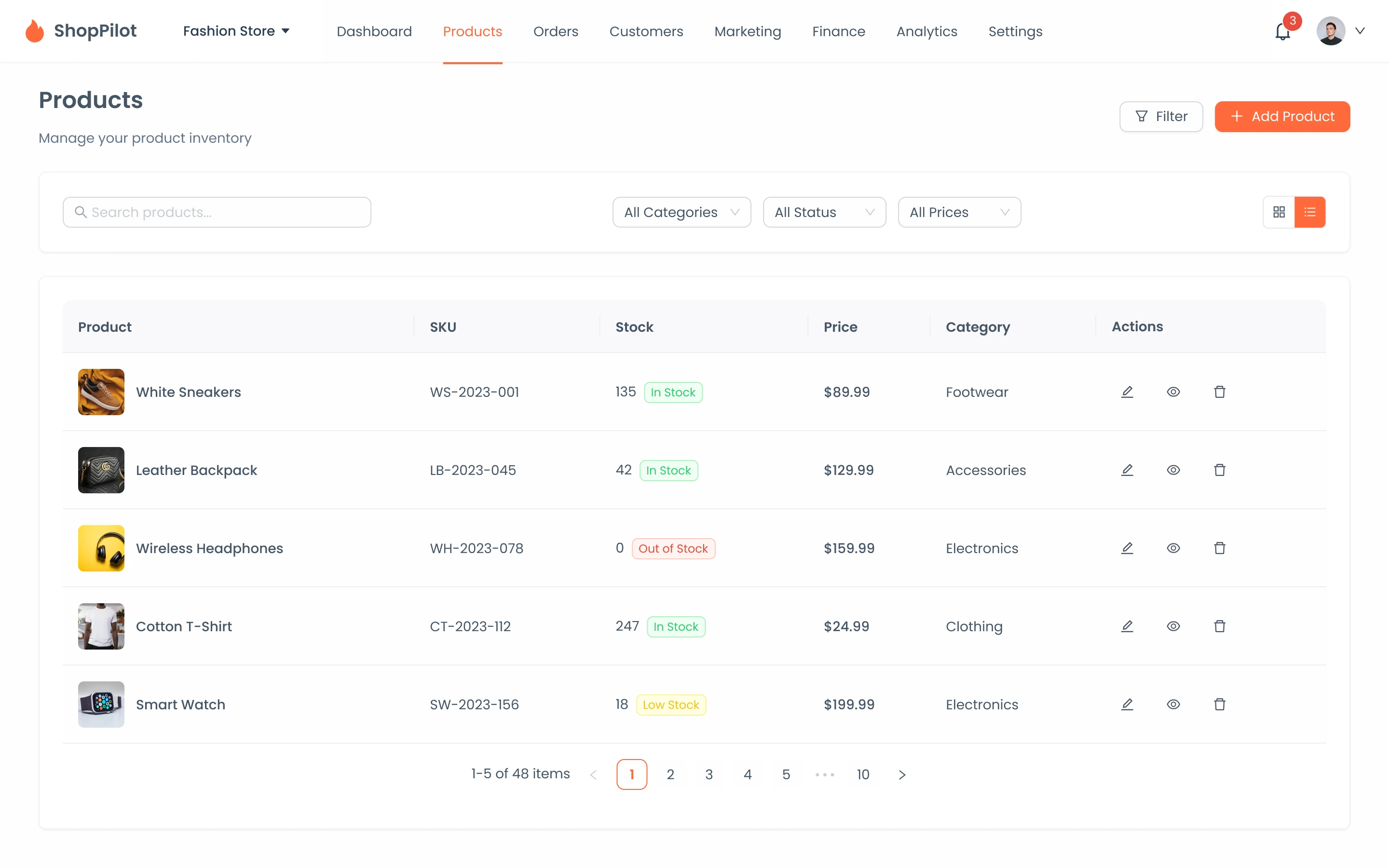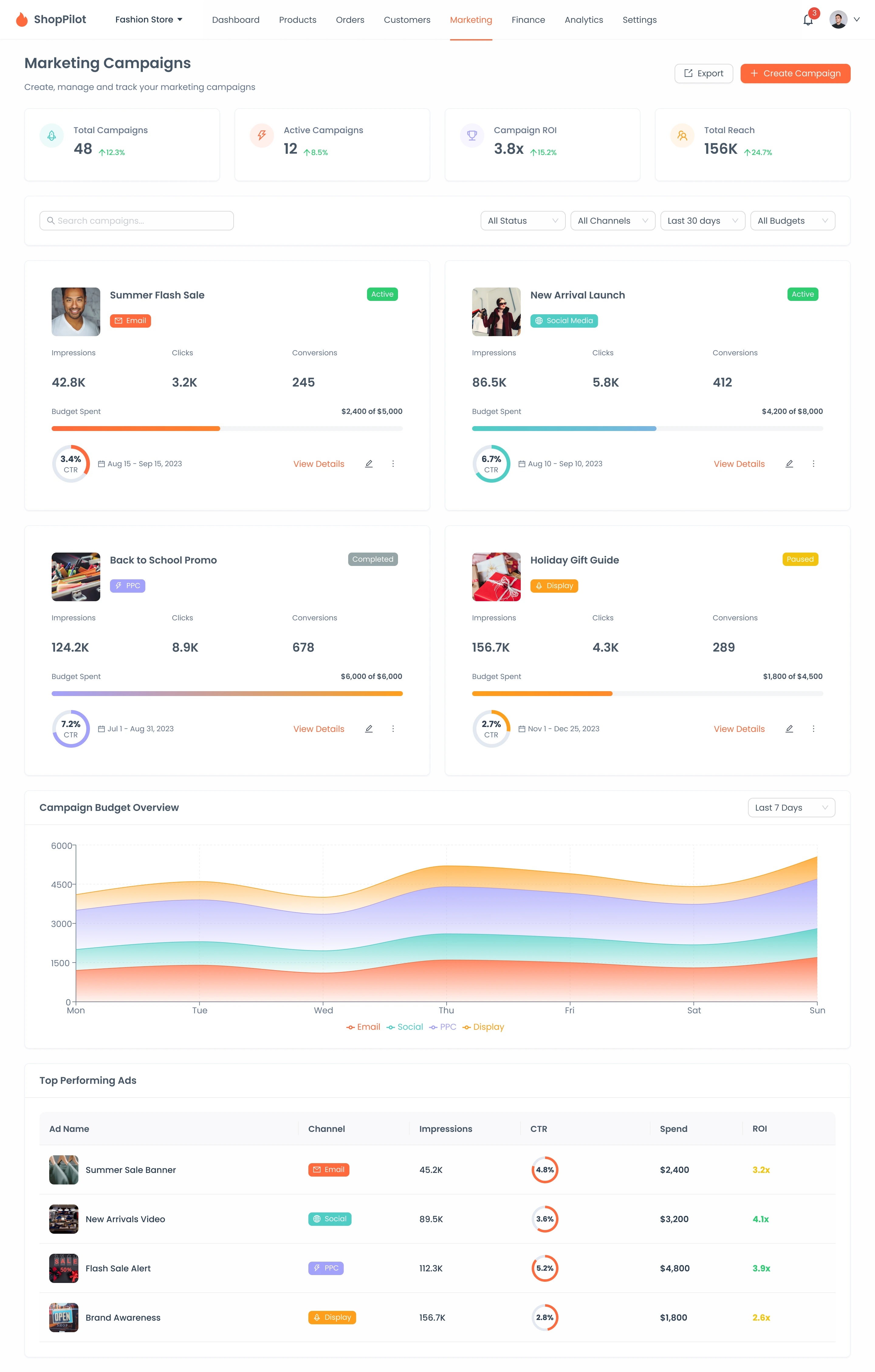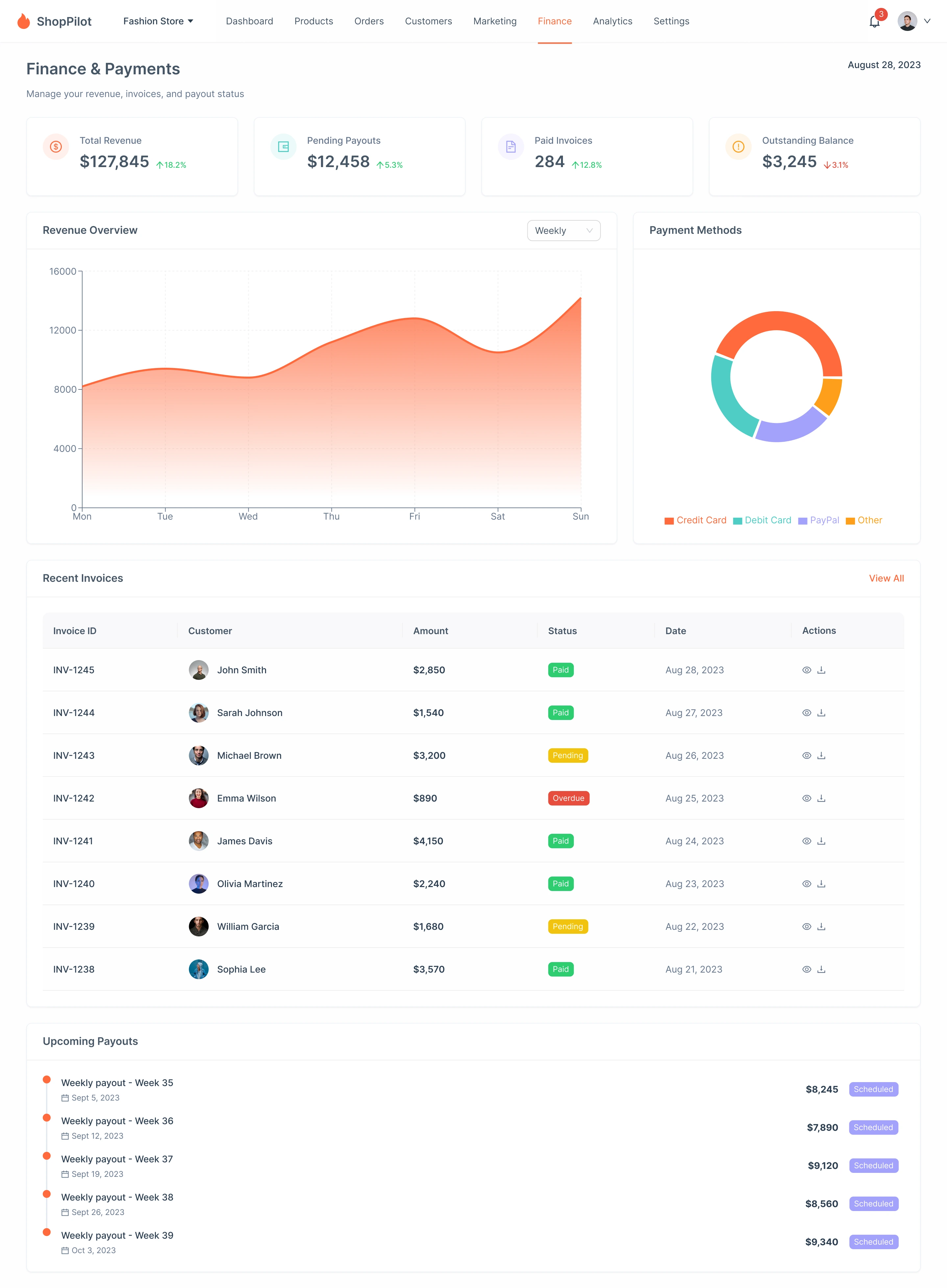 A Dashboard Overview Page for the web-based e-commerce management system called ShopPilot Admin.