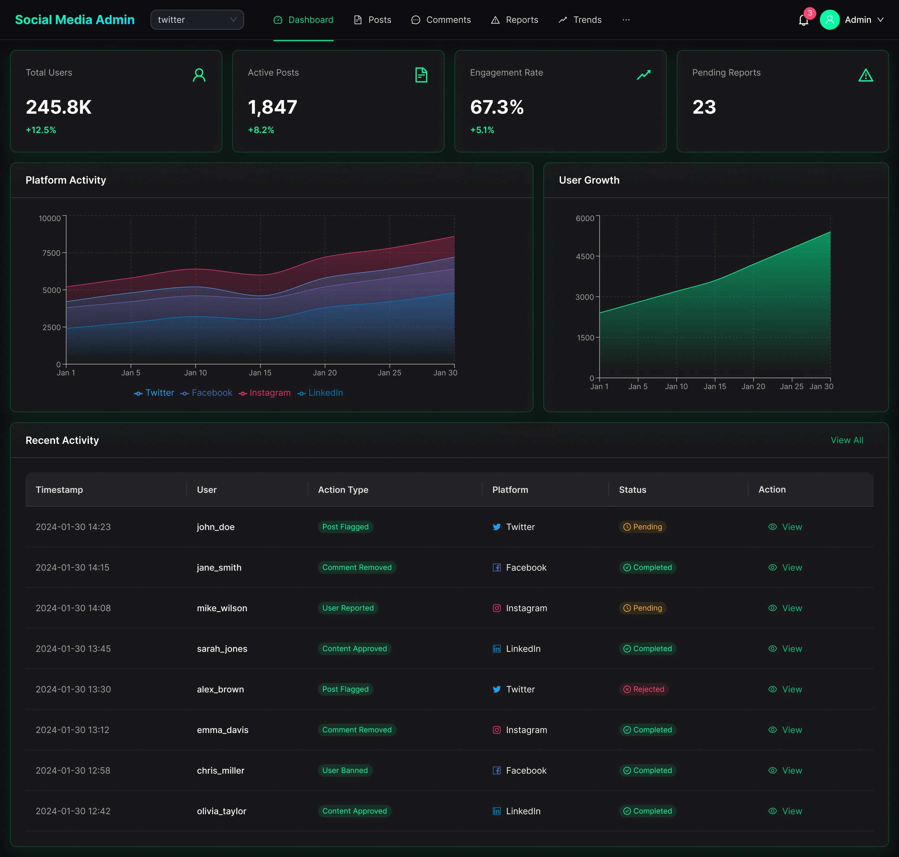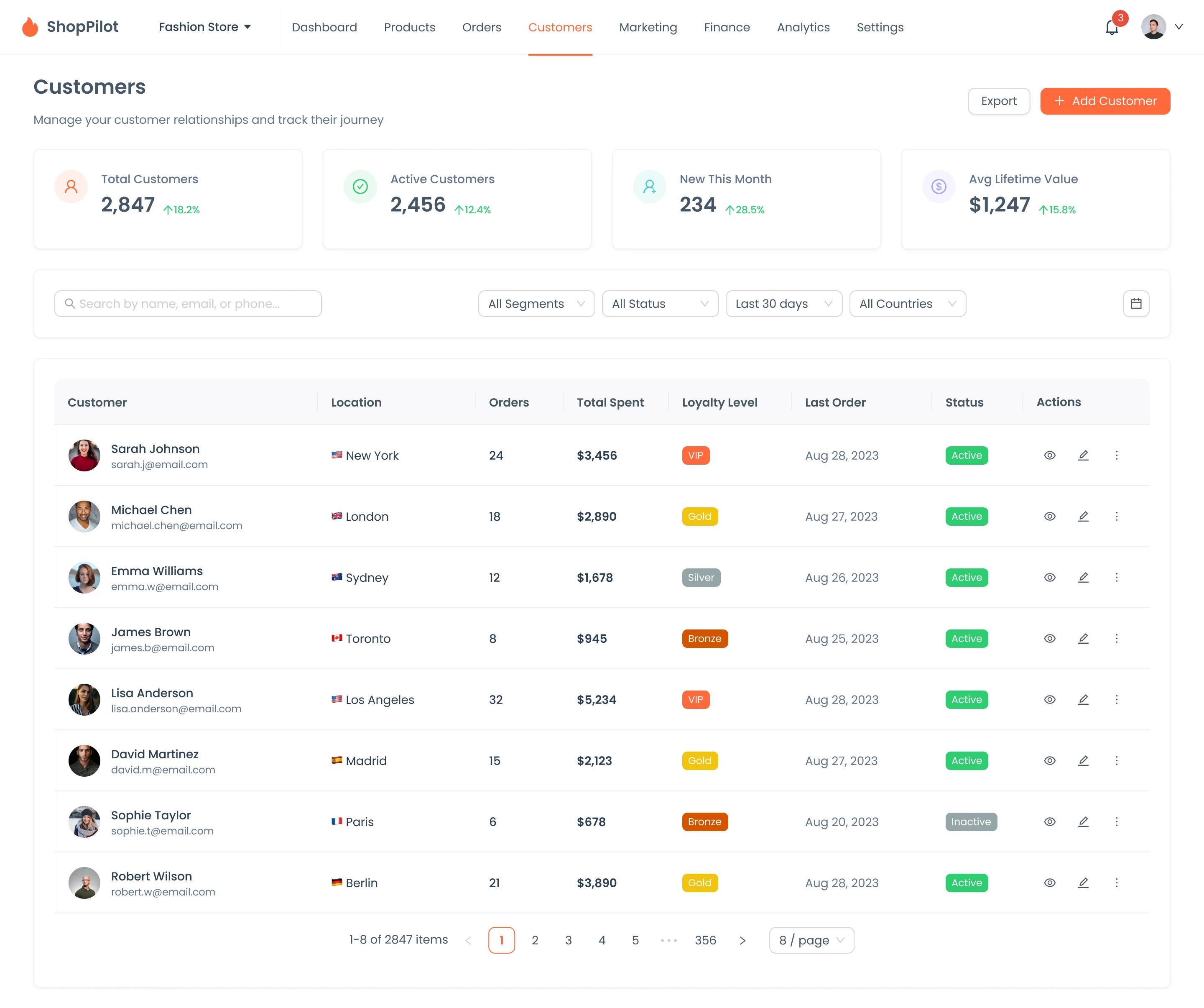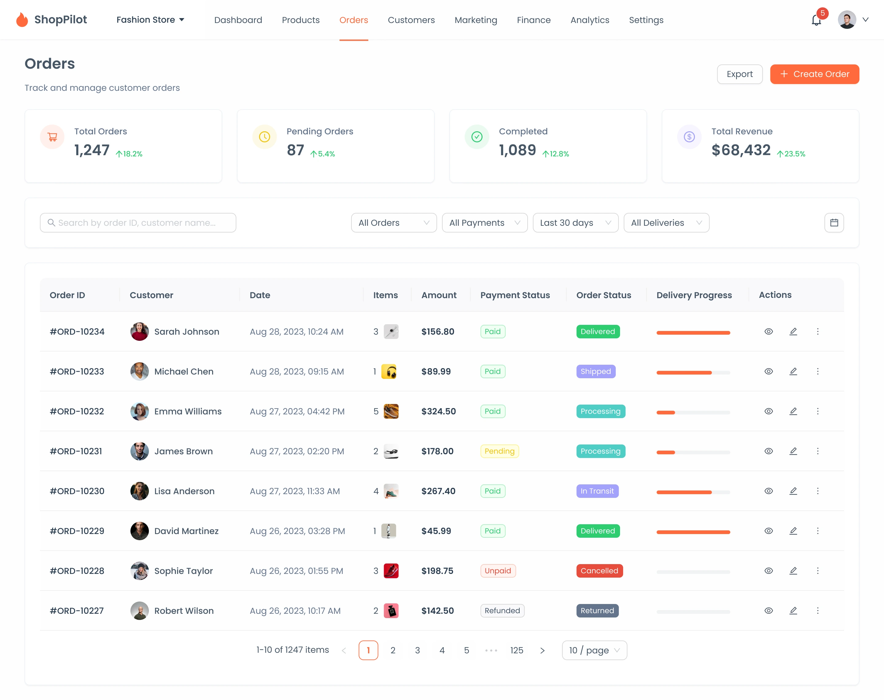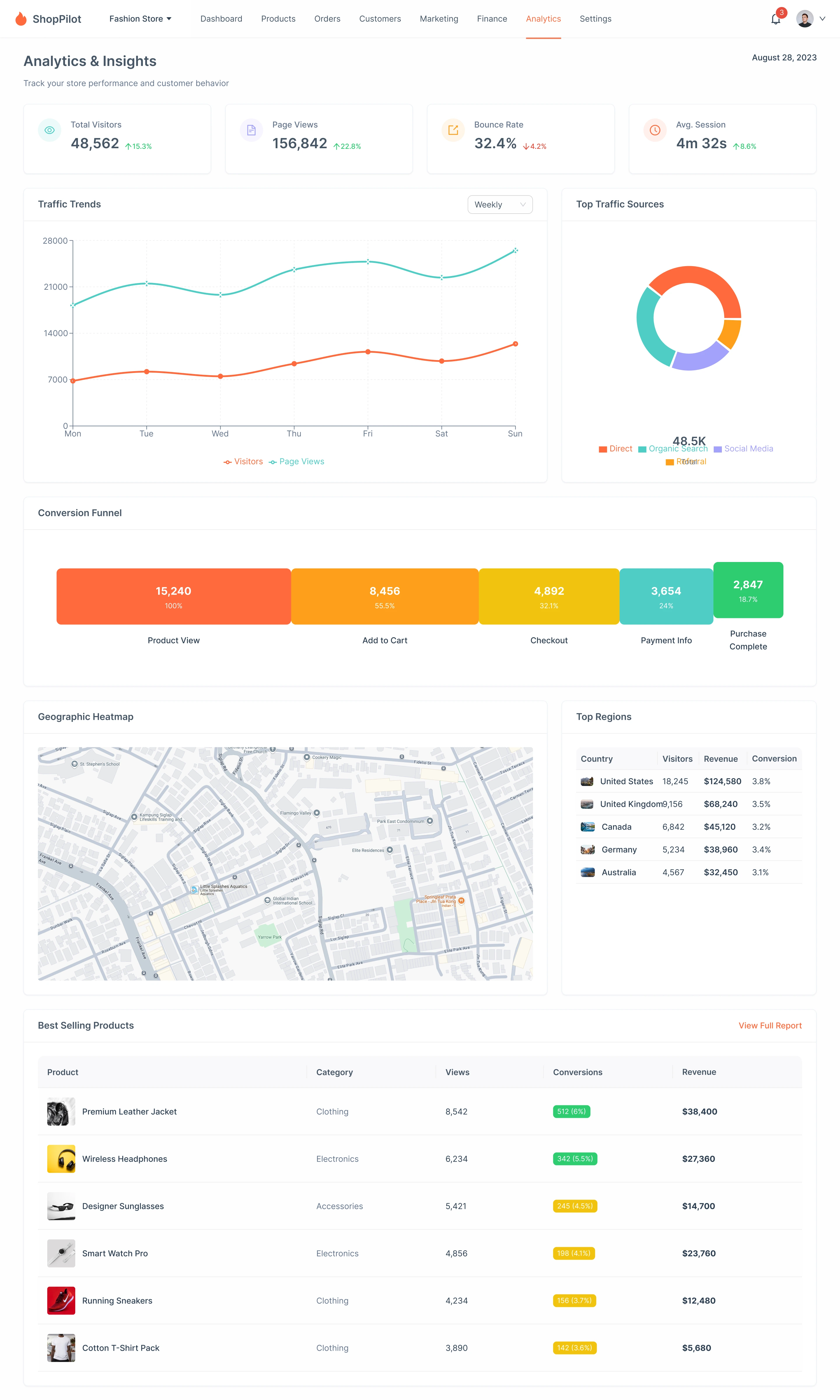 A Dashboard Overview Page for the web-based e-commerce management system called ShopPilot Admin.